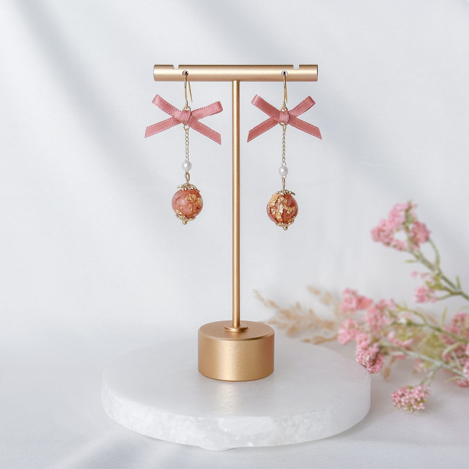 Pink floral bead earrings with small bow.