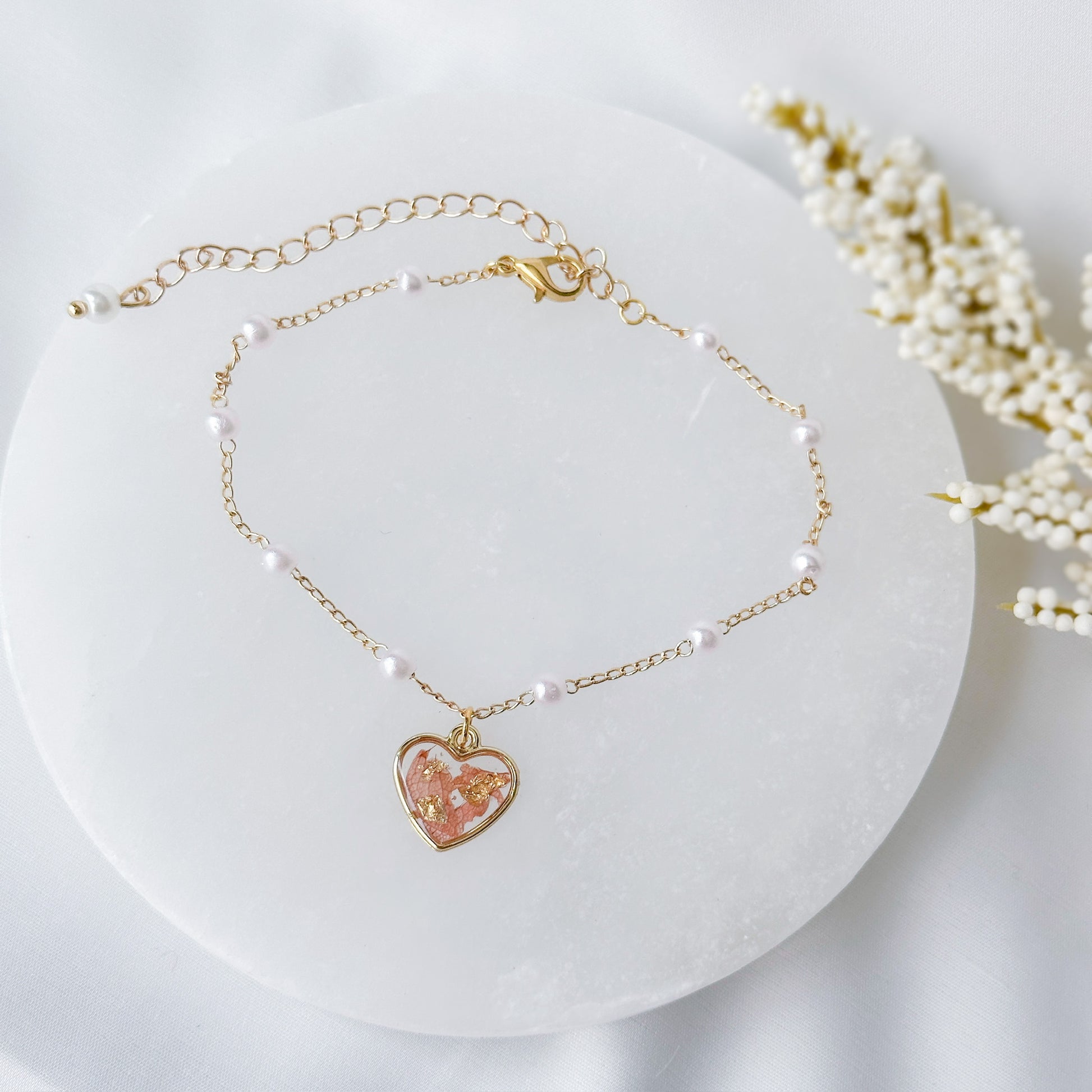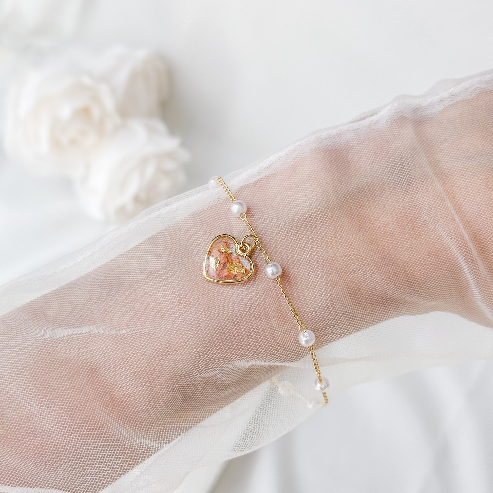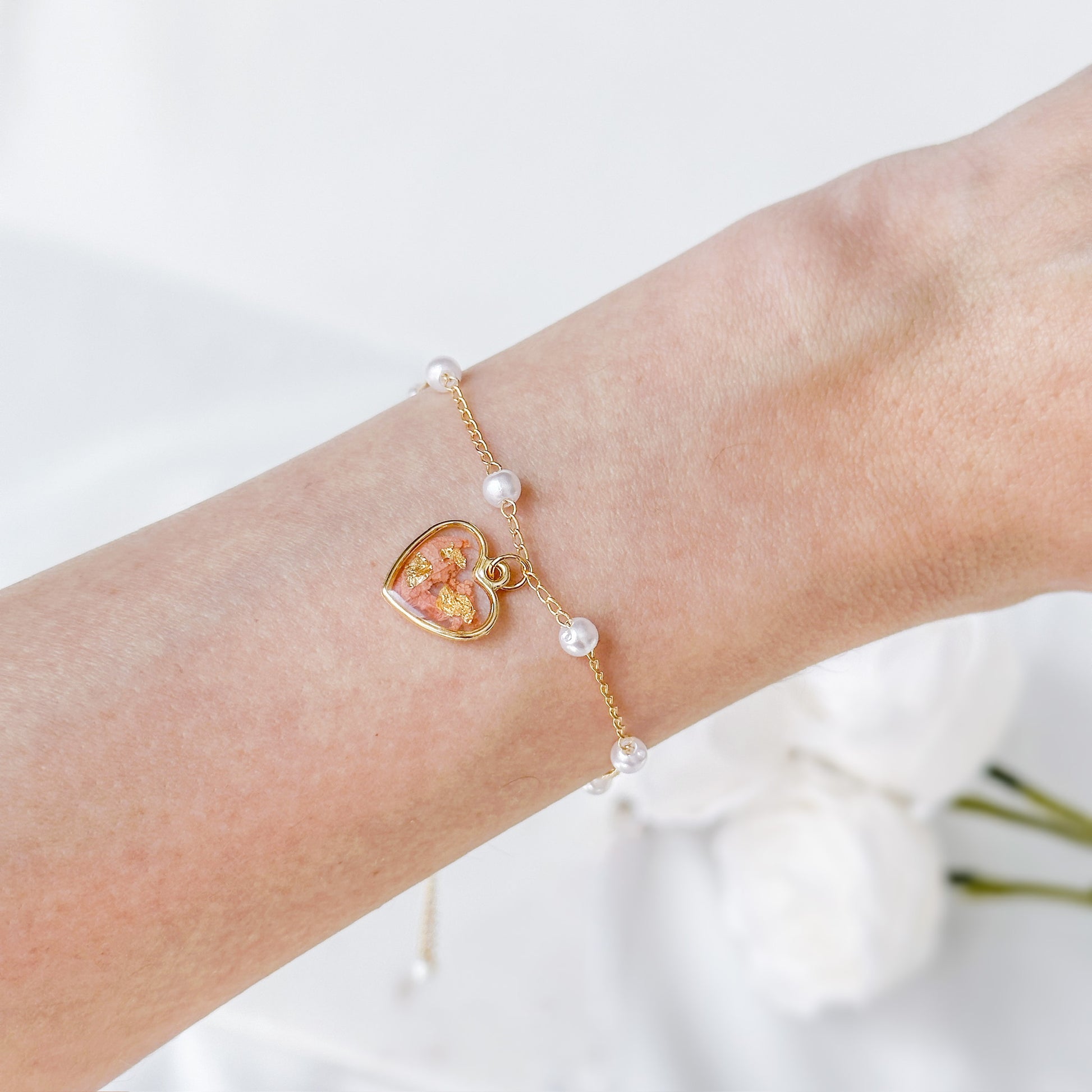Pearl bracelet with preserved floral peach charm.