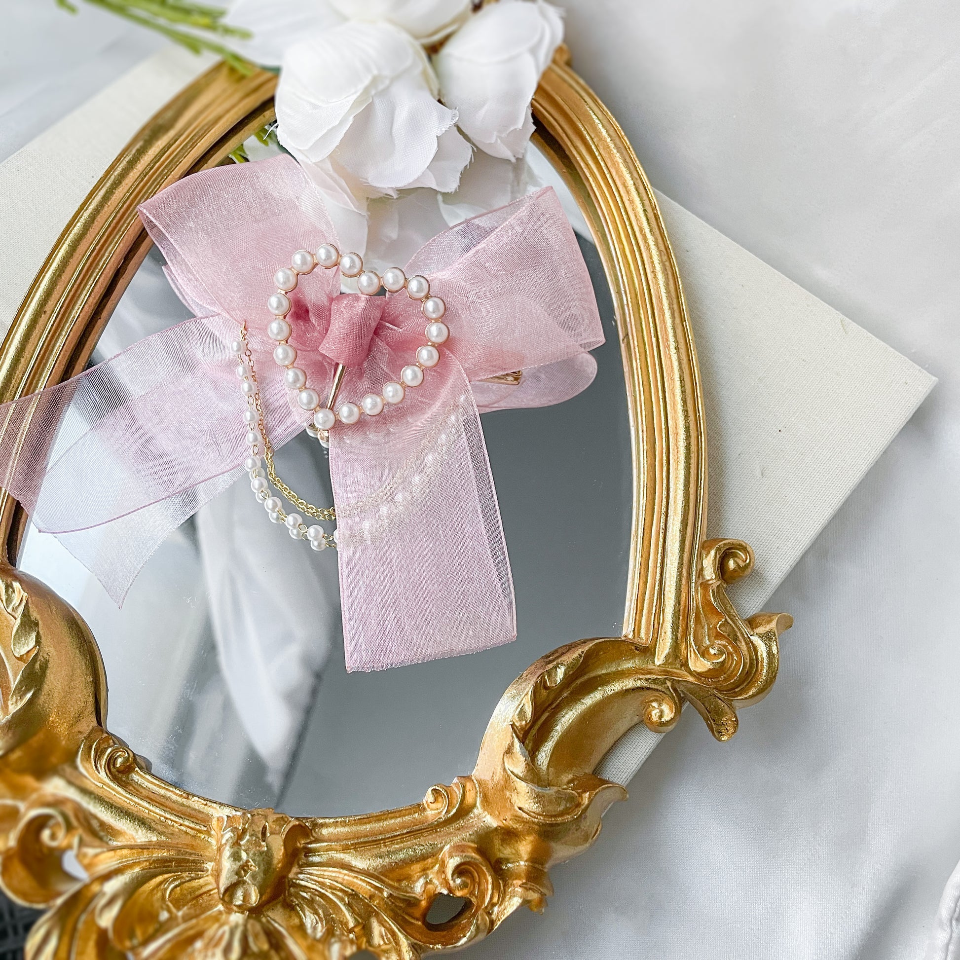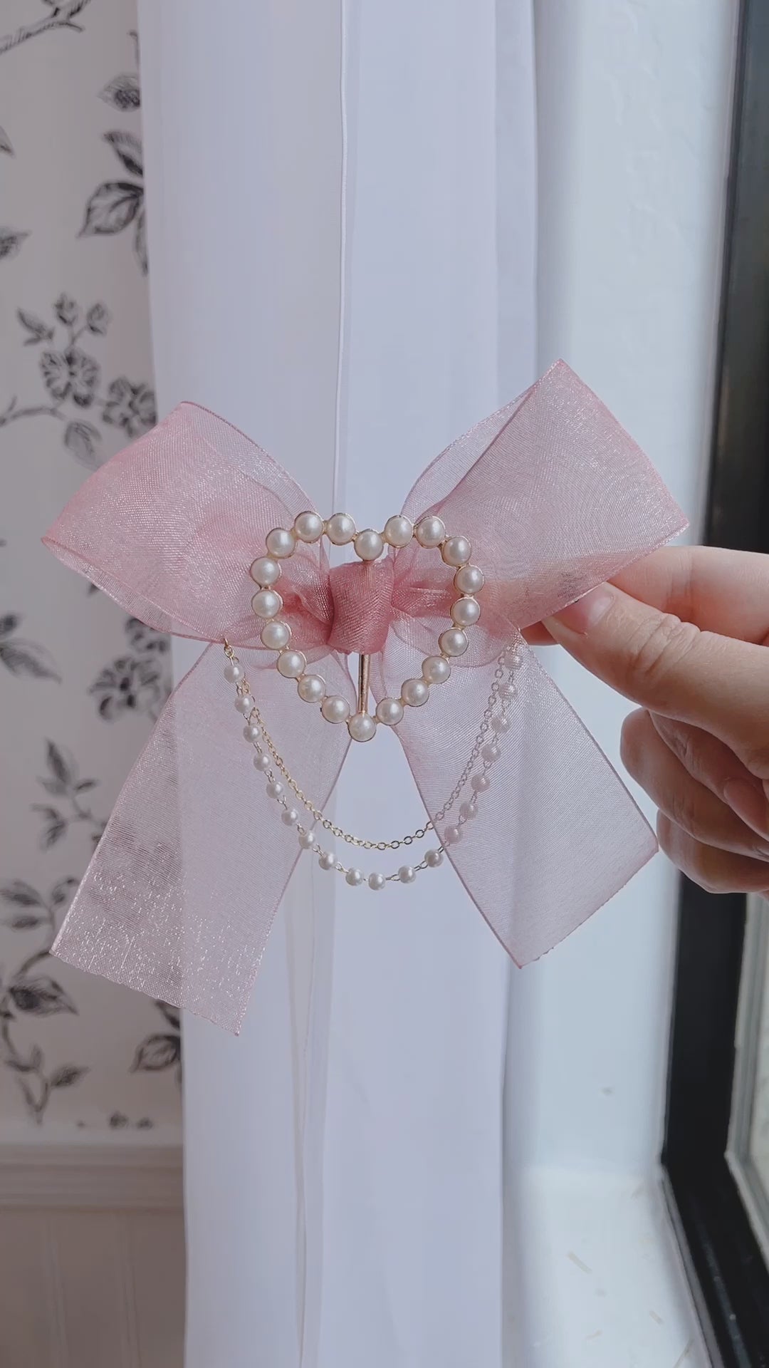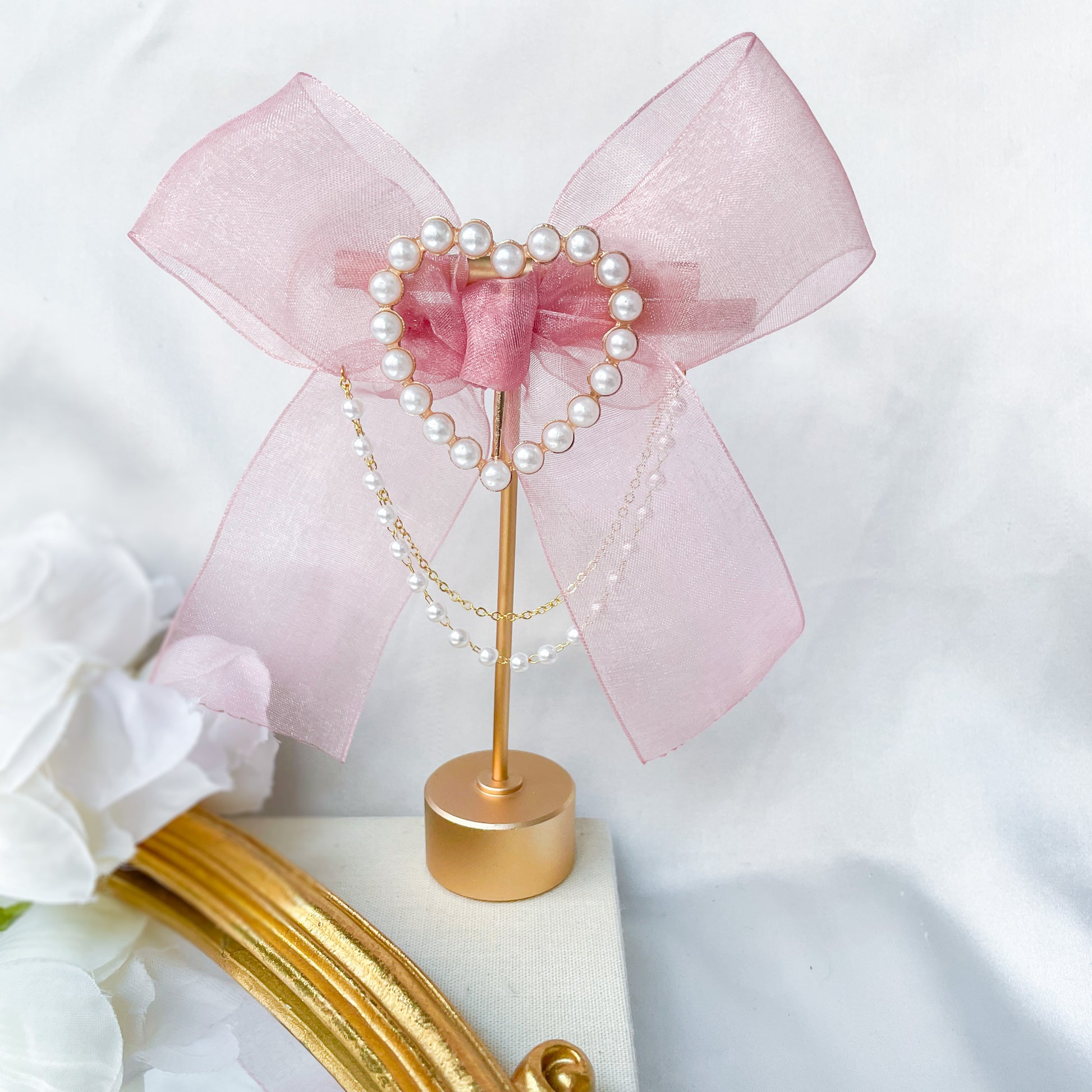 Pink sheer ribbon hair bow with accent pearl chain and heart pendant.