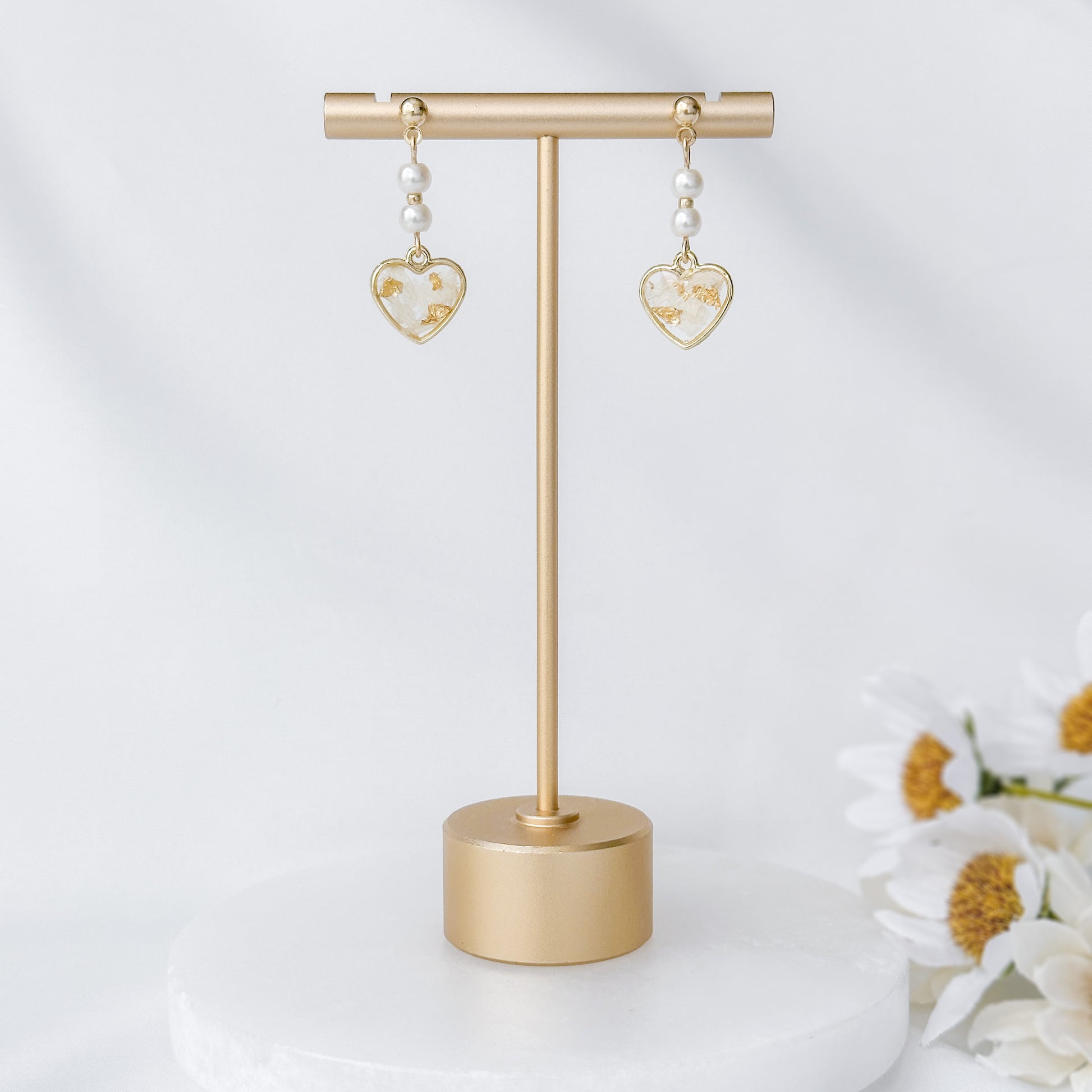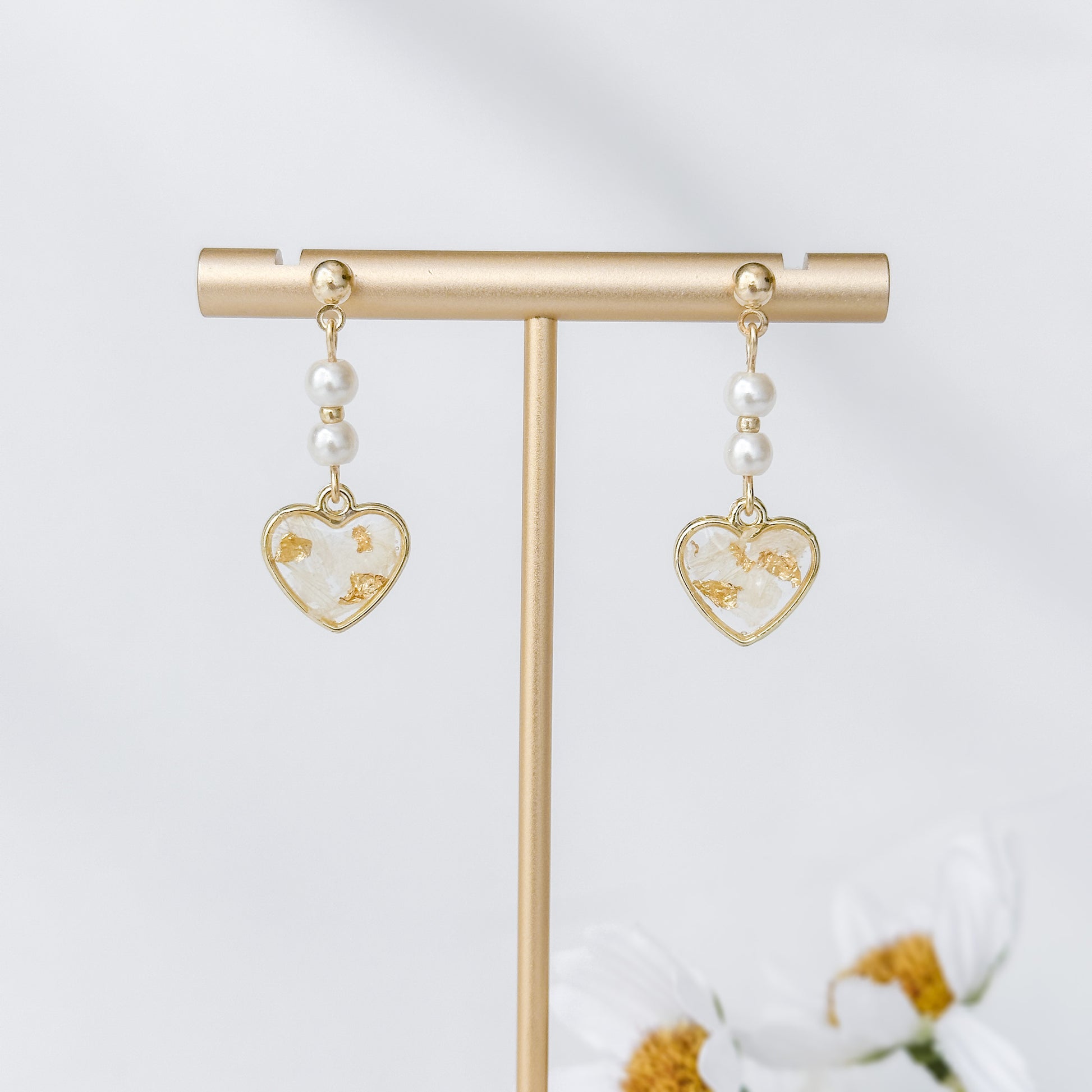 Heart dangle earrings with preserved white flowers.