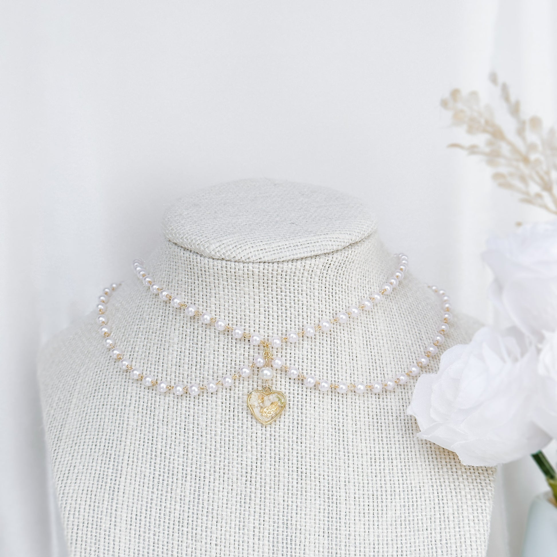 Pearl choker with preserved white flowers in heart charm.