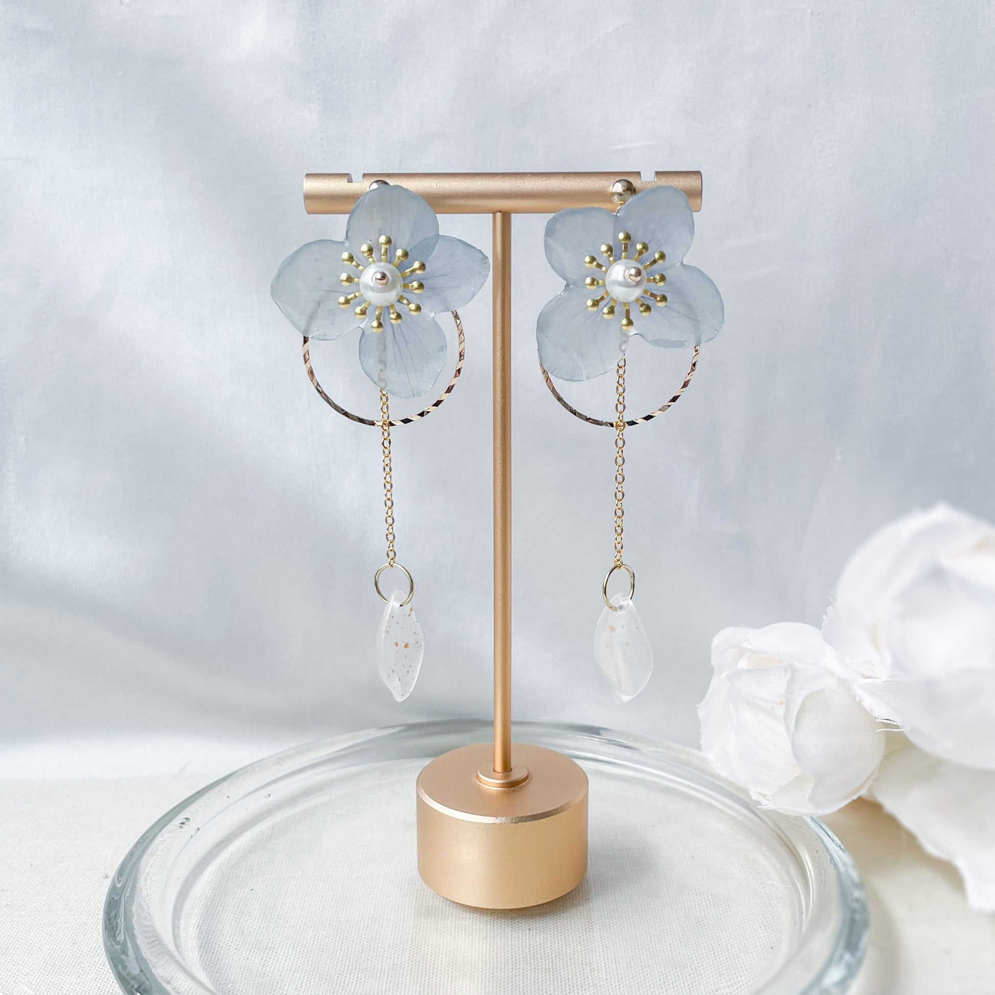 Blue hydrangea earrings with leaf charm.
