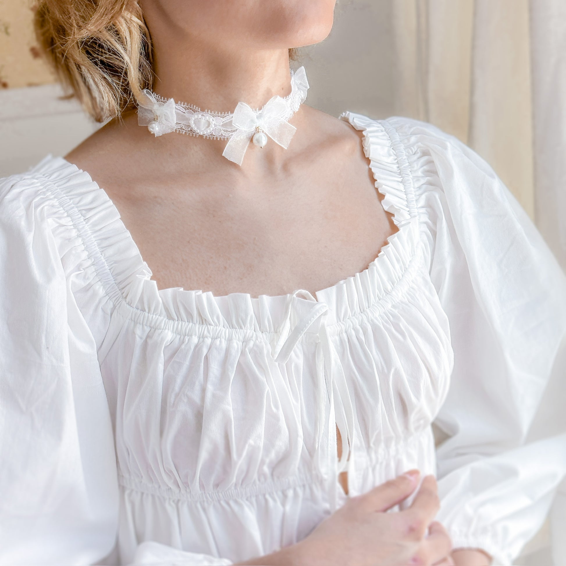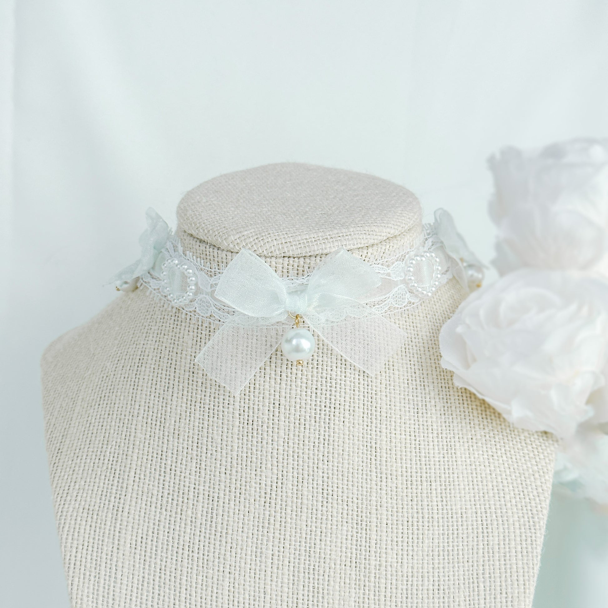 Lace choker with sheer blue ribbon and pearl hearts.