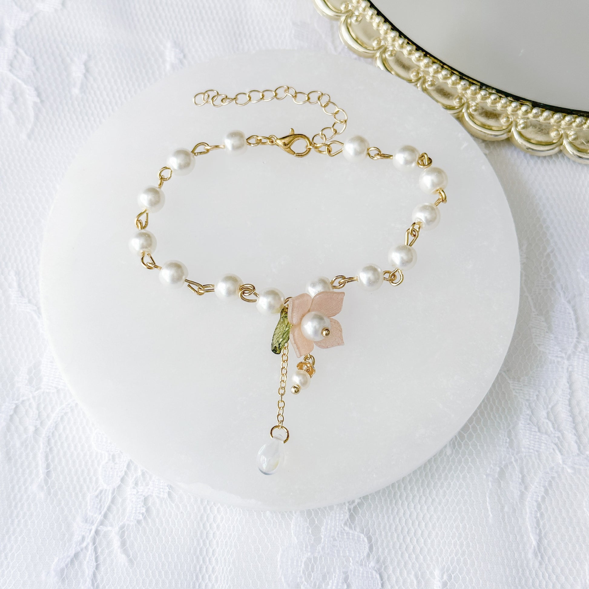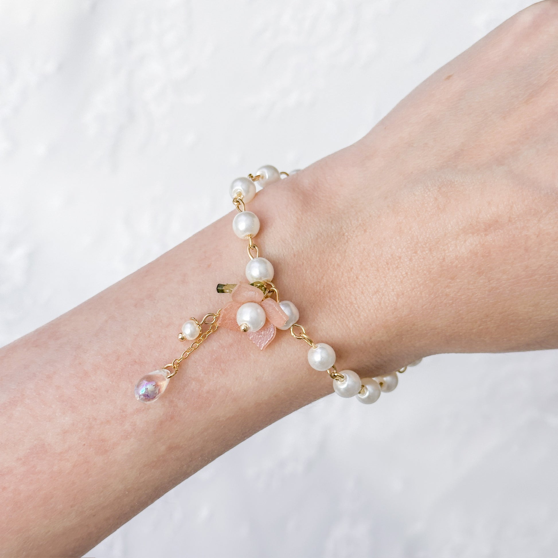 Pink flower bead pearl bracelet.