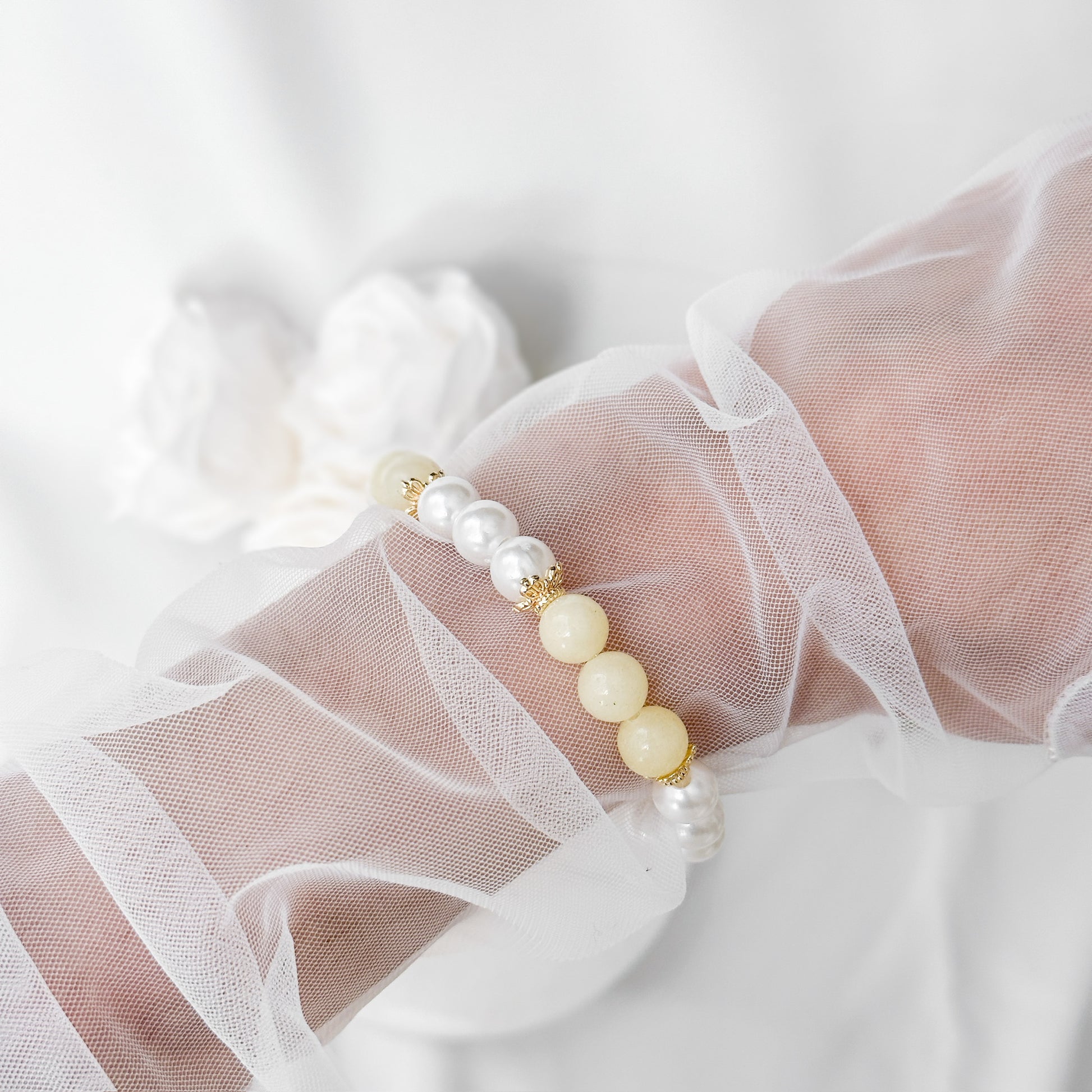Stretchy bead and pearl bracelet.