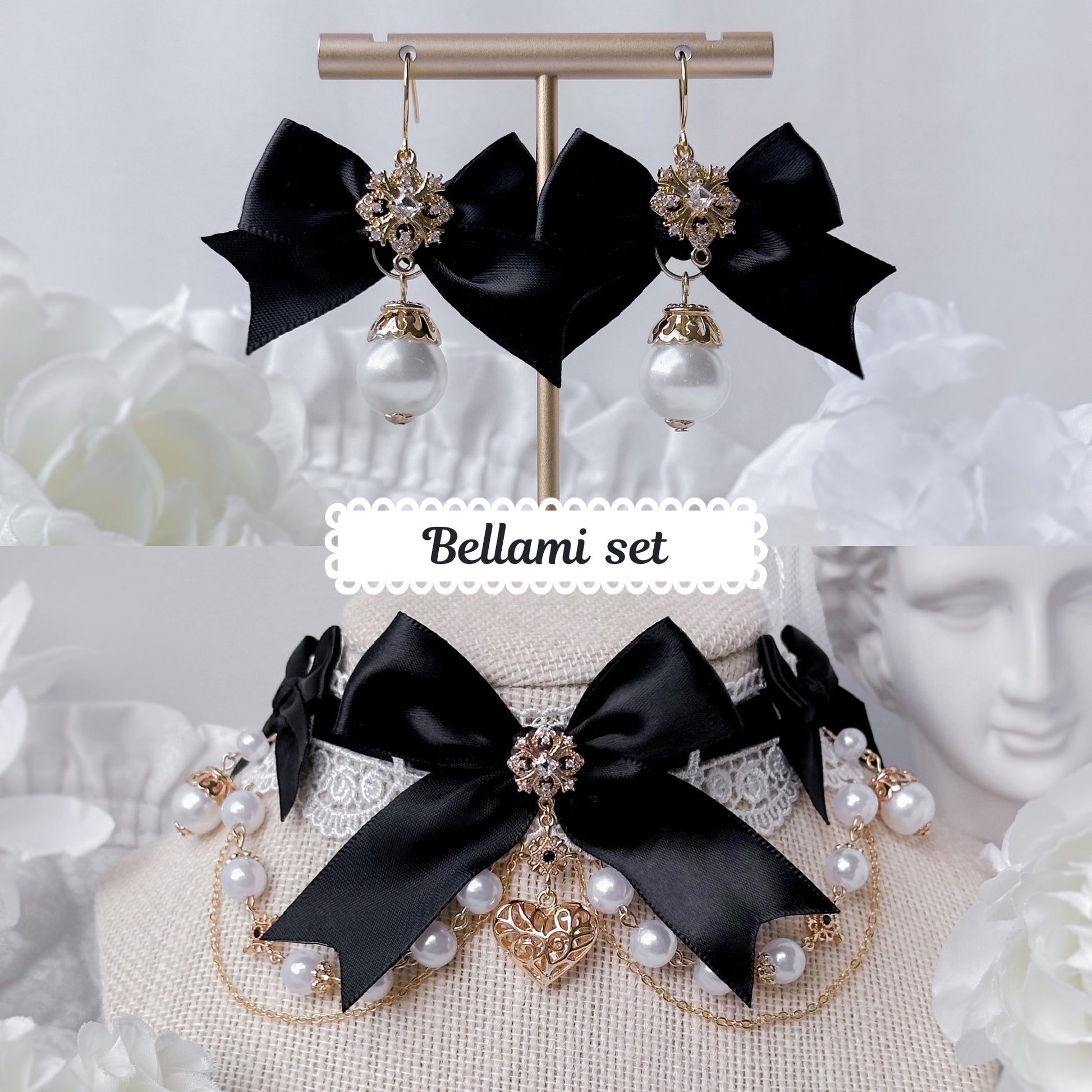 Matching black satin choker and earrings.