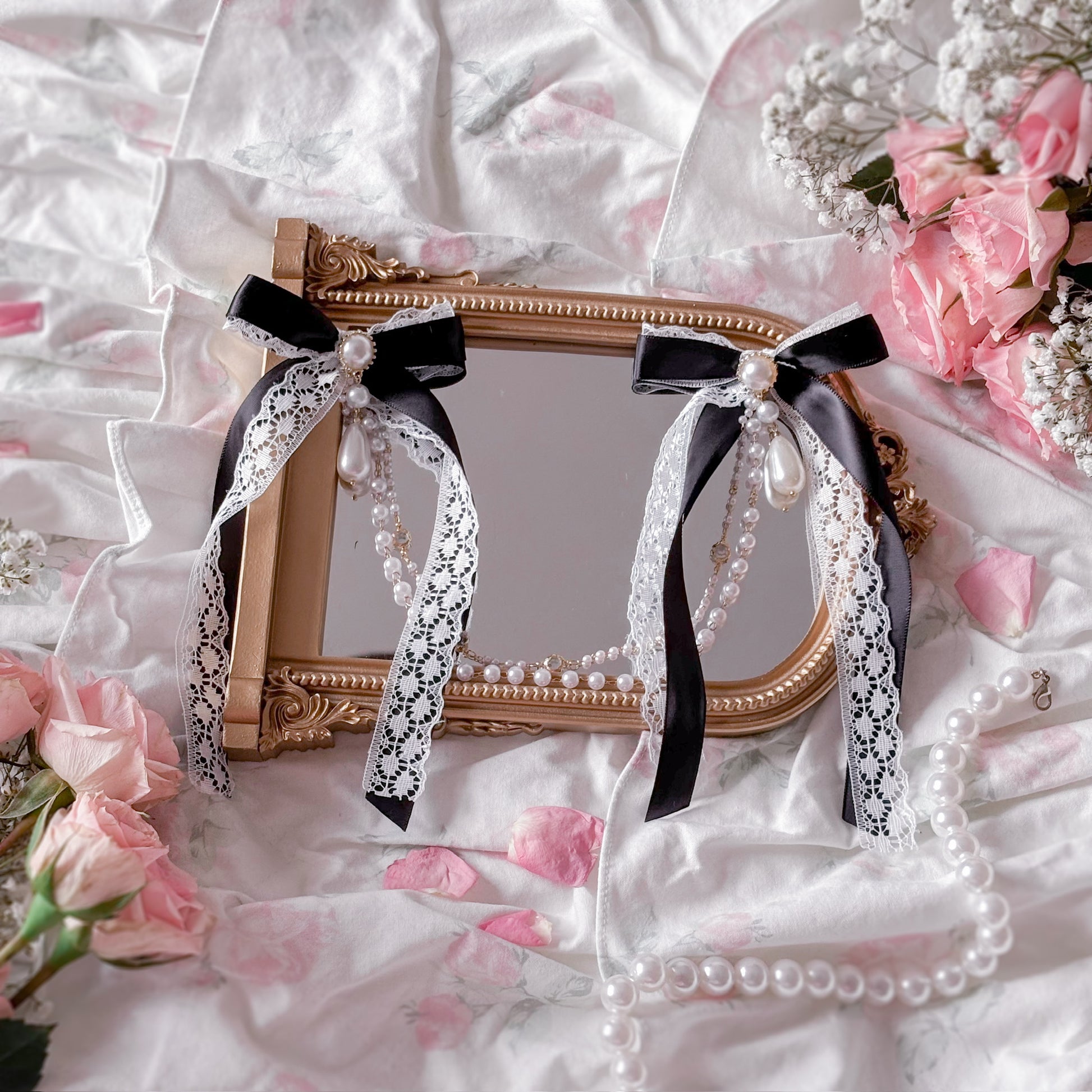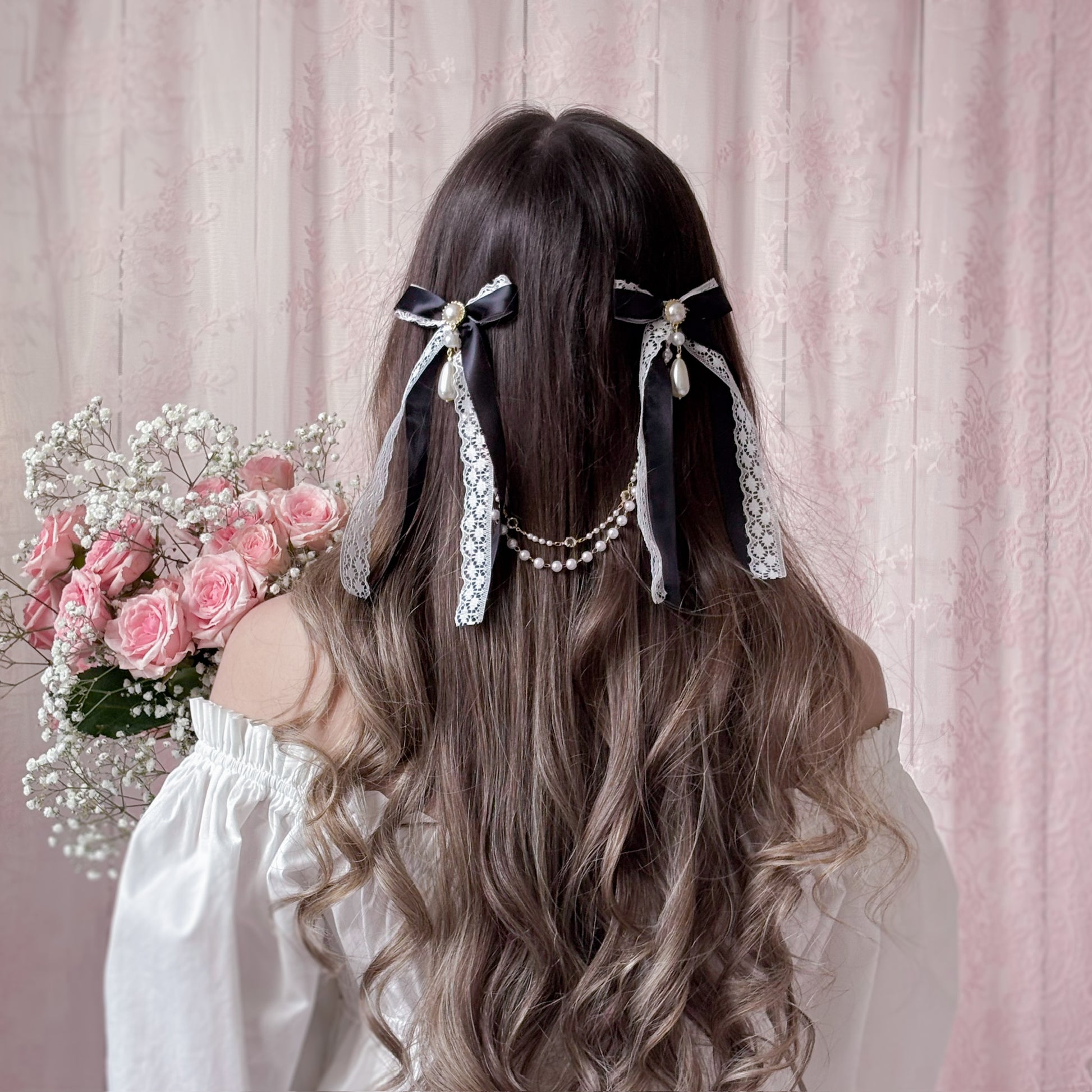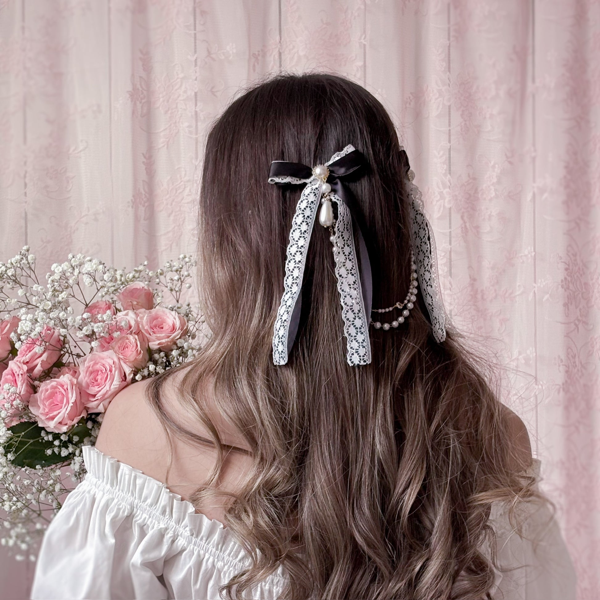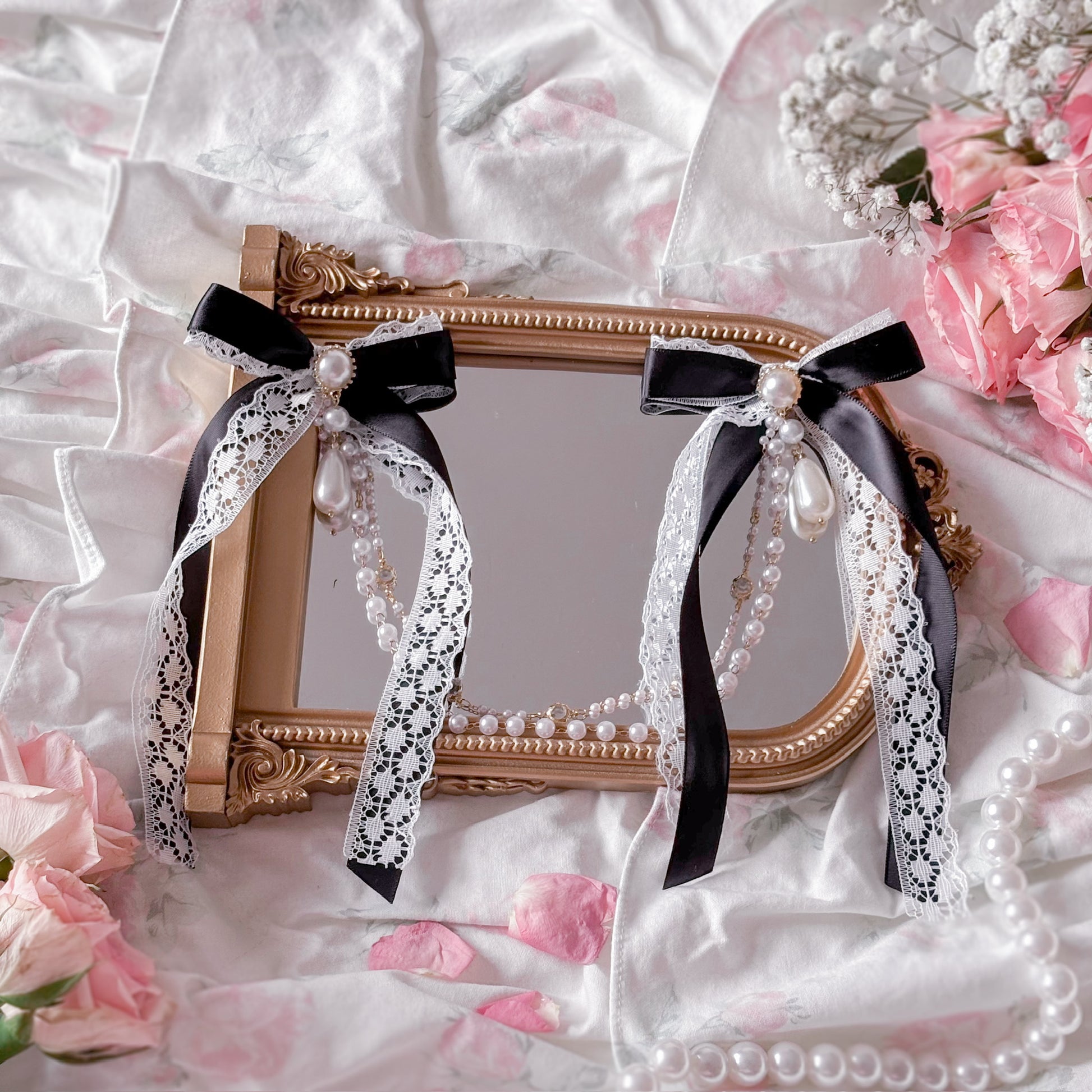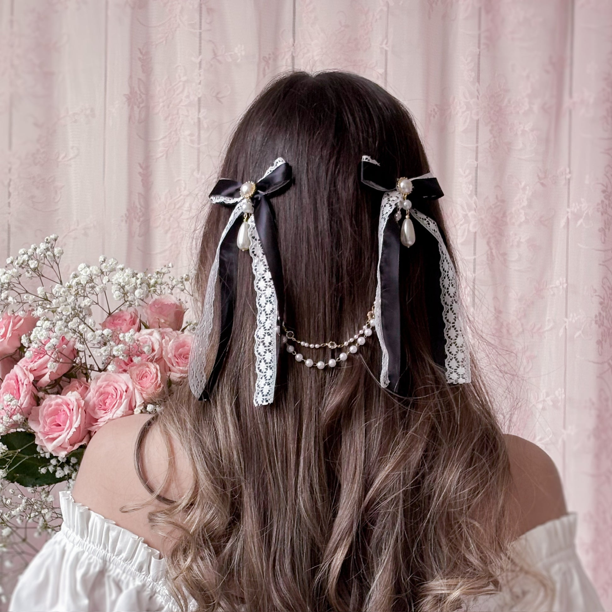 Black satin hair bow with lace and chain/pearl accents.