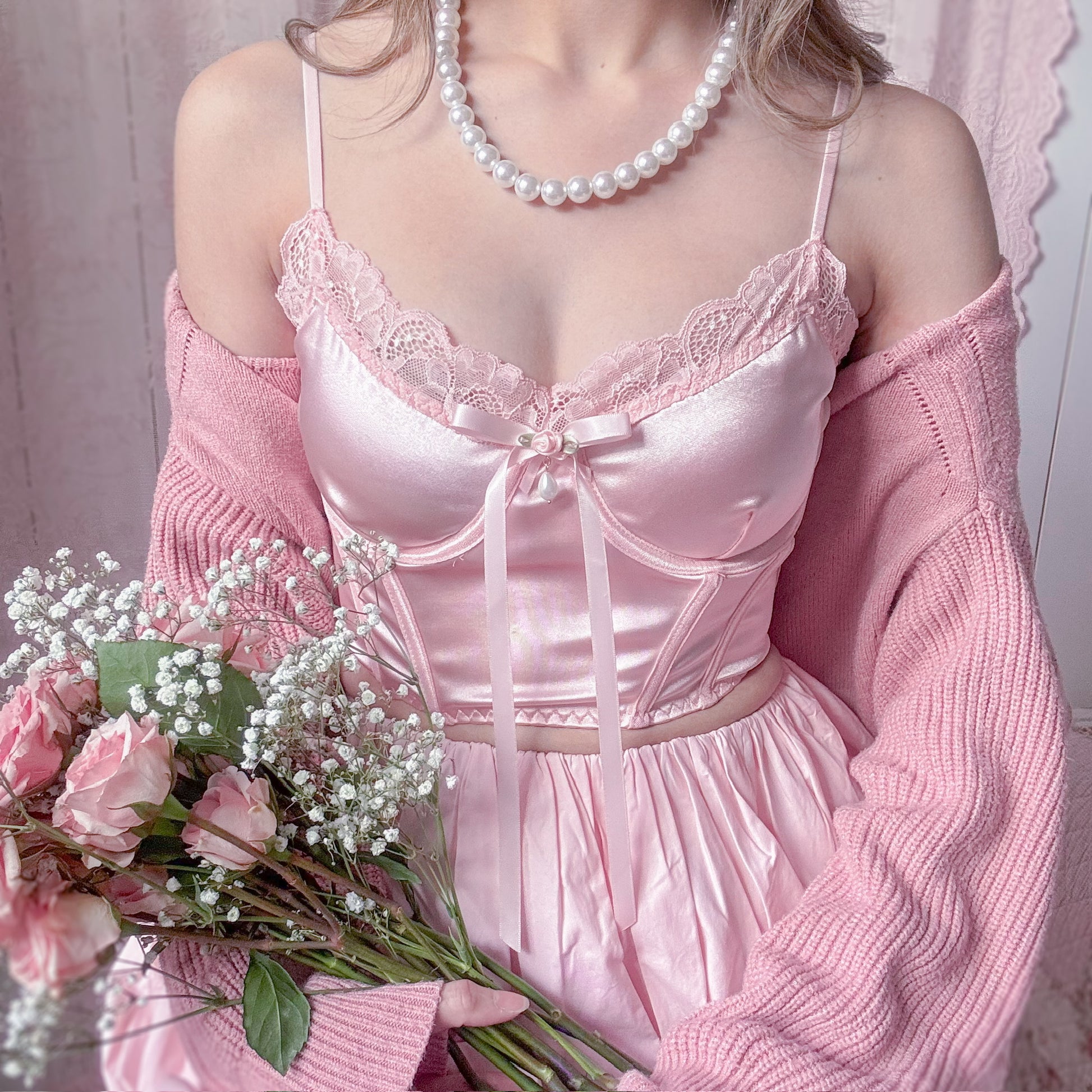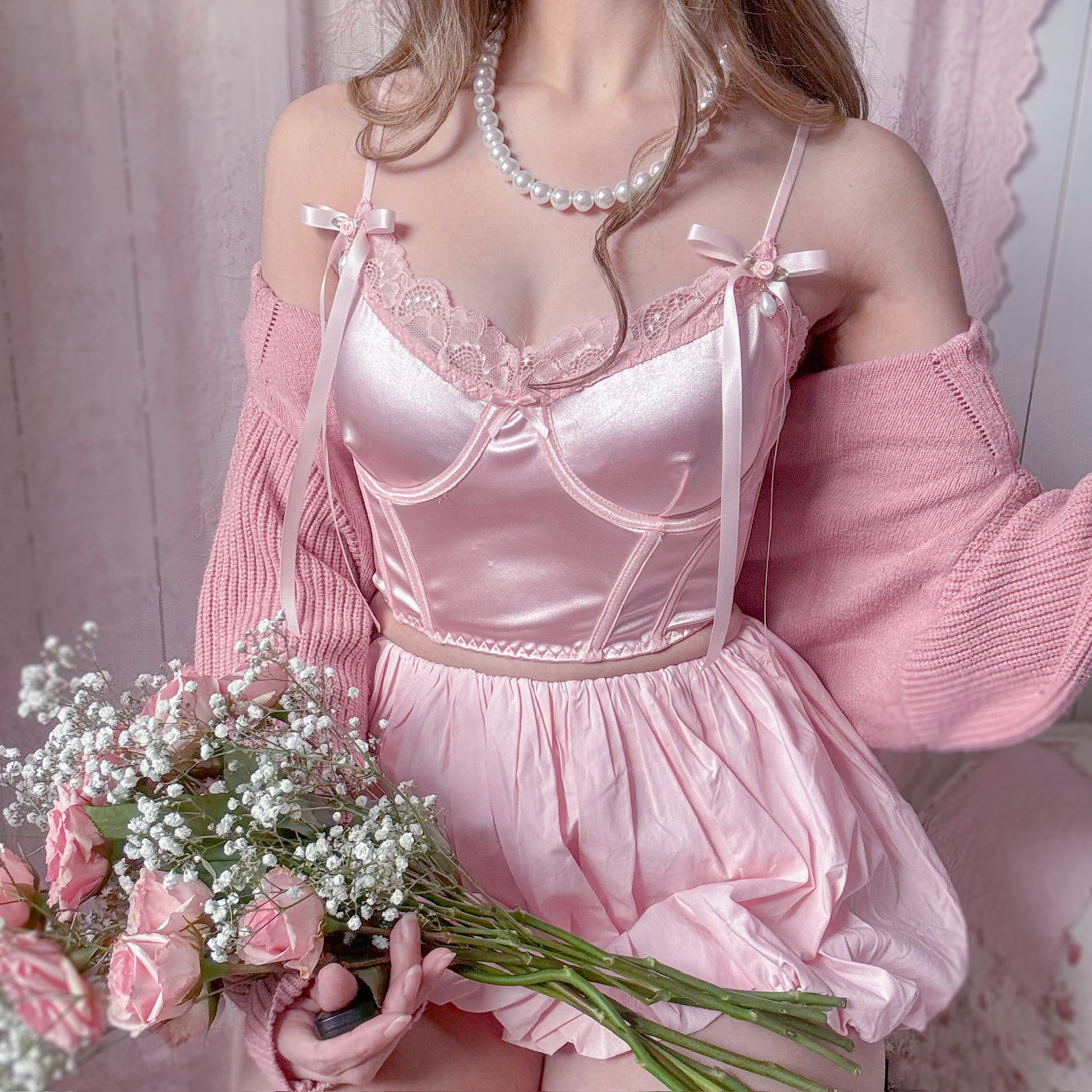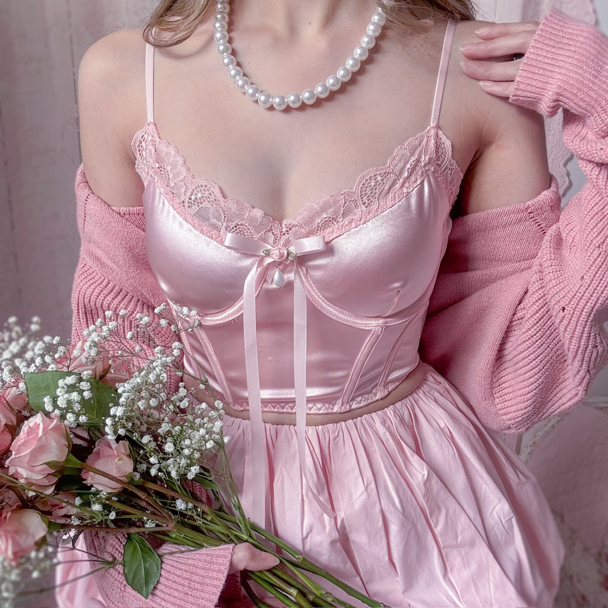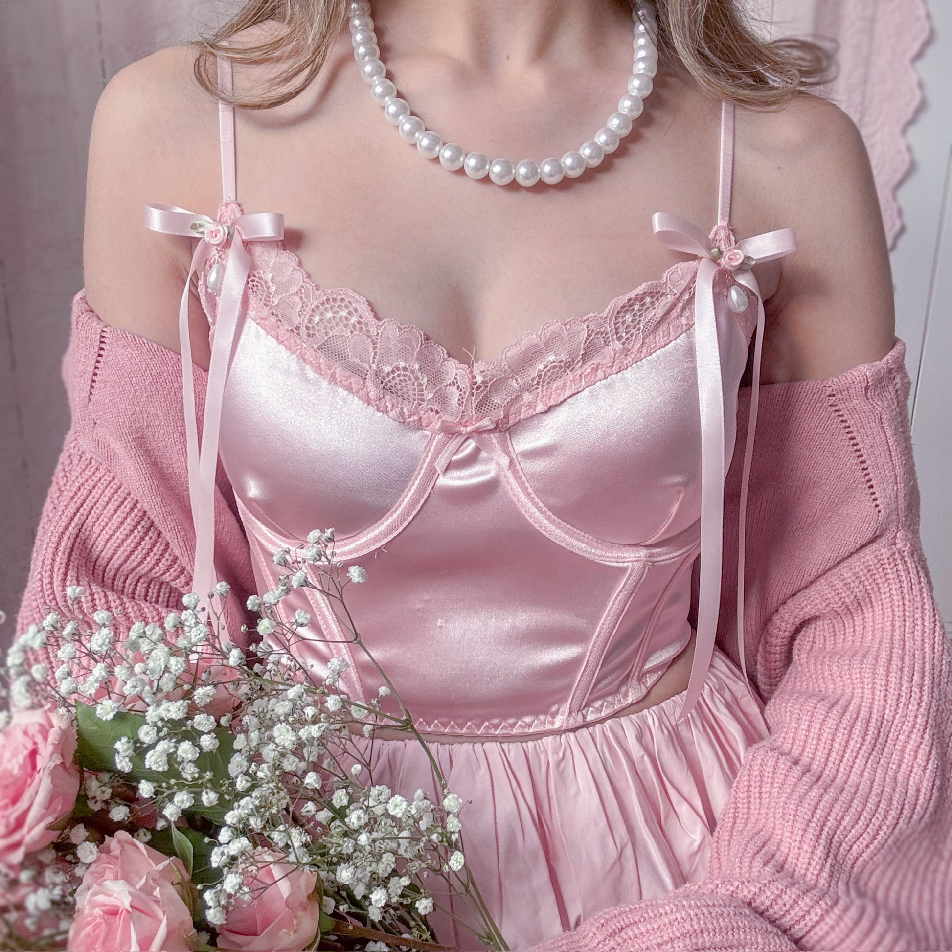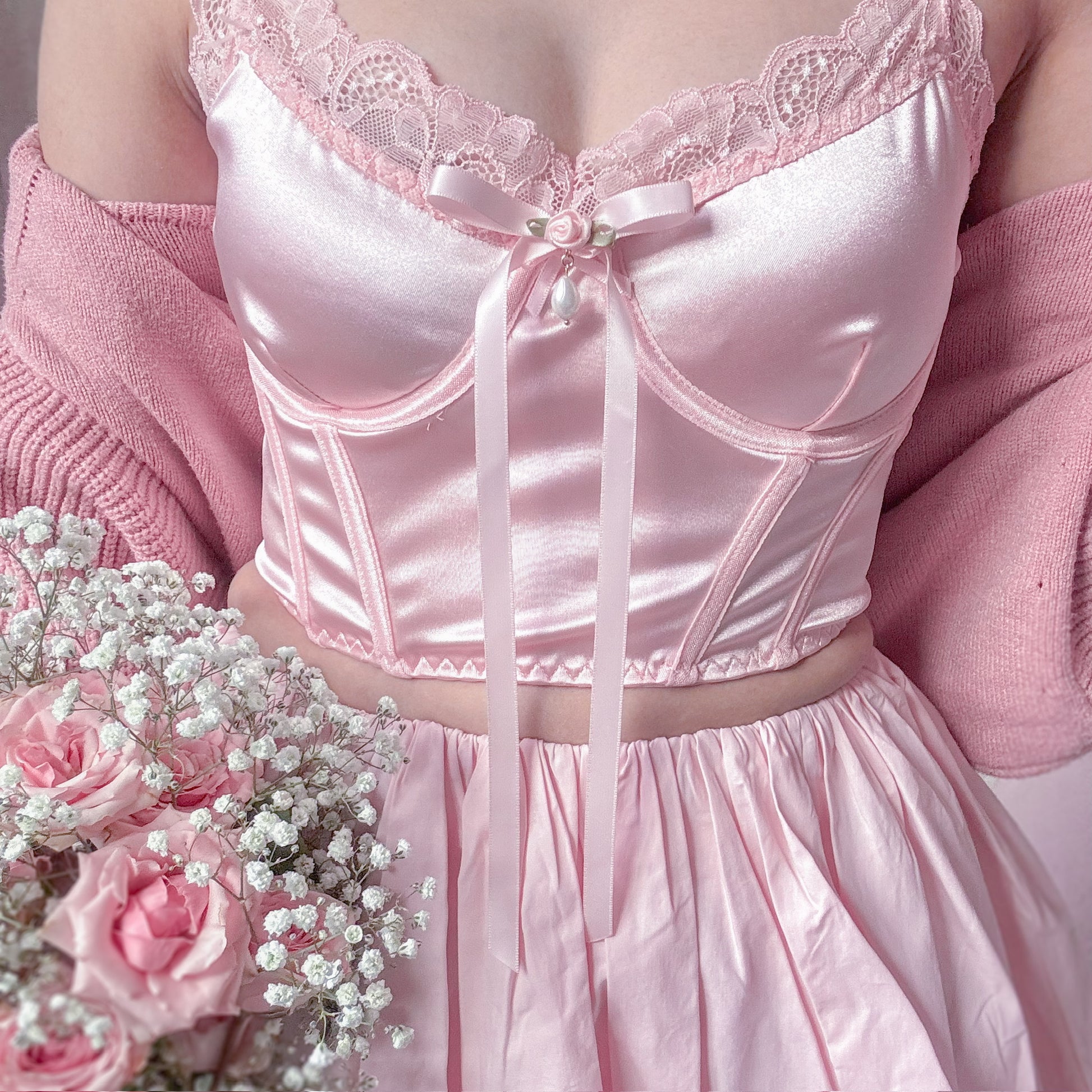 Pink satin bow pins with decorative pearls. Can be pinned on the bust, the waist, etc.