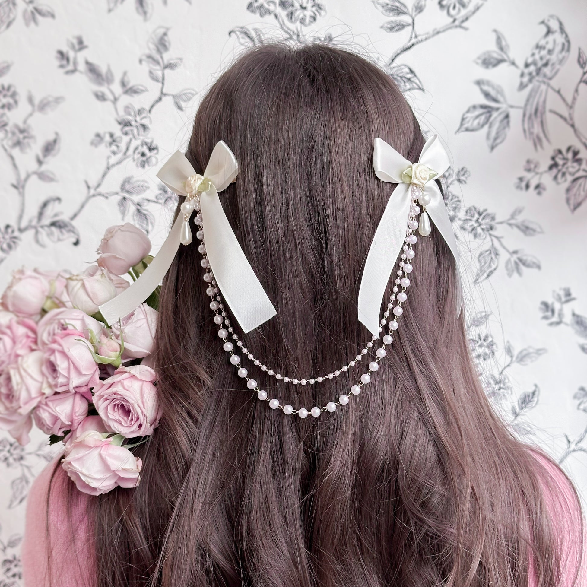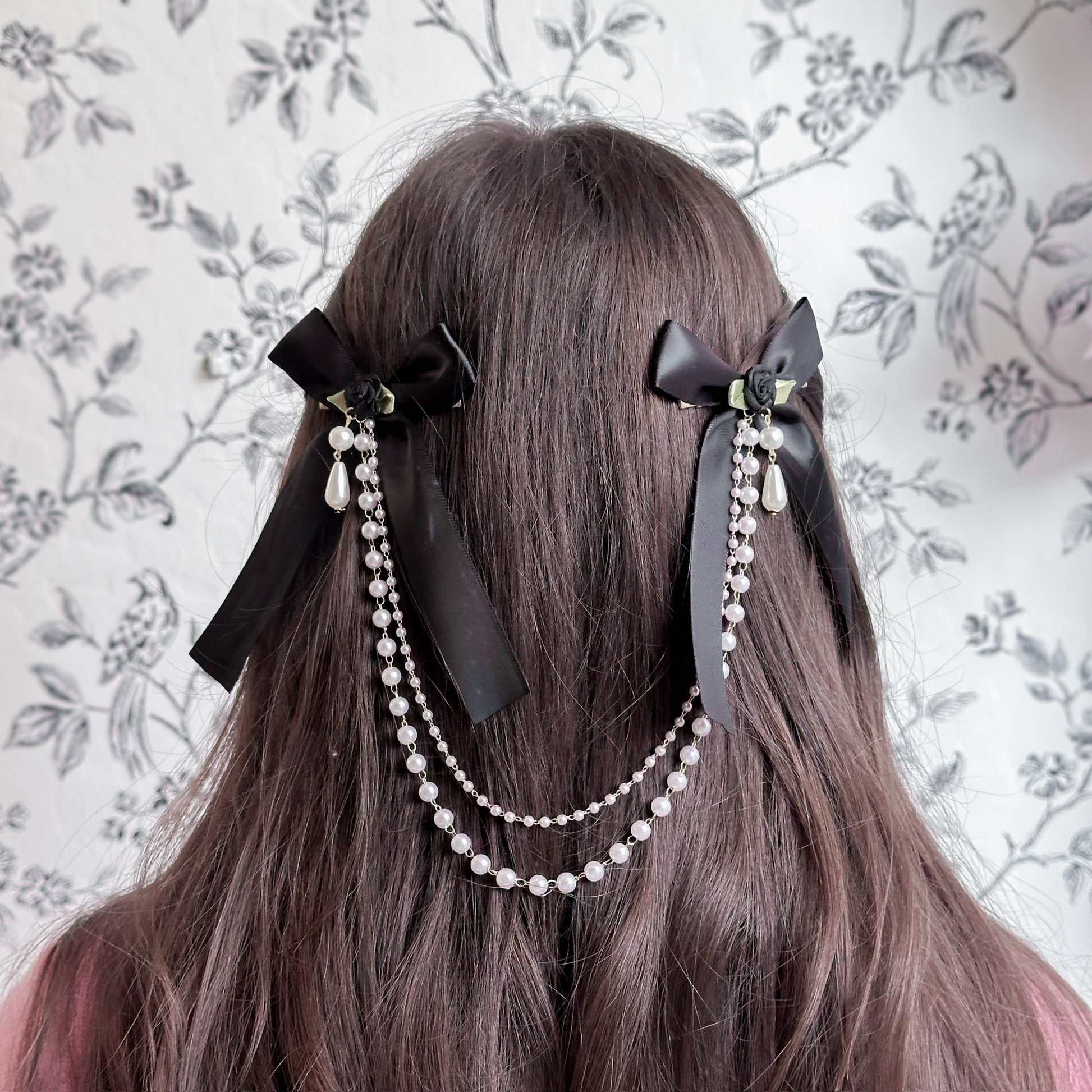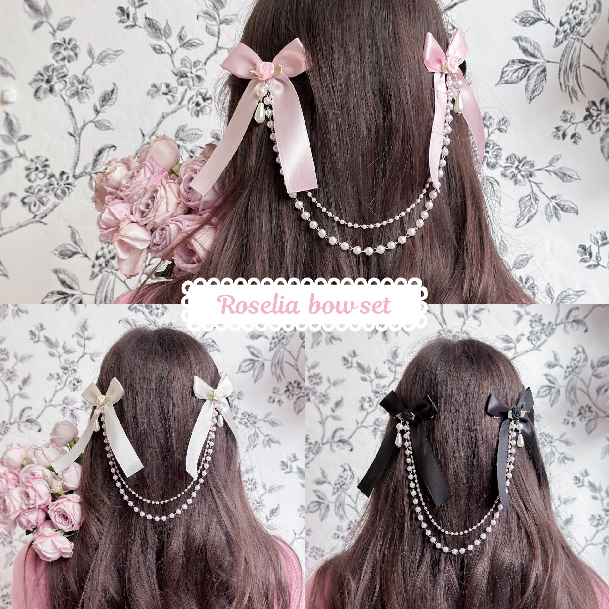 Set of three (black, creme, pink) satin hair bows with pearl chain.
