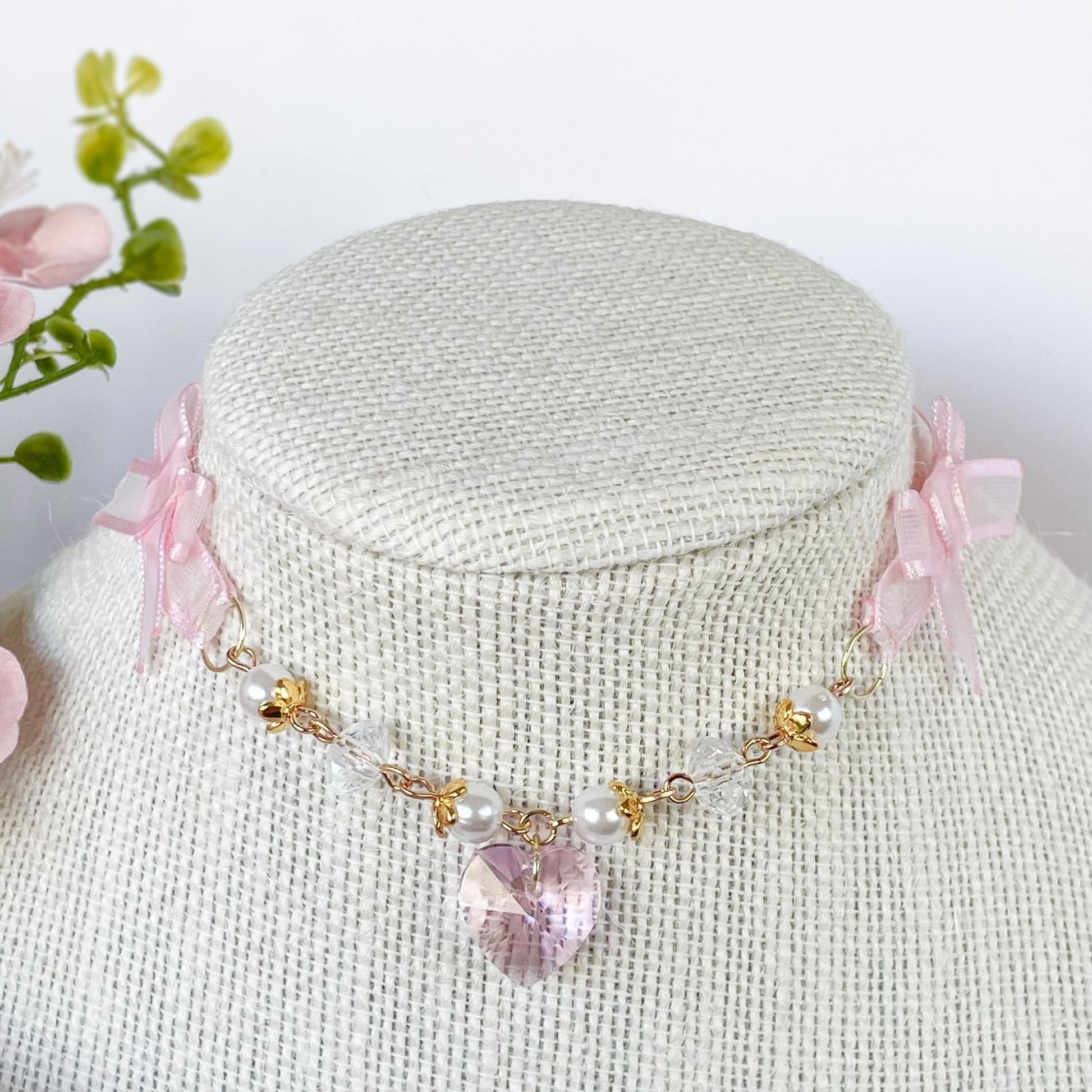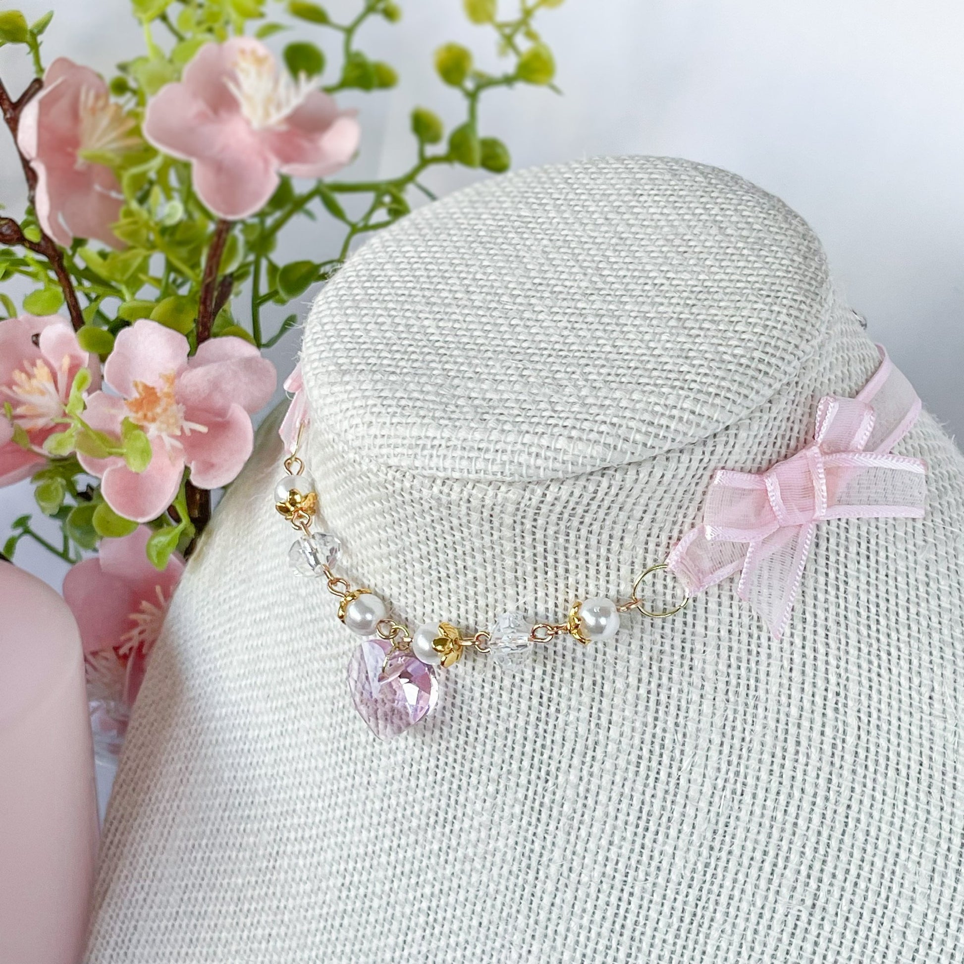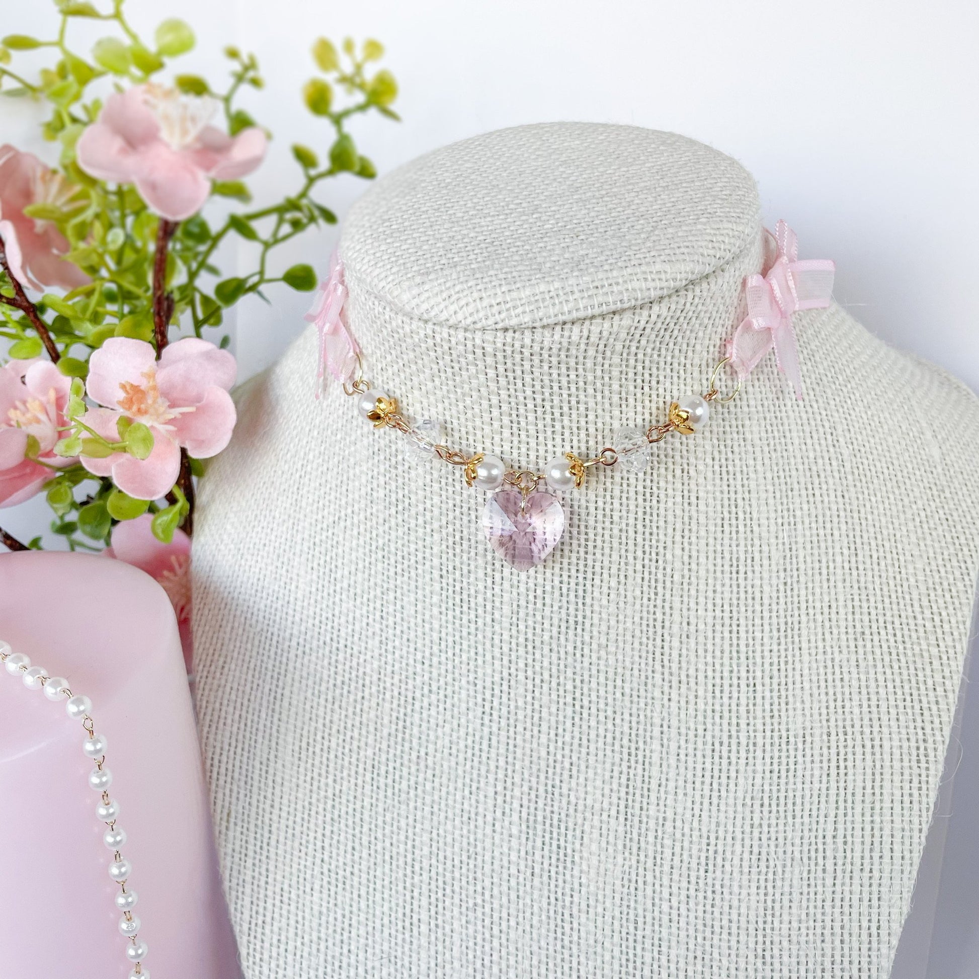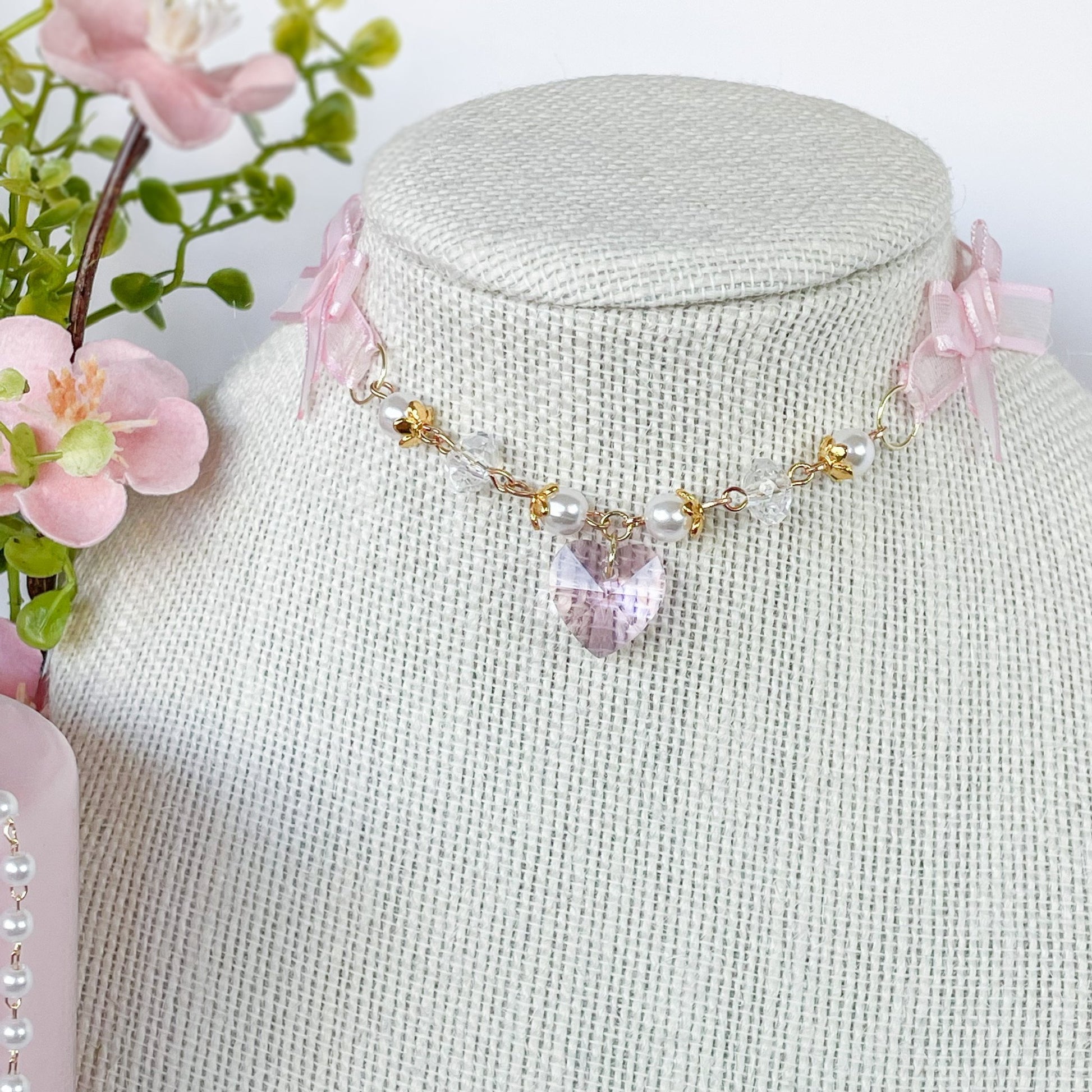 Sheer pink choker with crystal beads and heart charm.