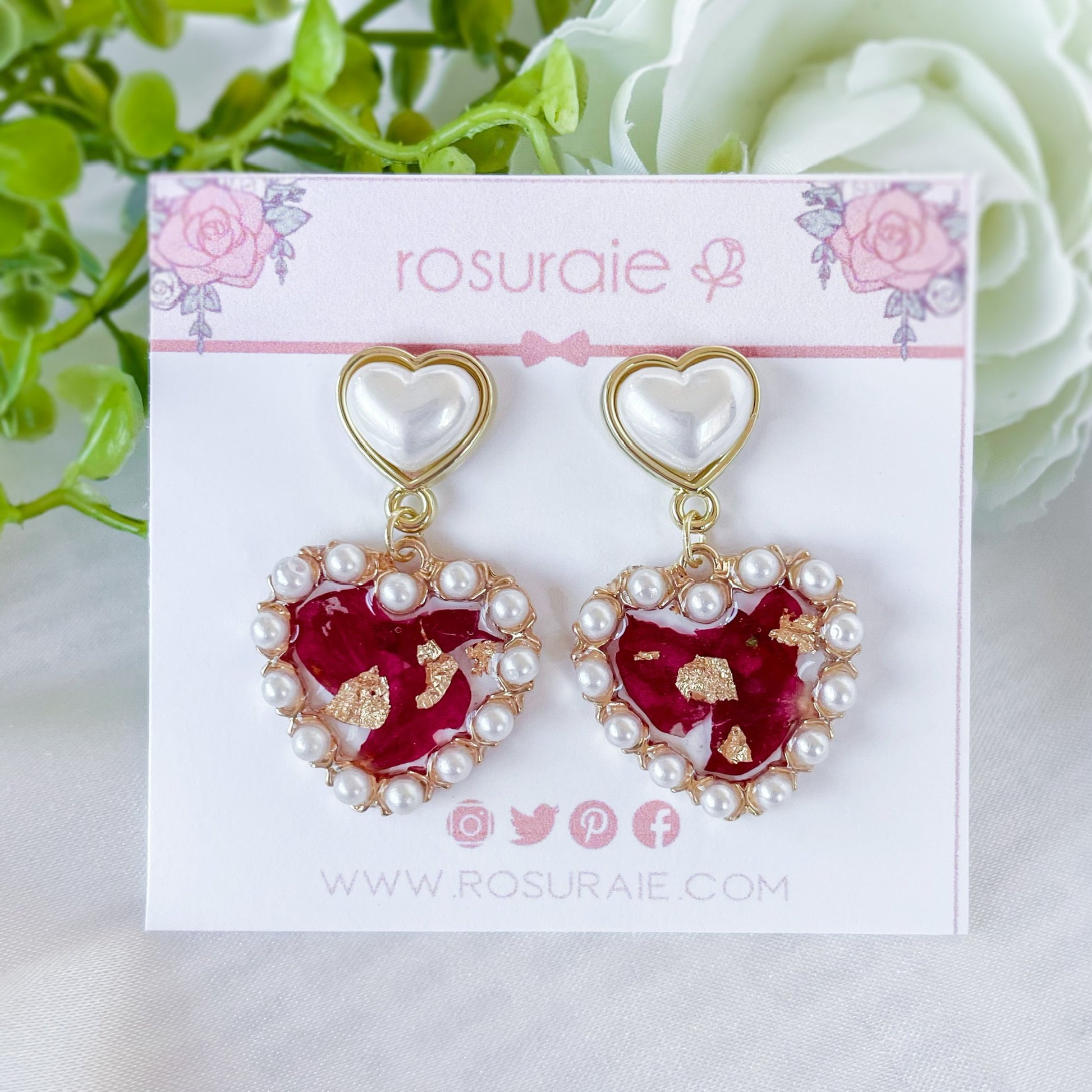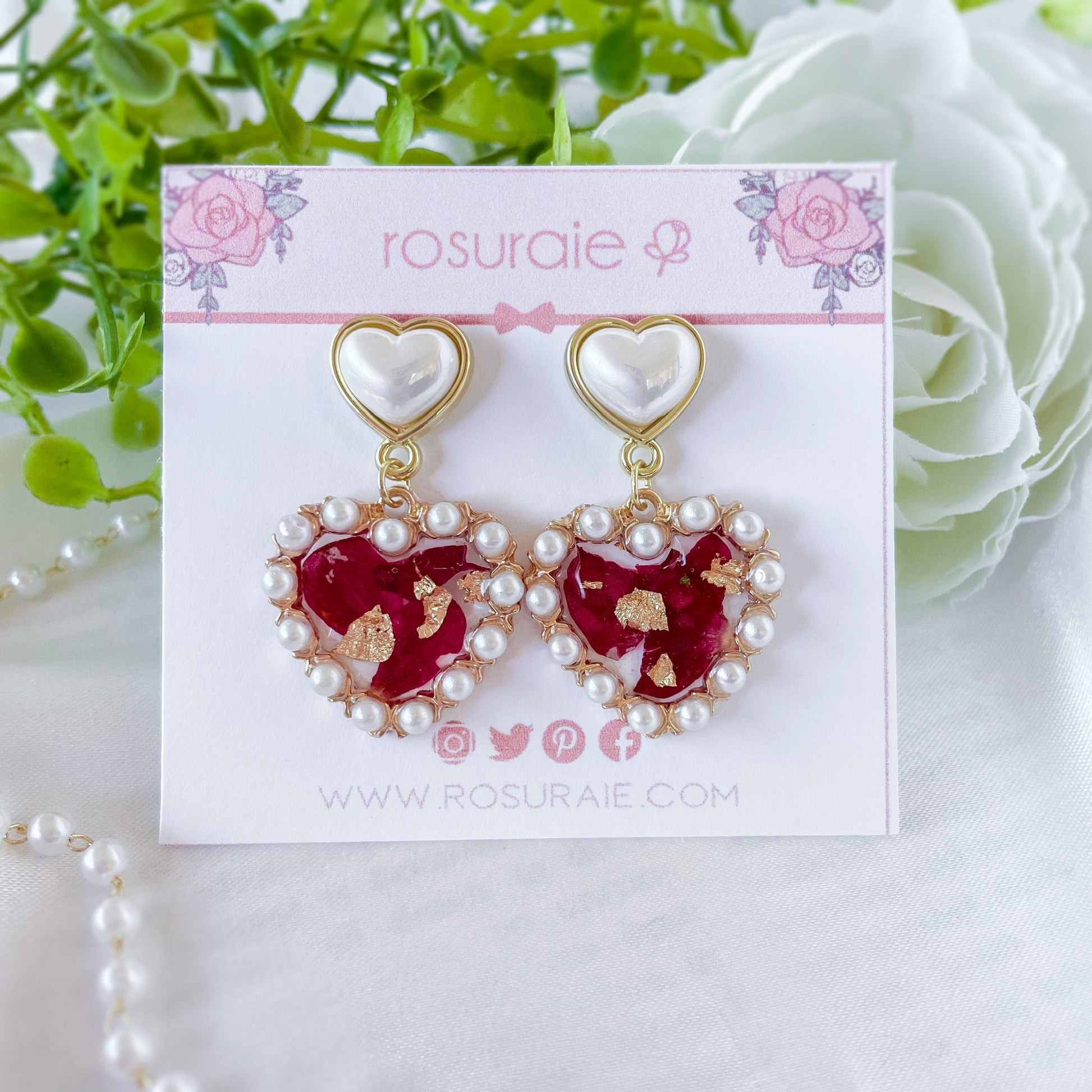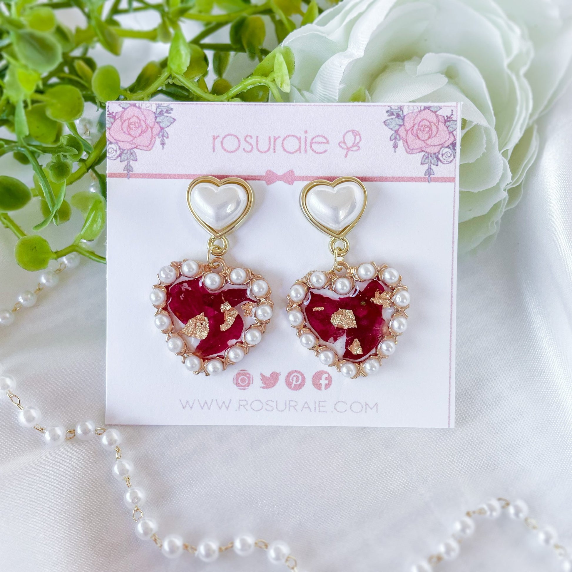 Pearl heart earrings with dried rose petals.