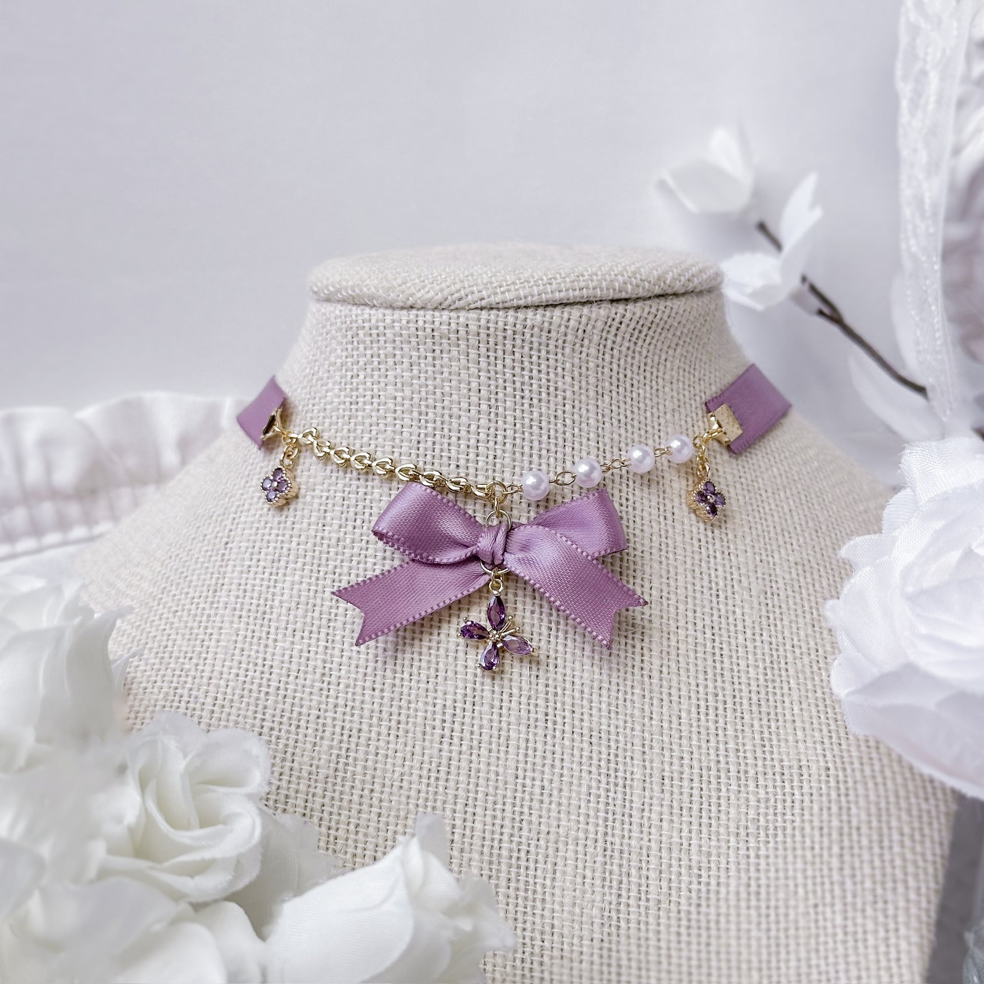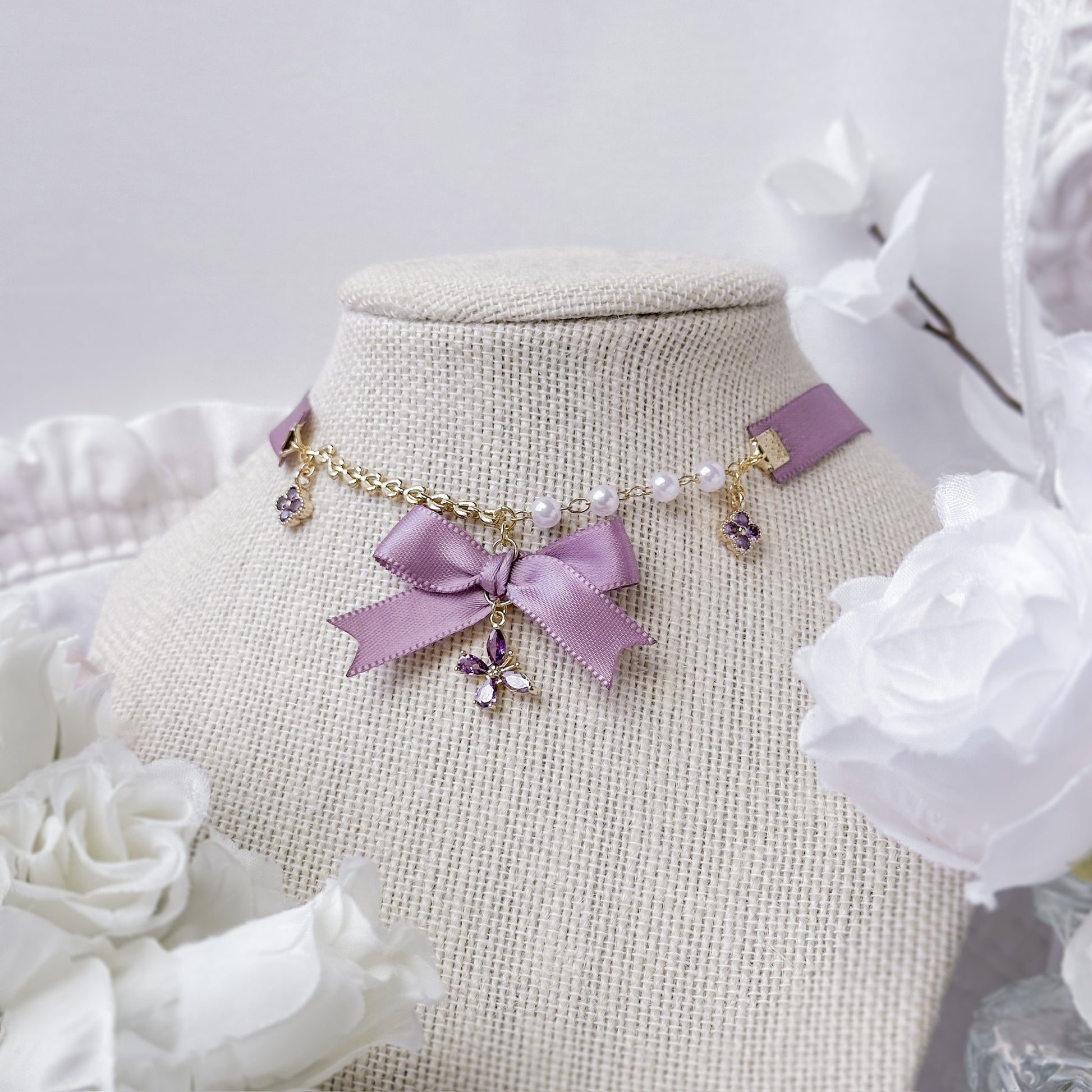 Lavender satin ribbon choker with butterfly and pearl chain.