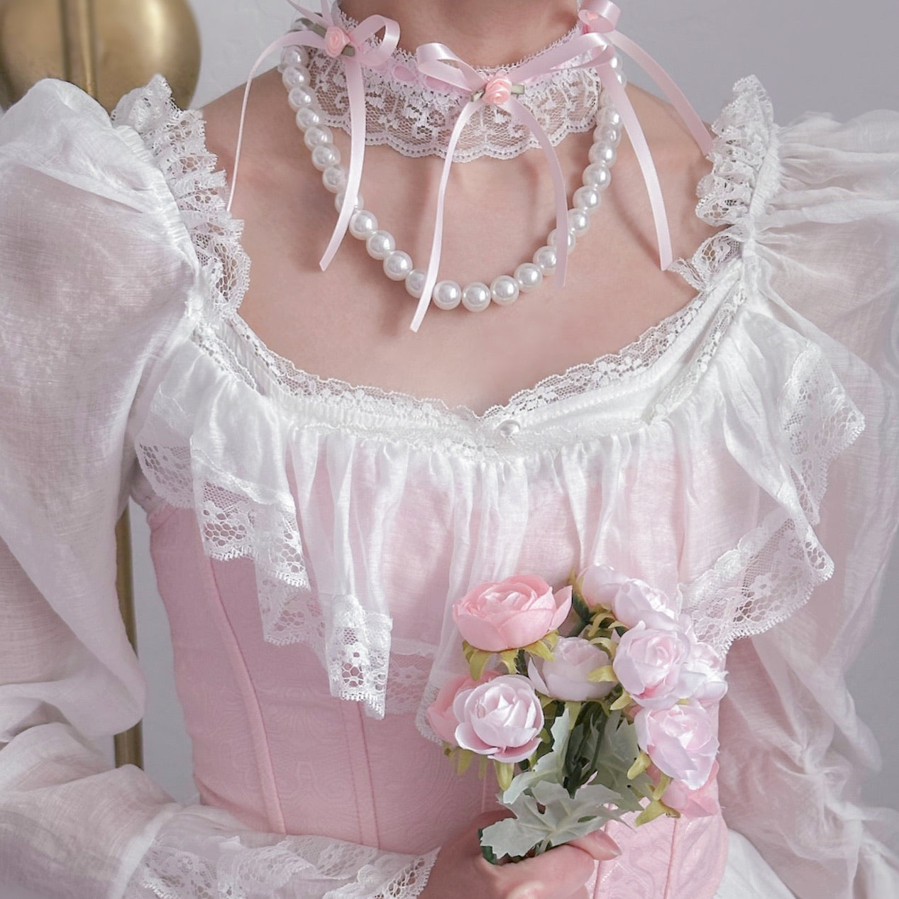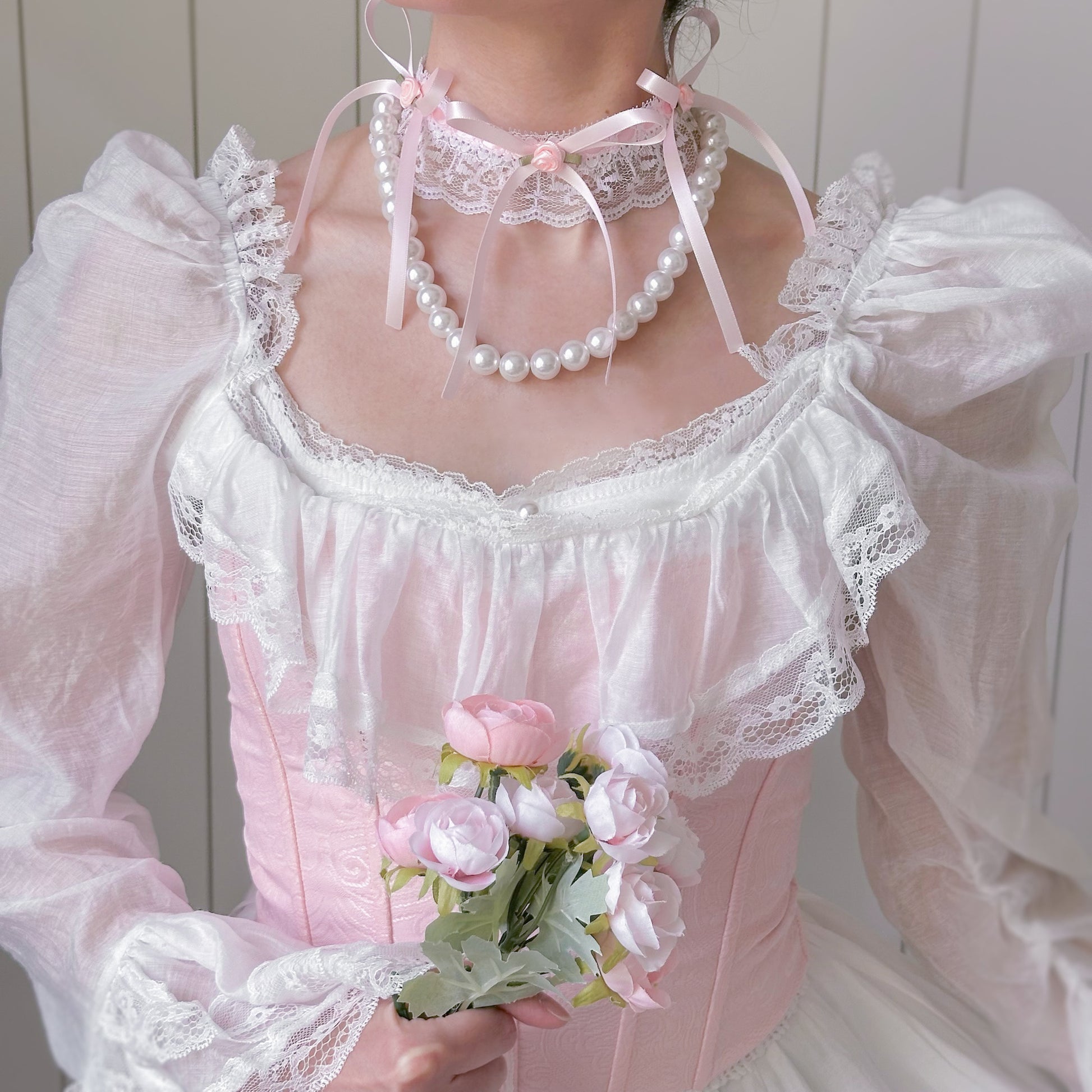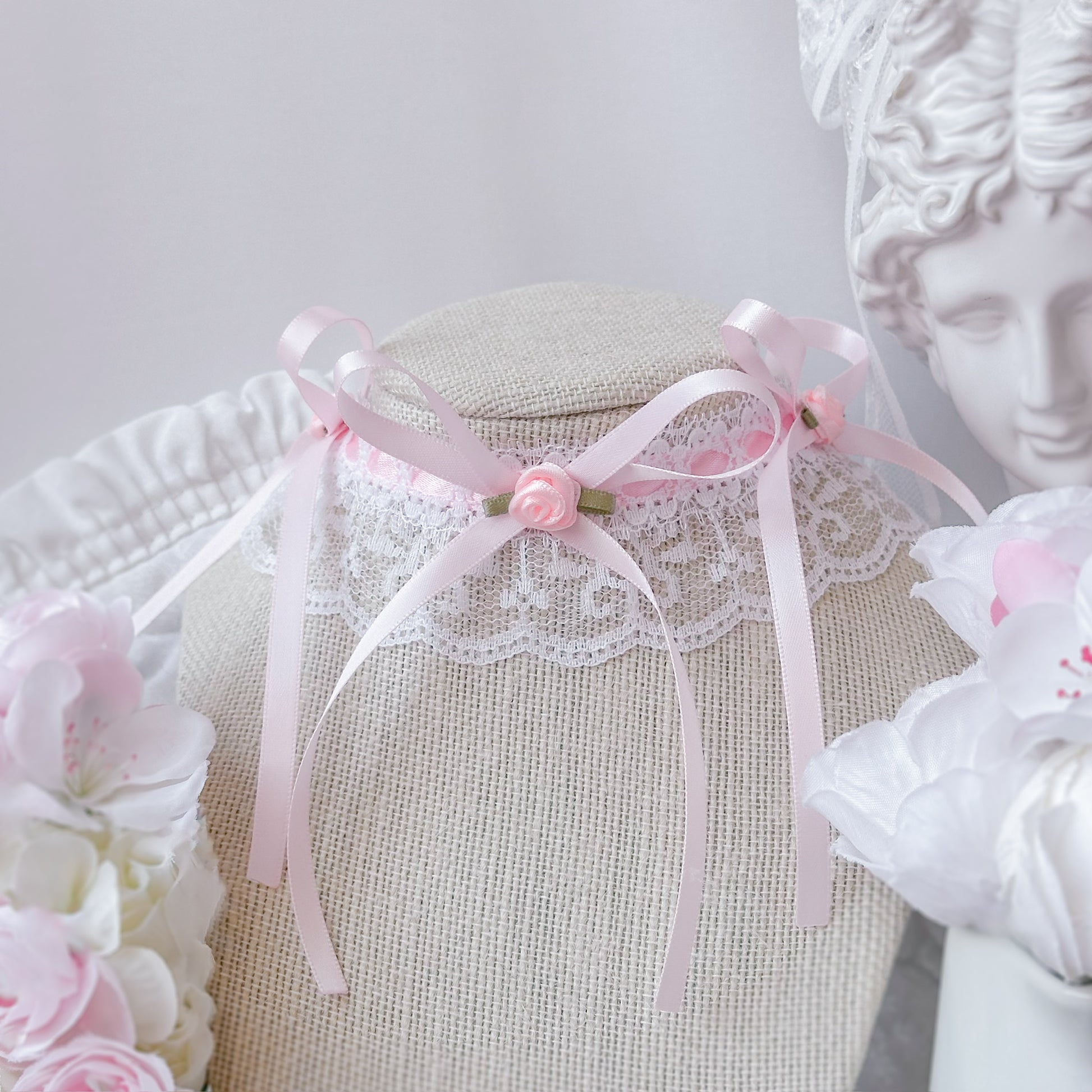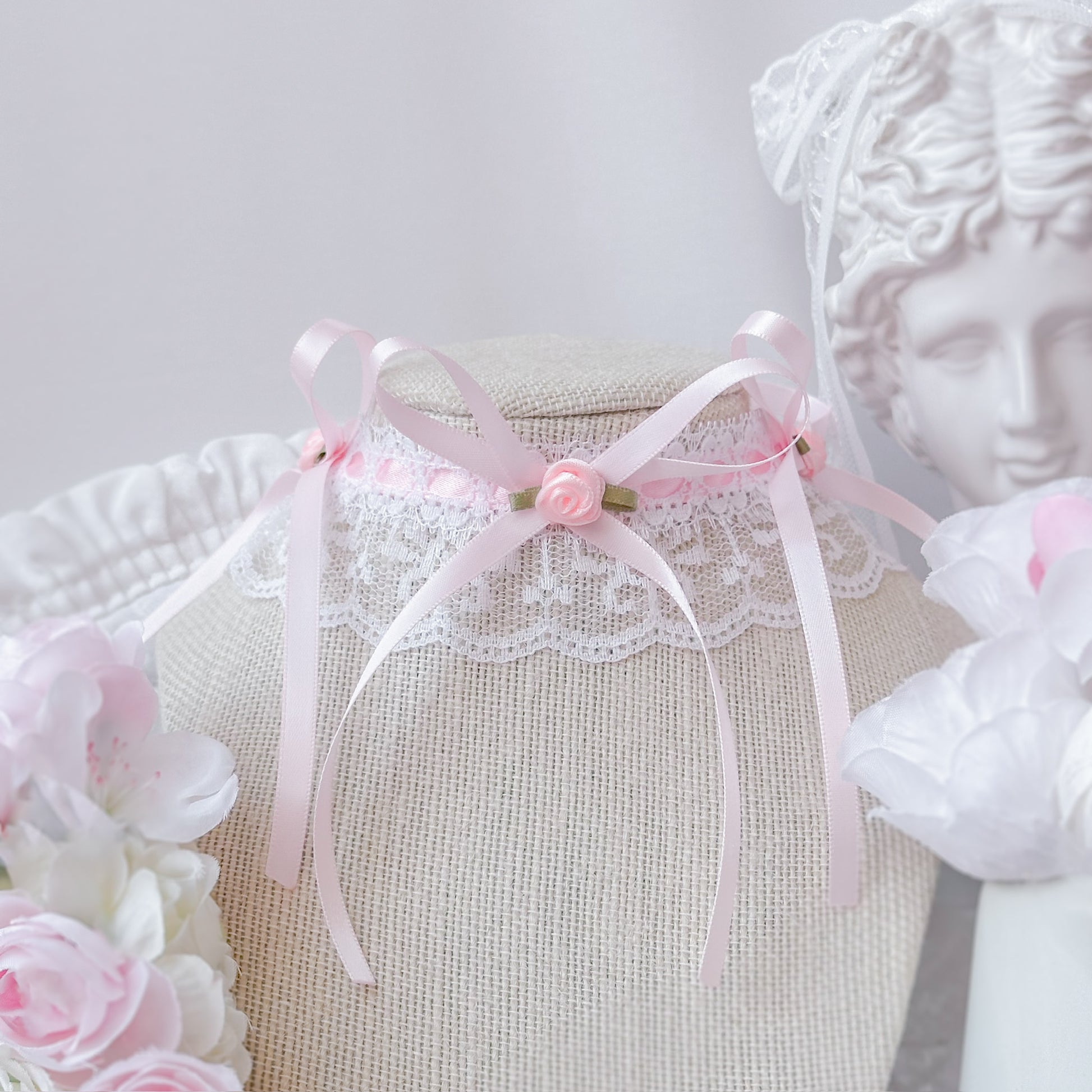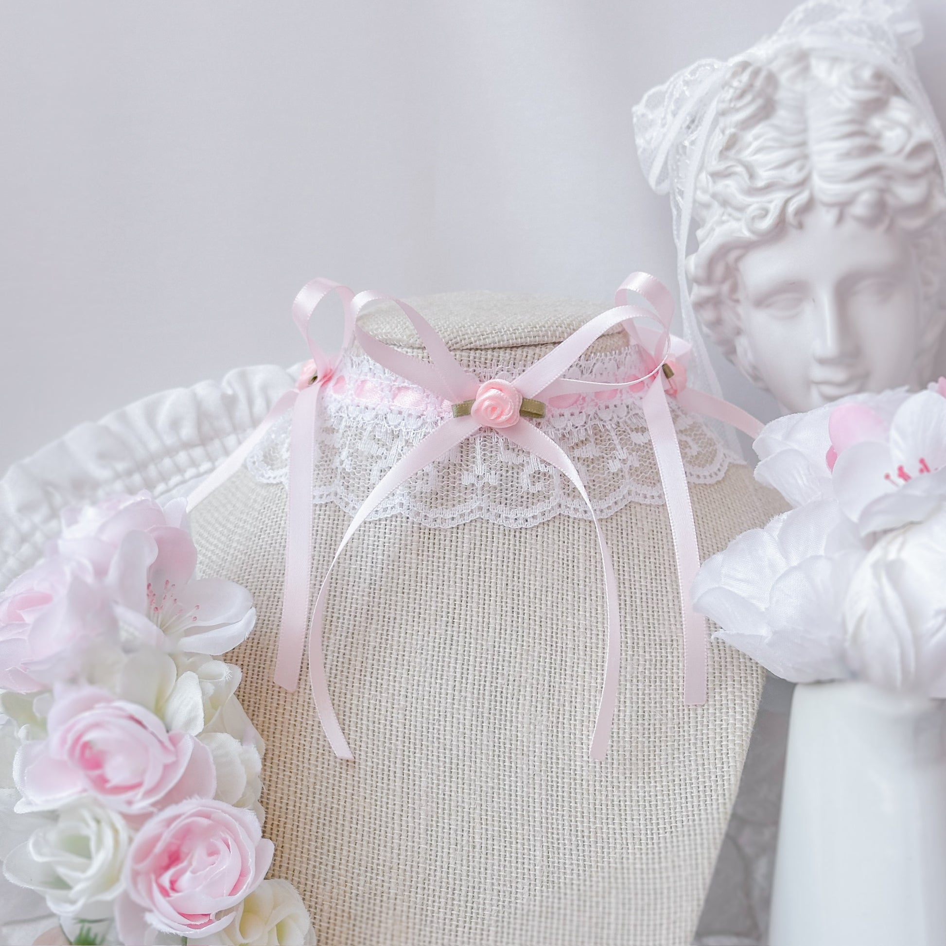 Lace choker with pink satin ribbon and rose accents.