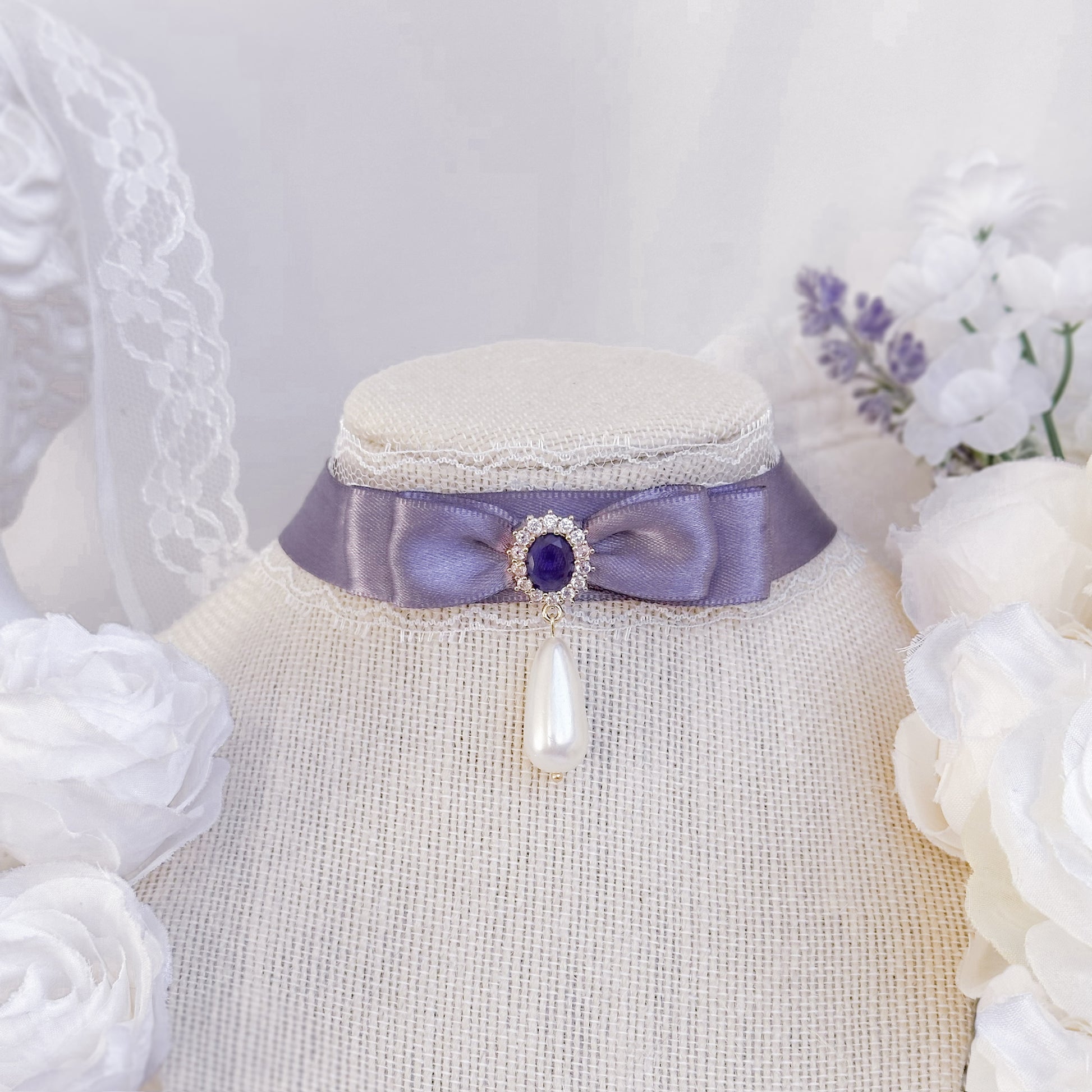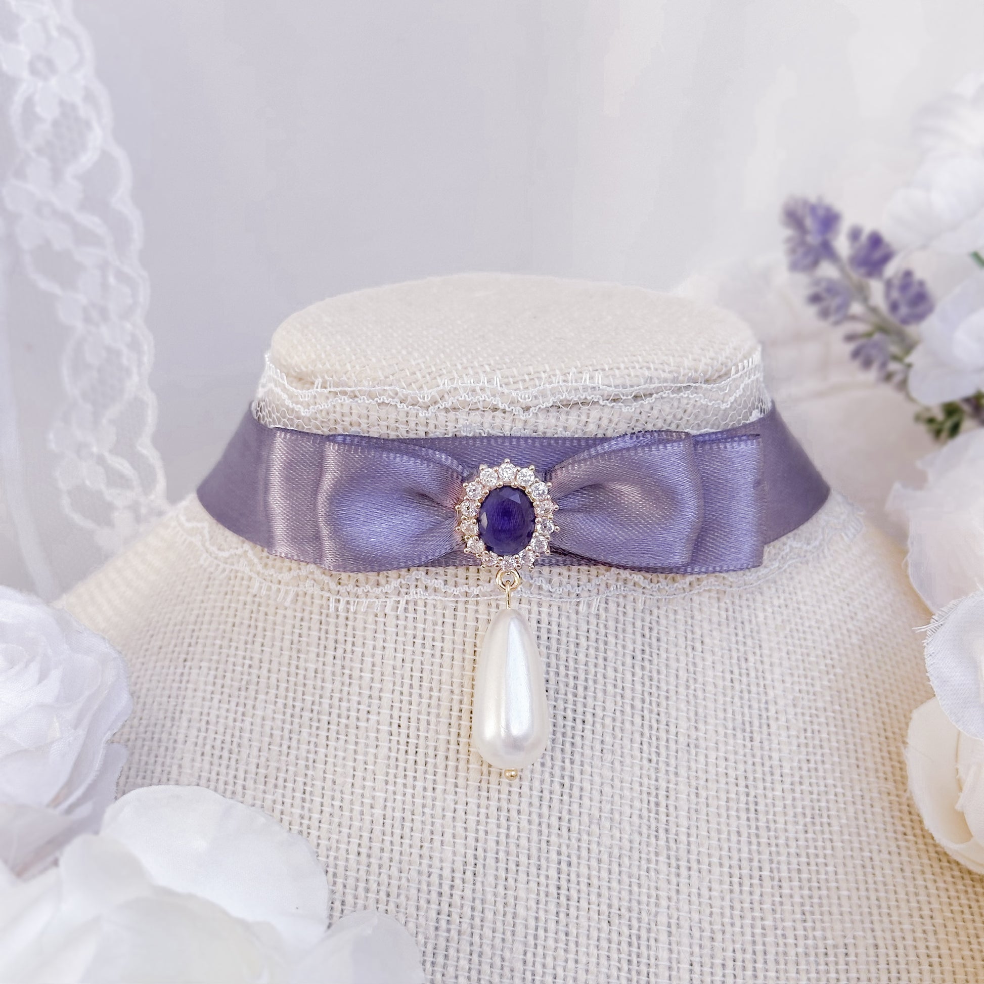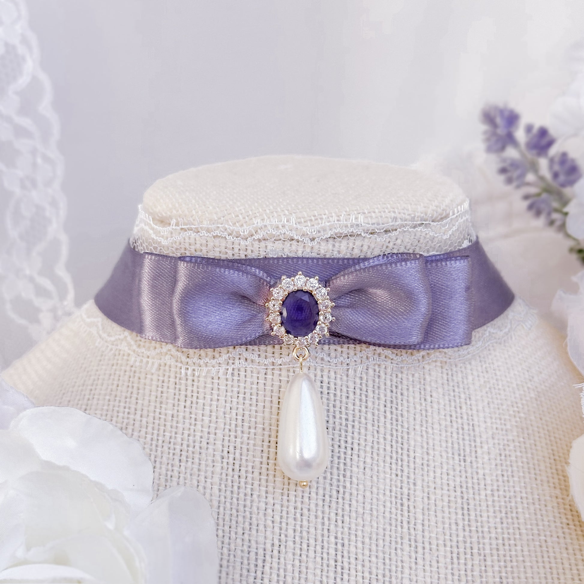 Lace choker with purple satin ribbon and crystal charm.