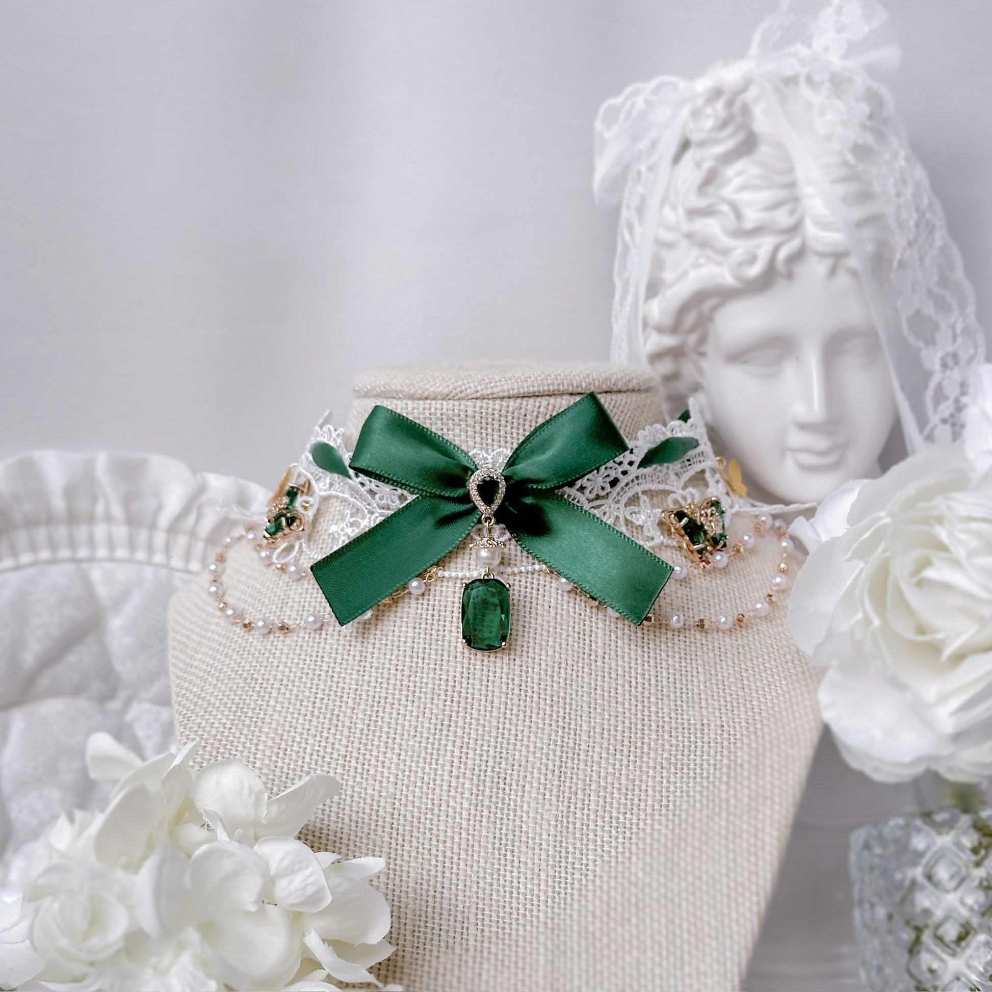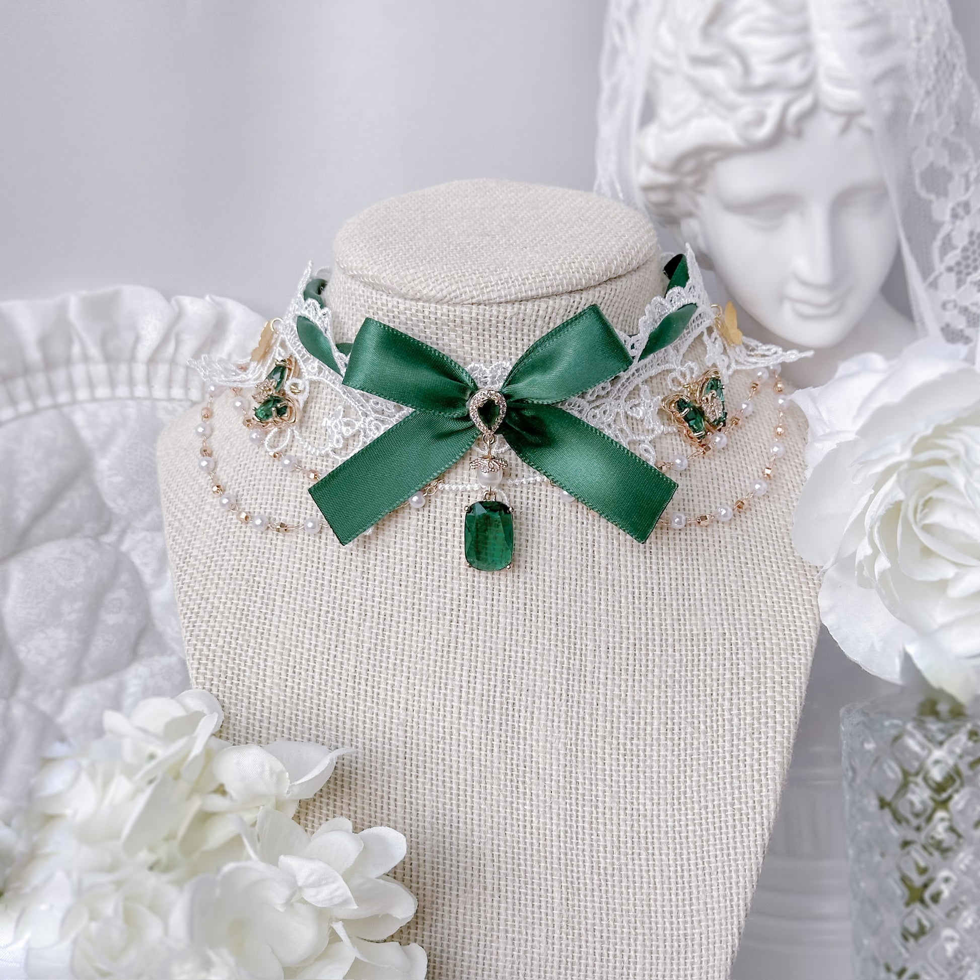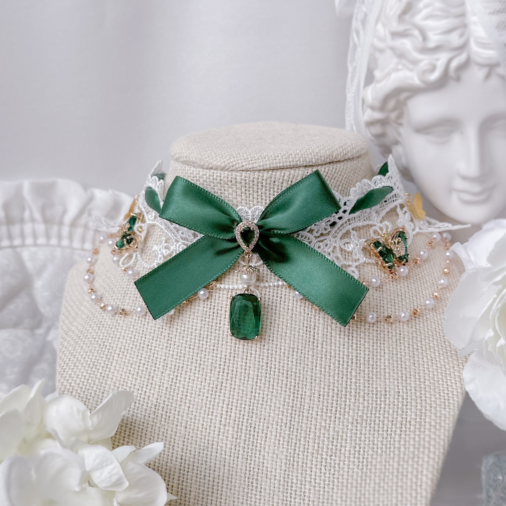 Lace choker with emerald satin ribbon and dark green crystal butterfly accents.