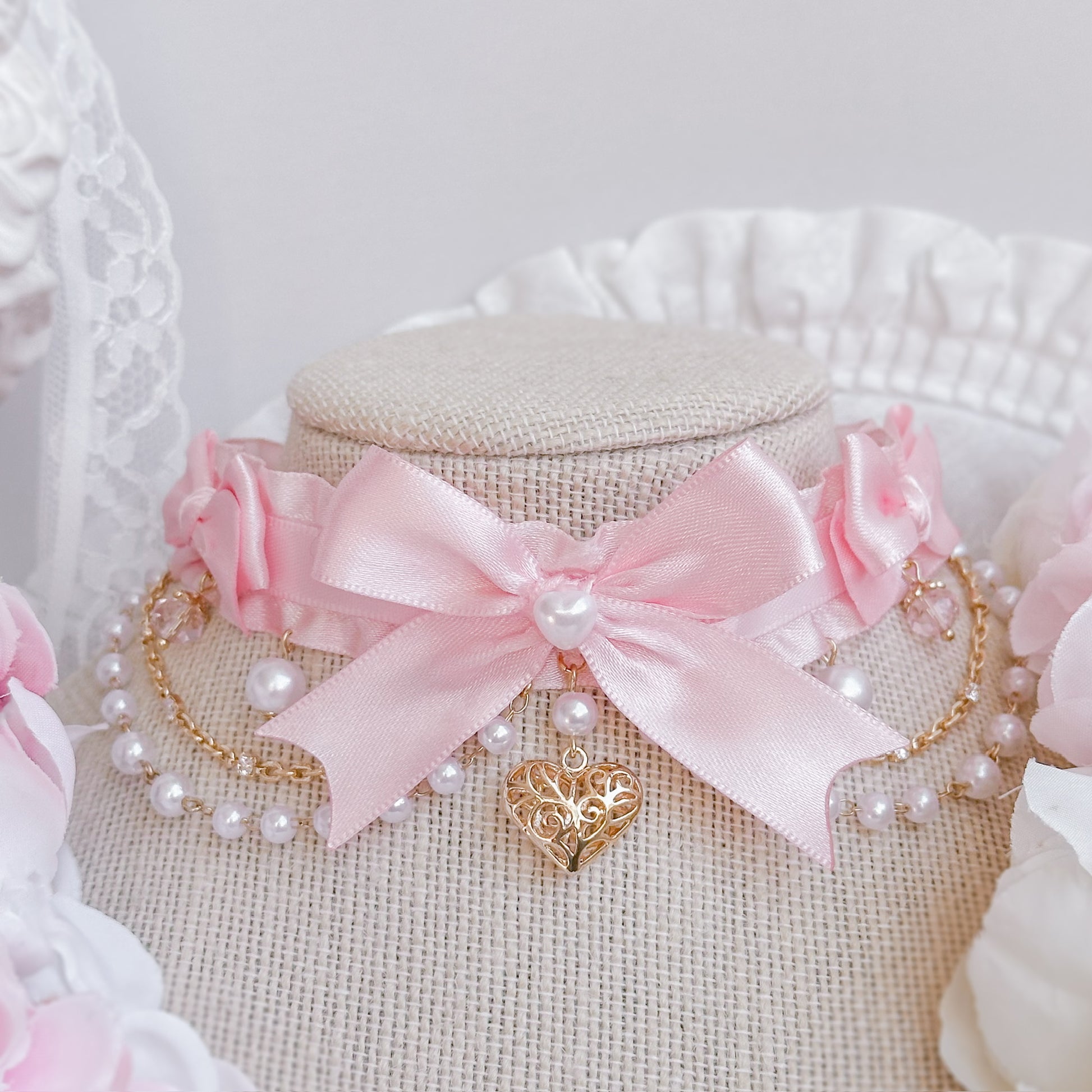 Pink satin ruffle choker with heart charms and dangling chains.