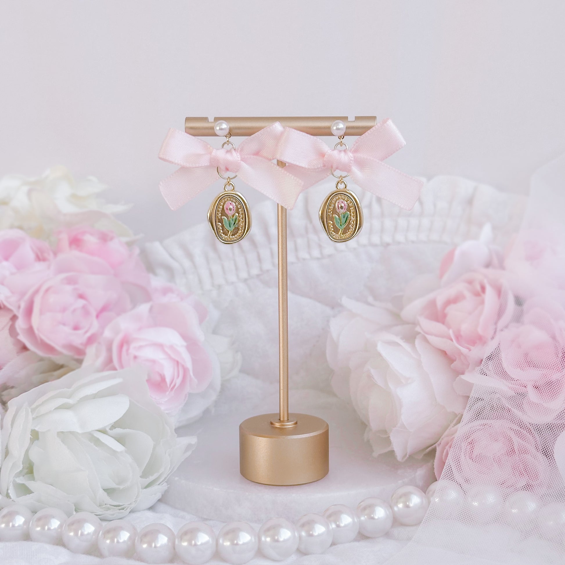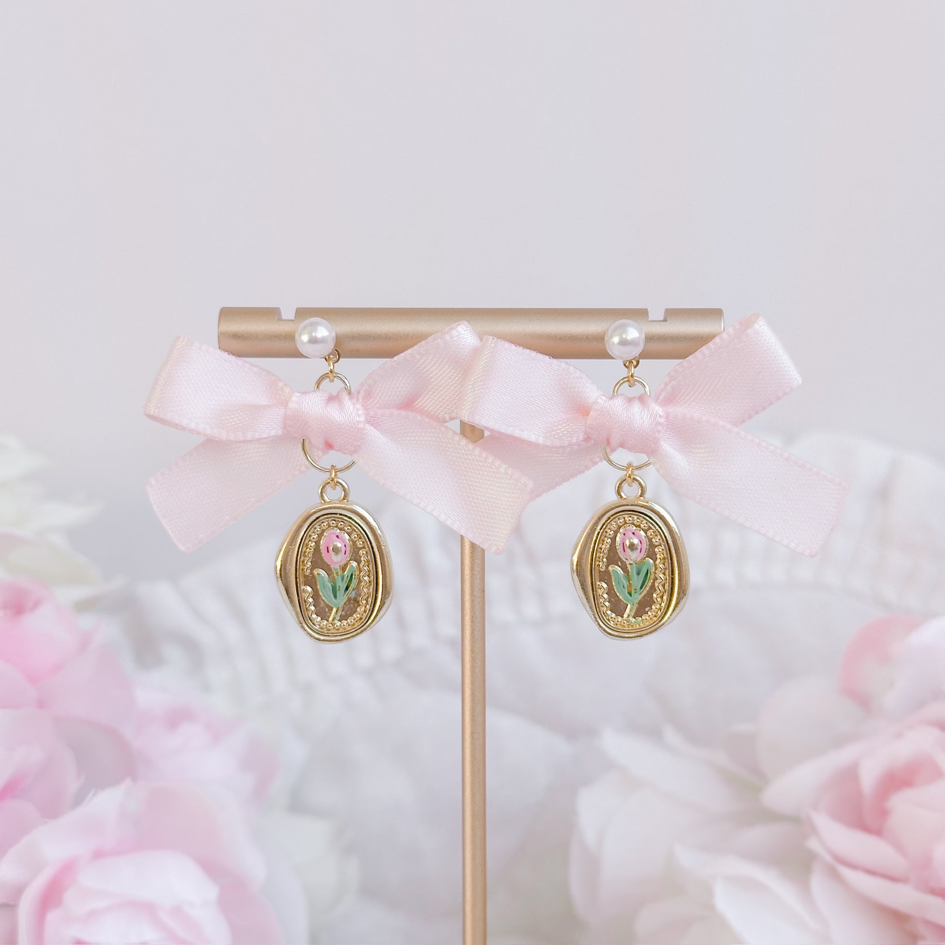 Pink tulip bow earrings.