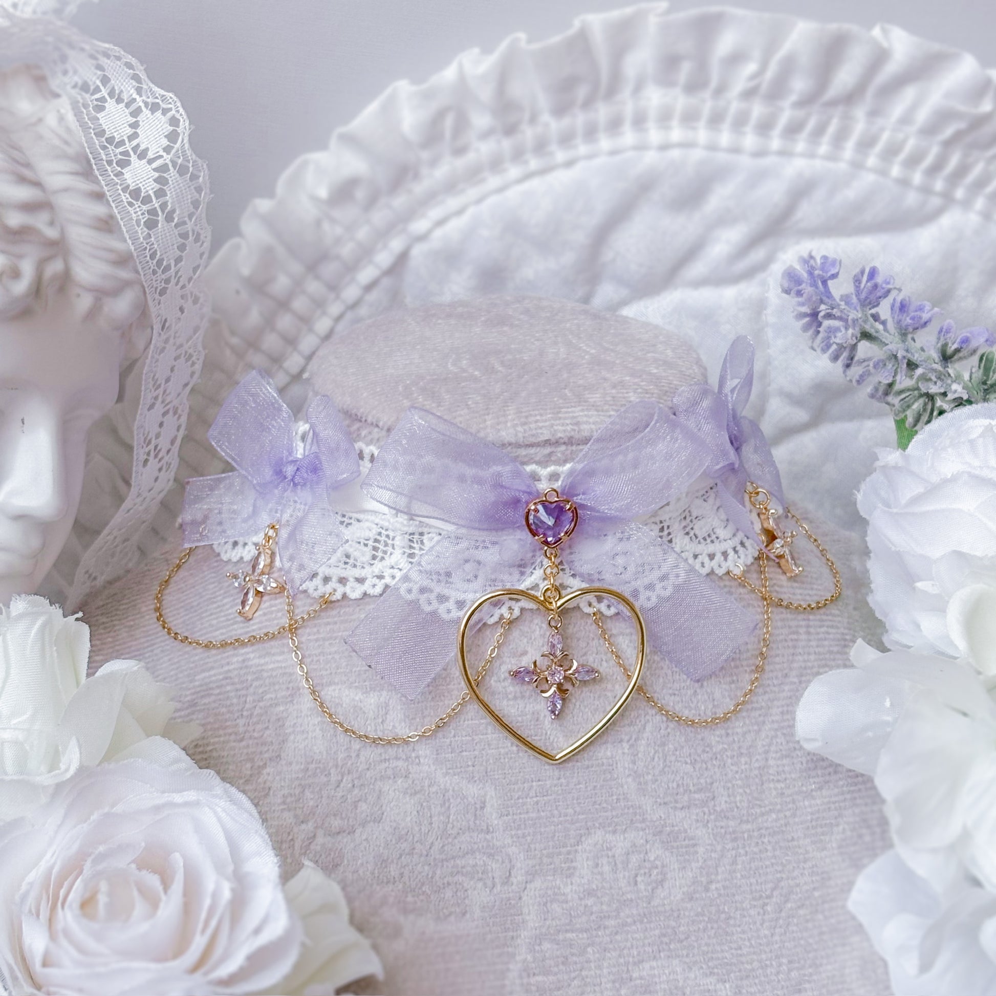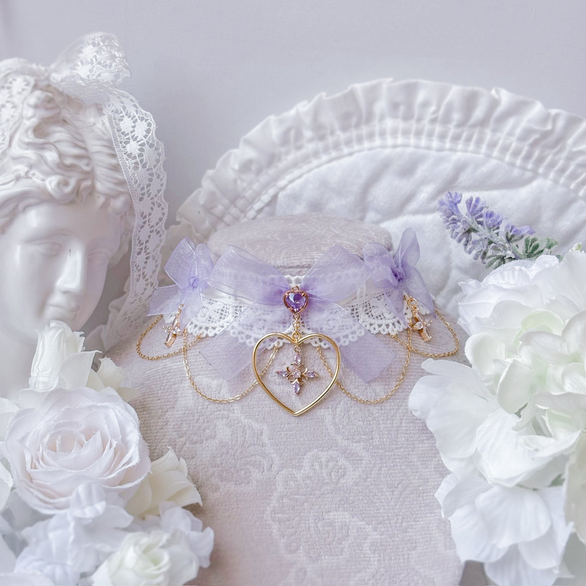 Lace choker with sheer purple ribbon.