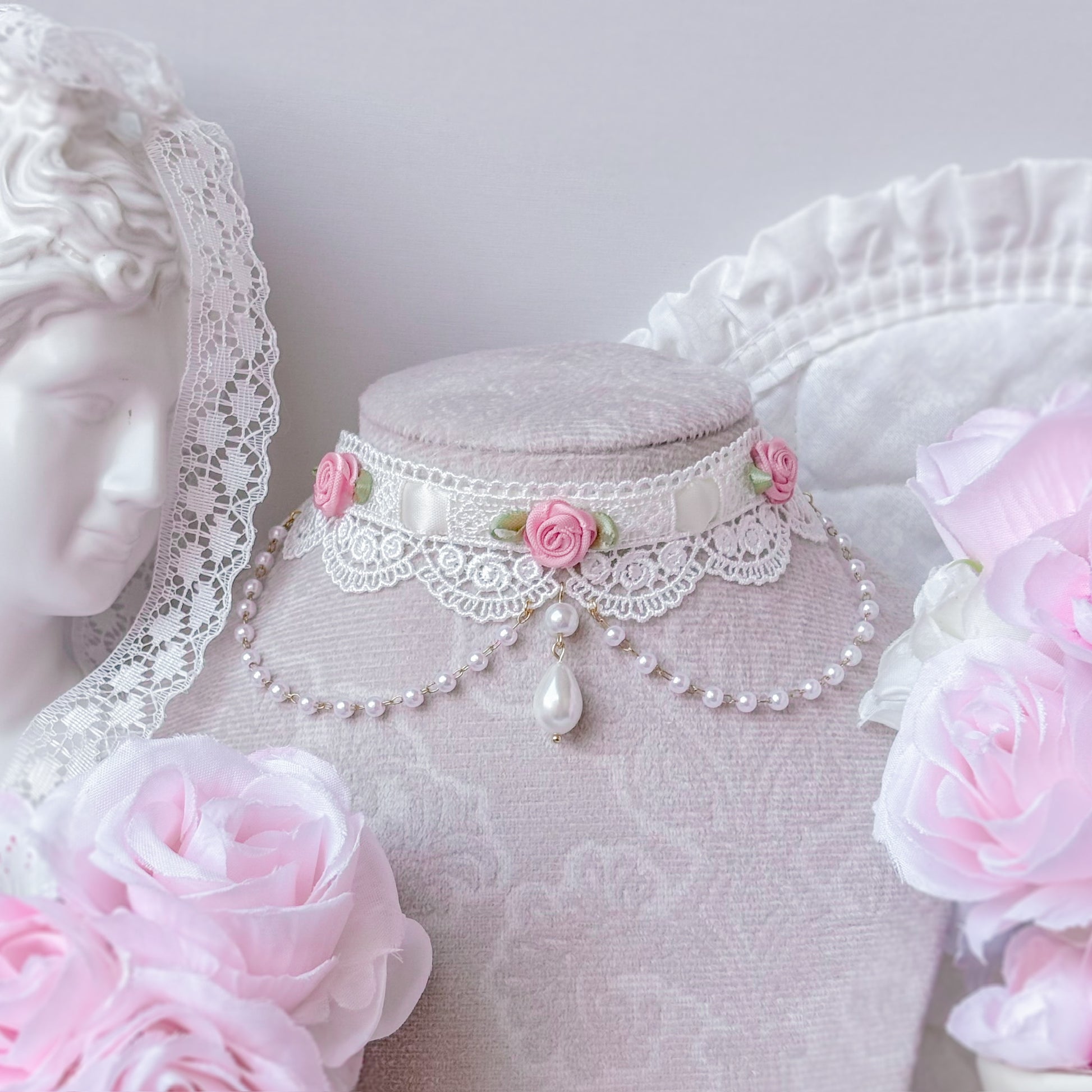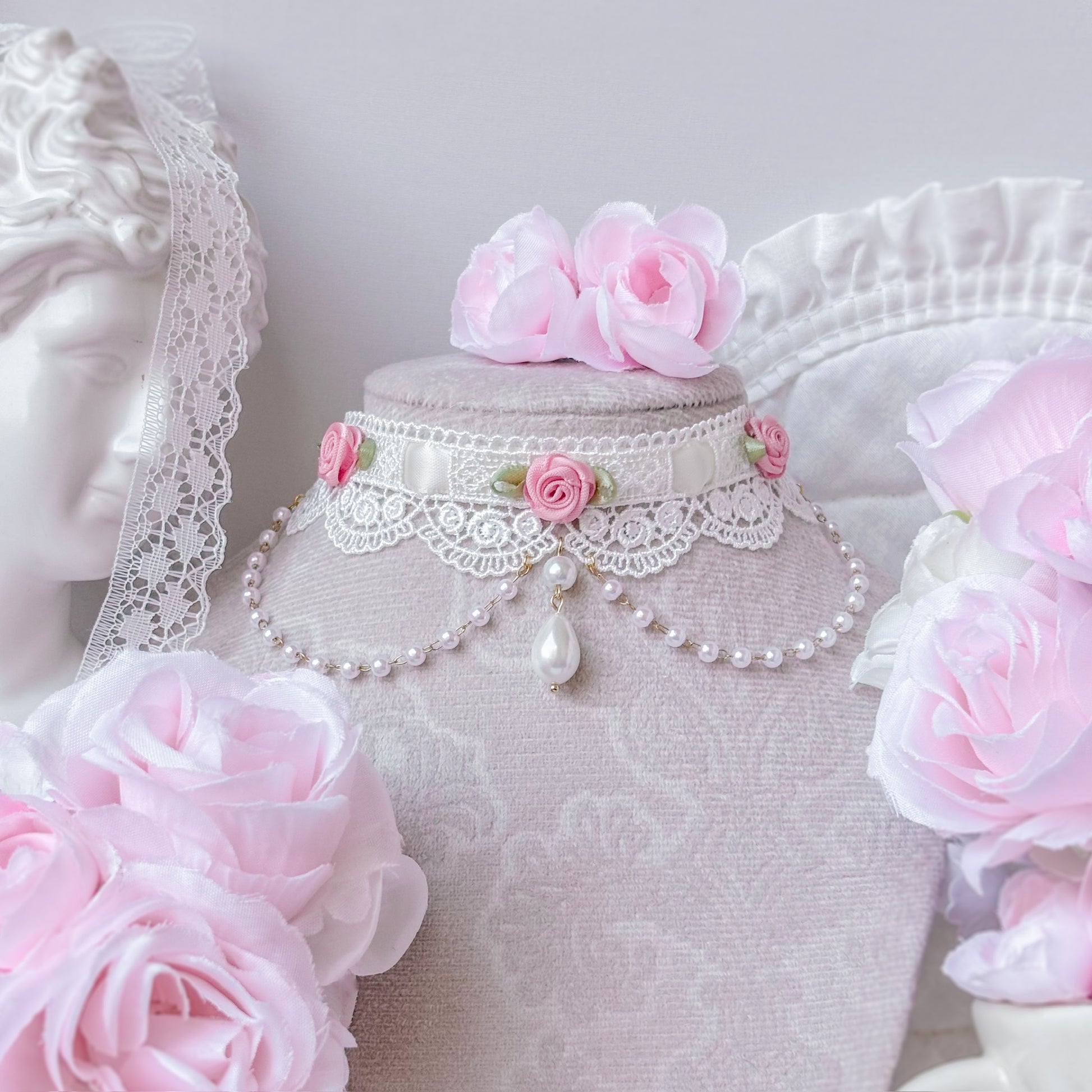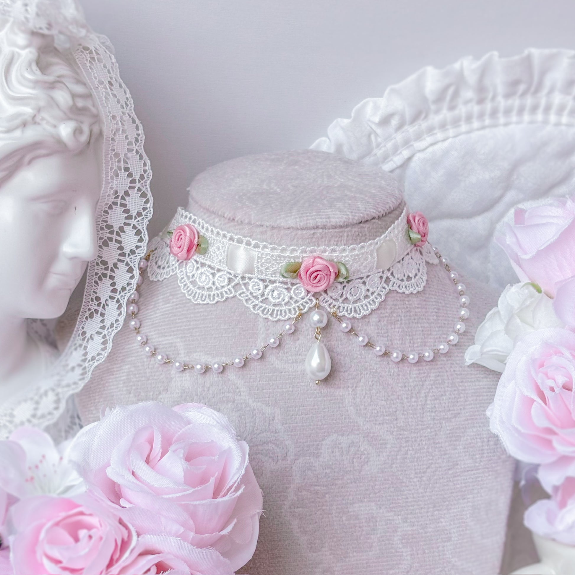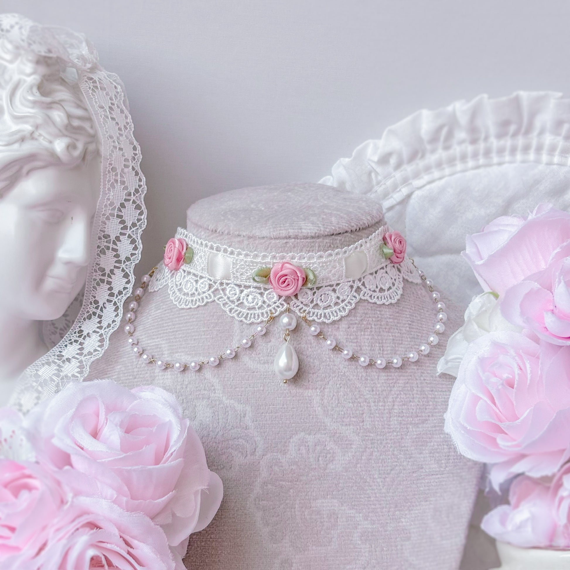 Ornate lace choker with pink roses and pearl chain.