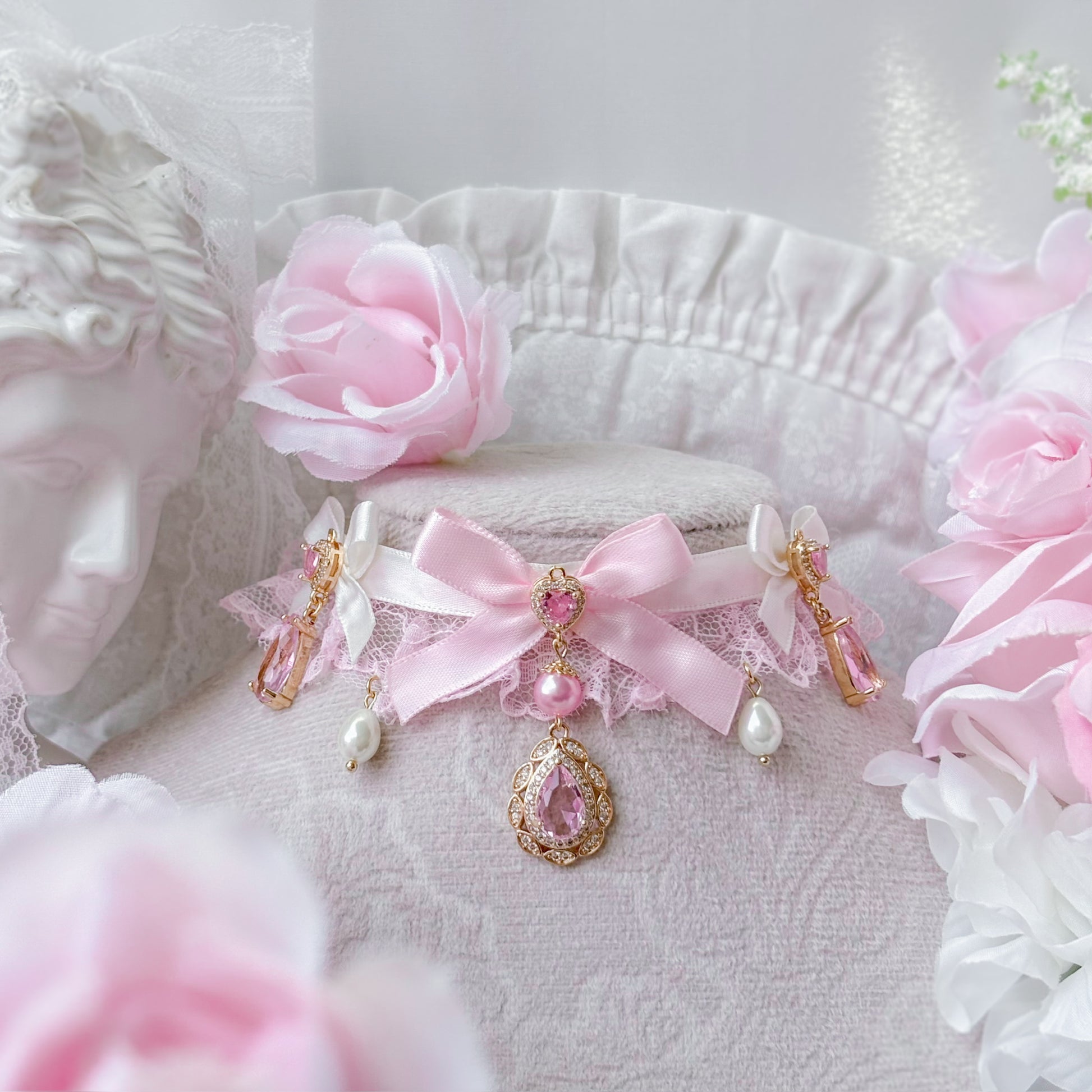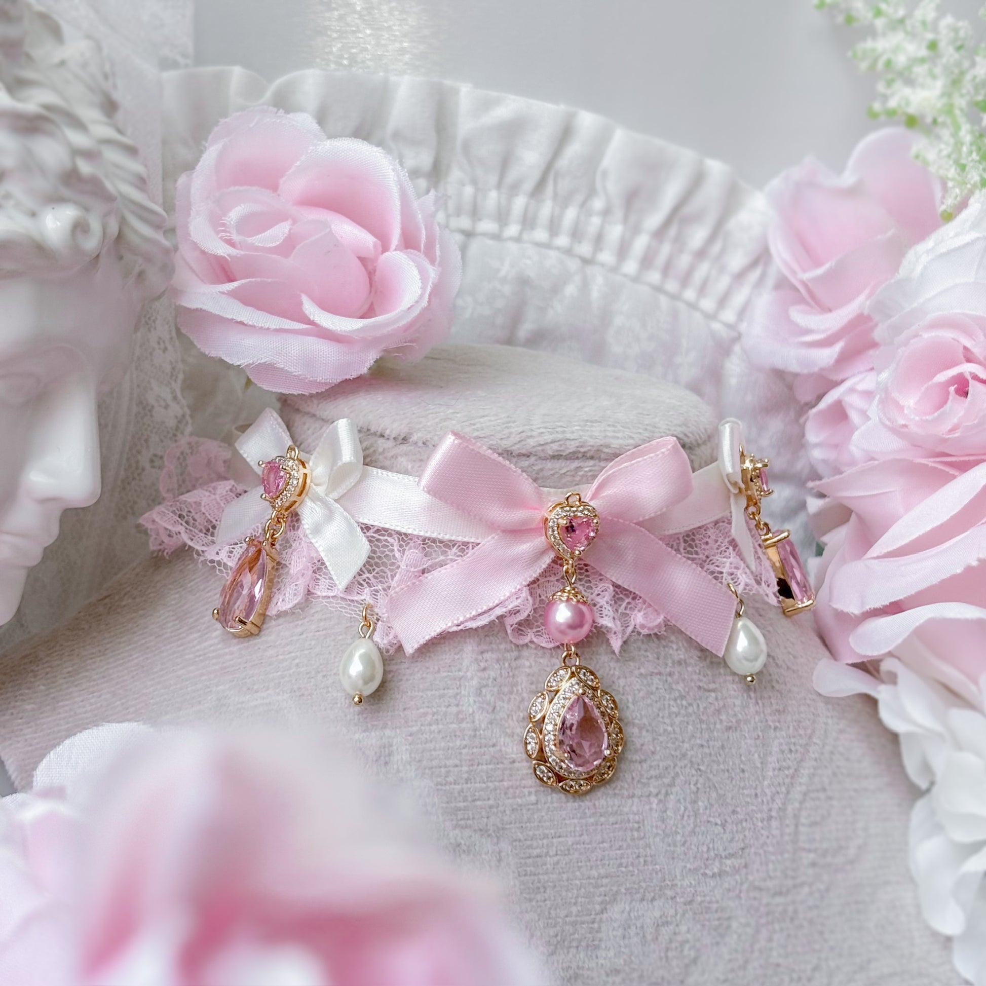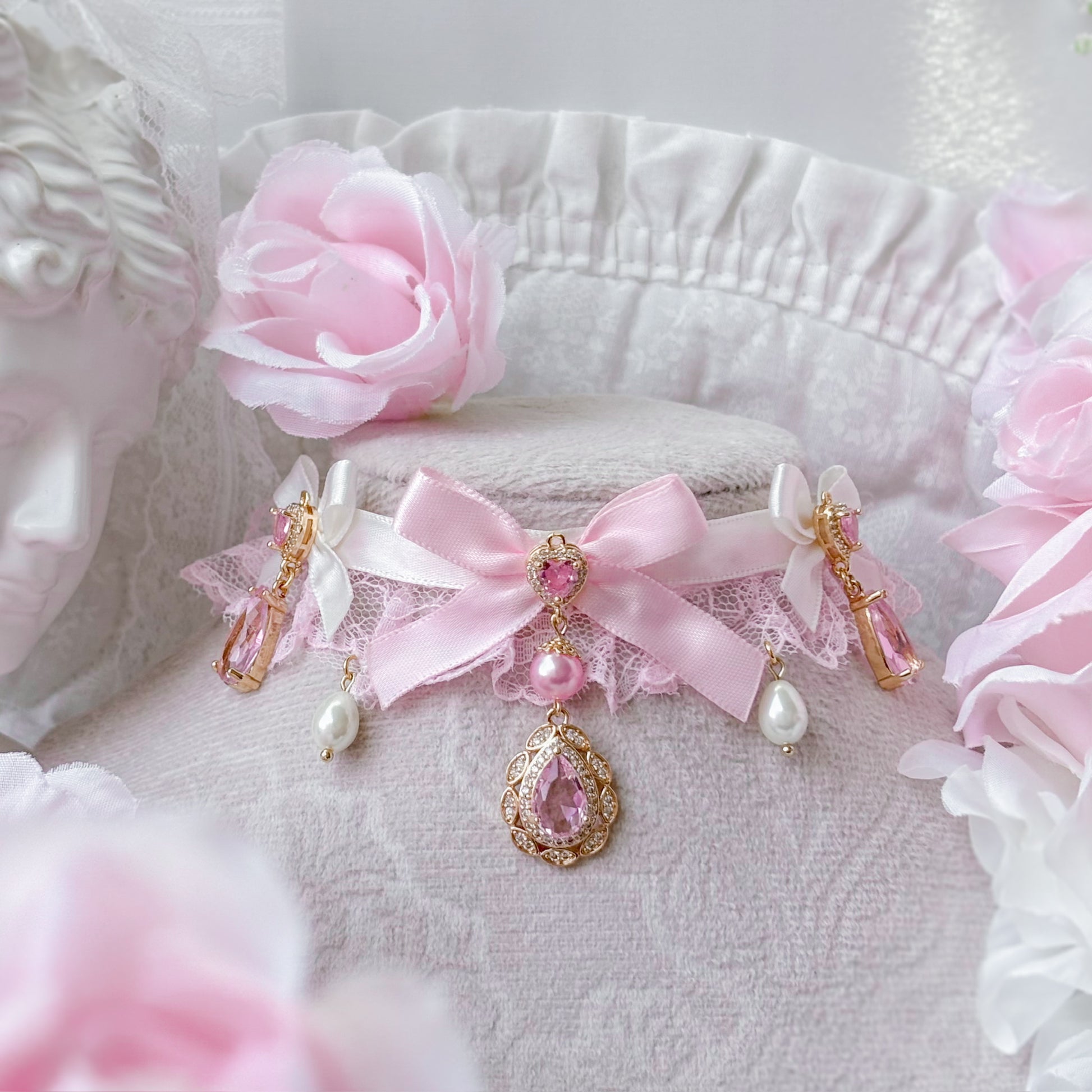 Pink lace choker with creme/pale pink ribbon and pearl/crystal accents.