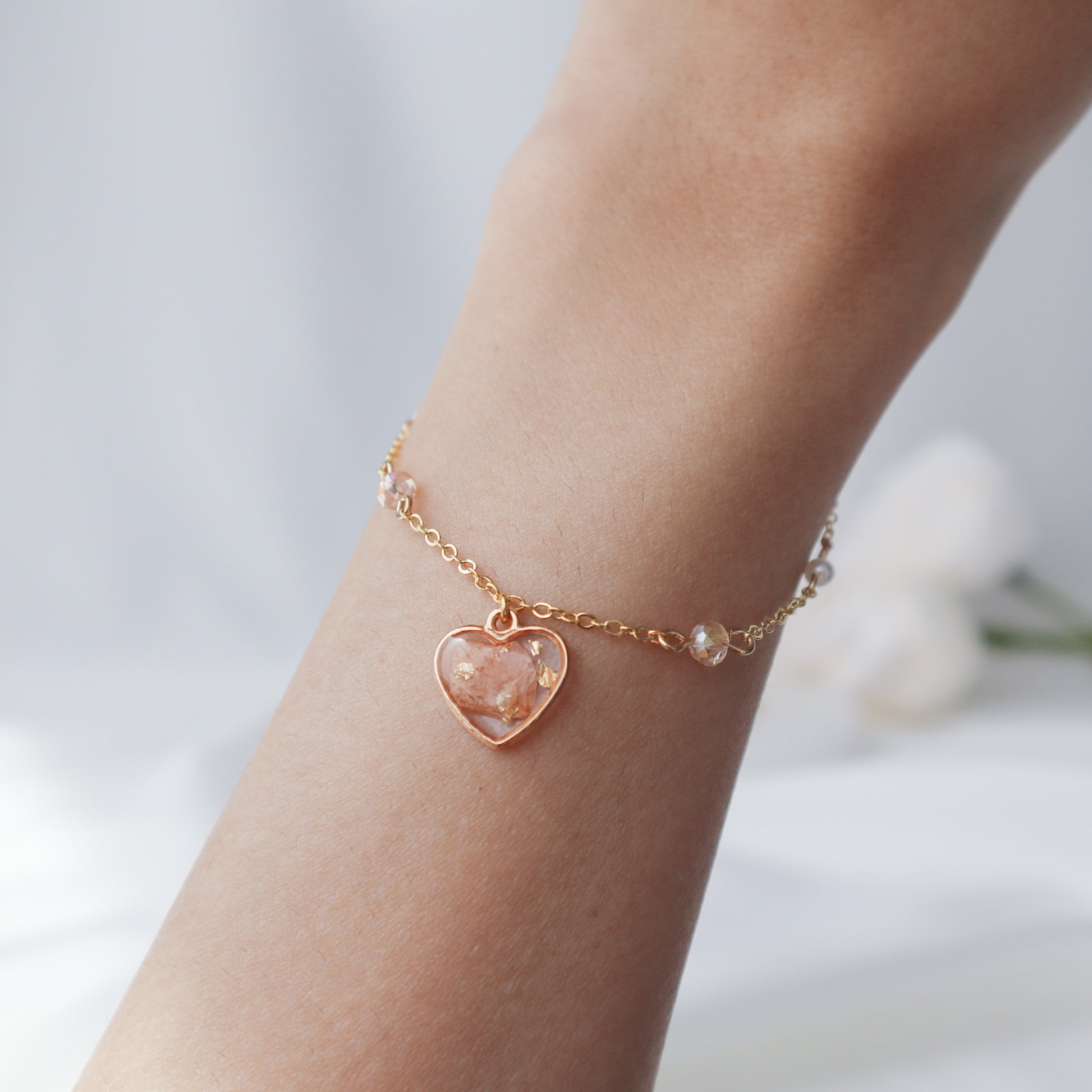 Heart bracelet with preserved pink hydrangeas in bio resin.