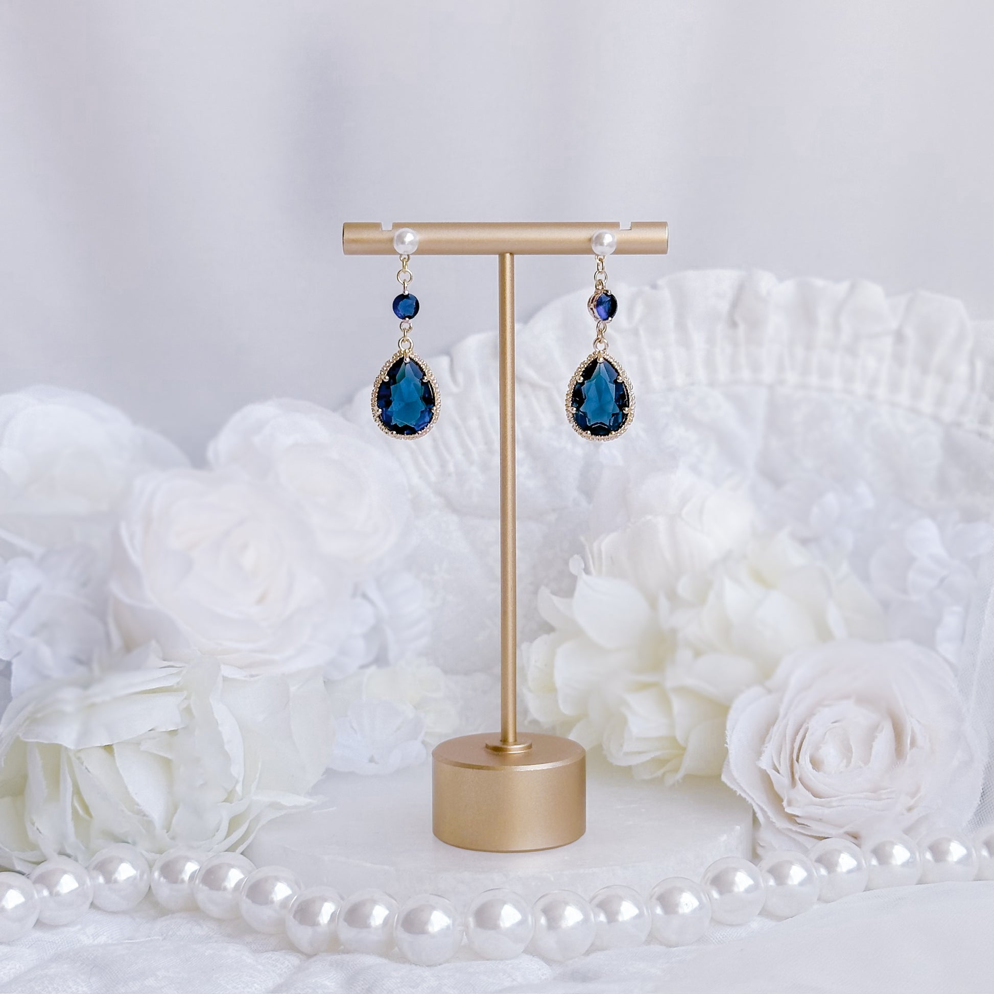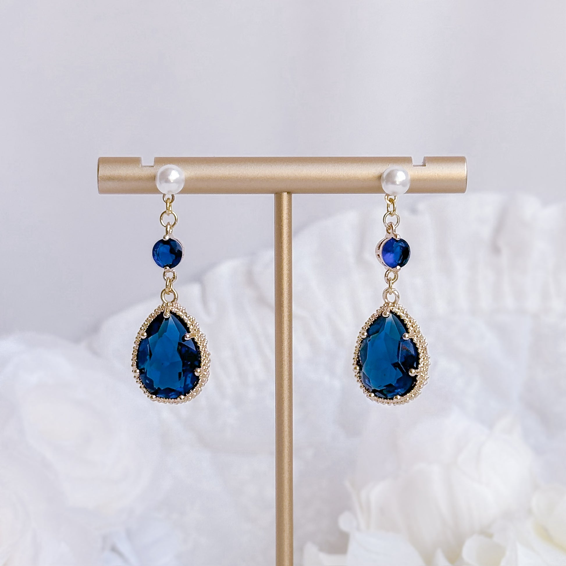 Crystal navy earrings with pearl post.