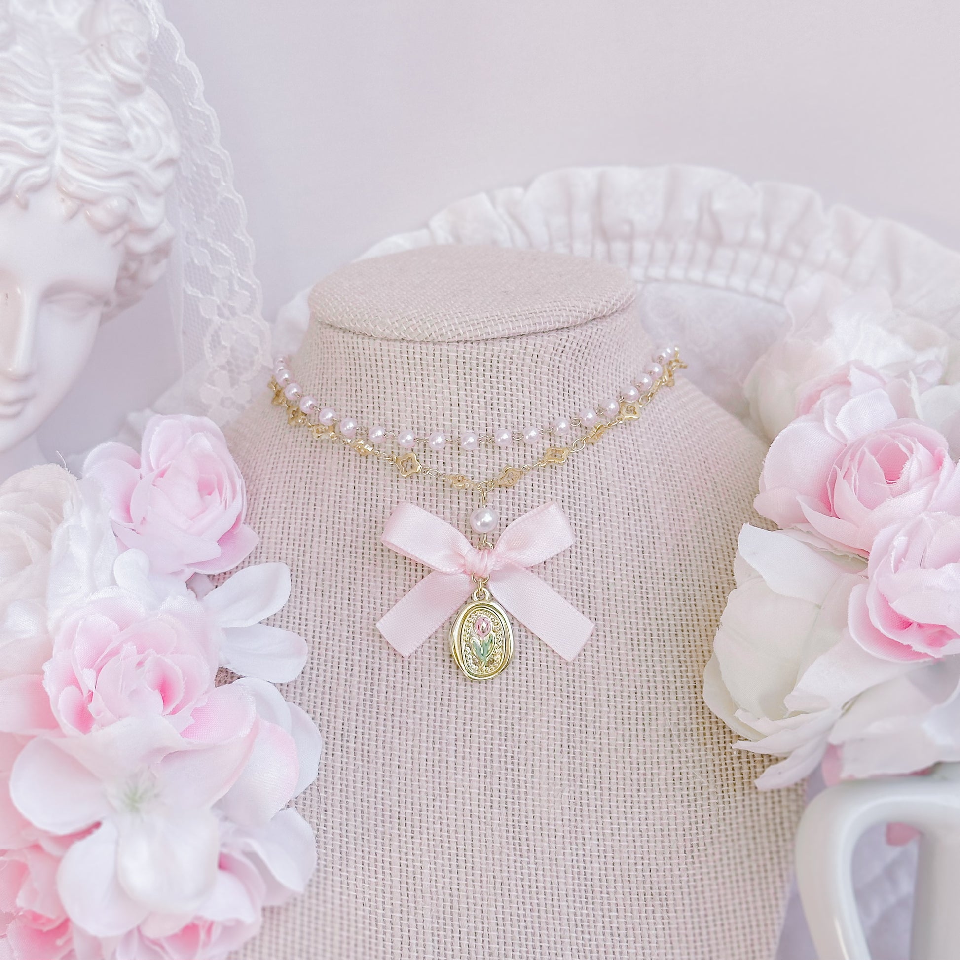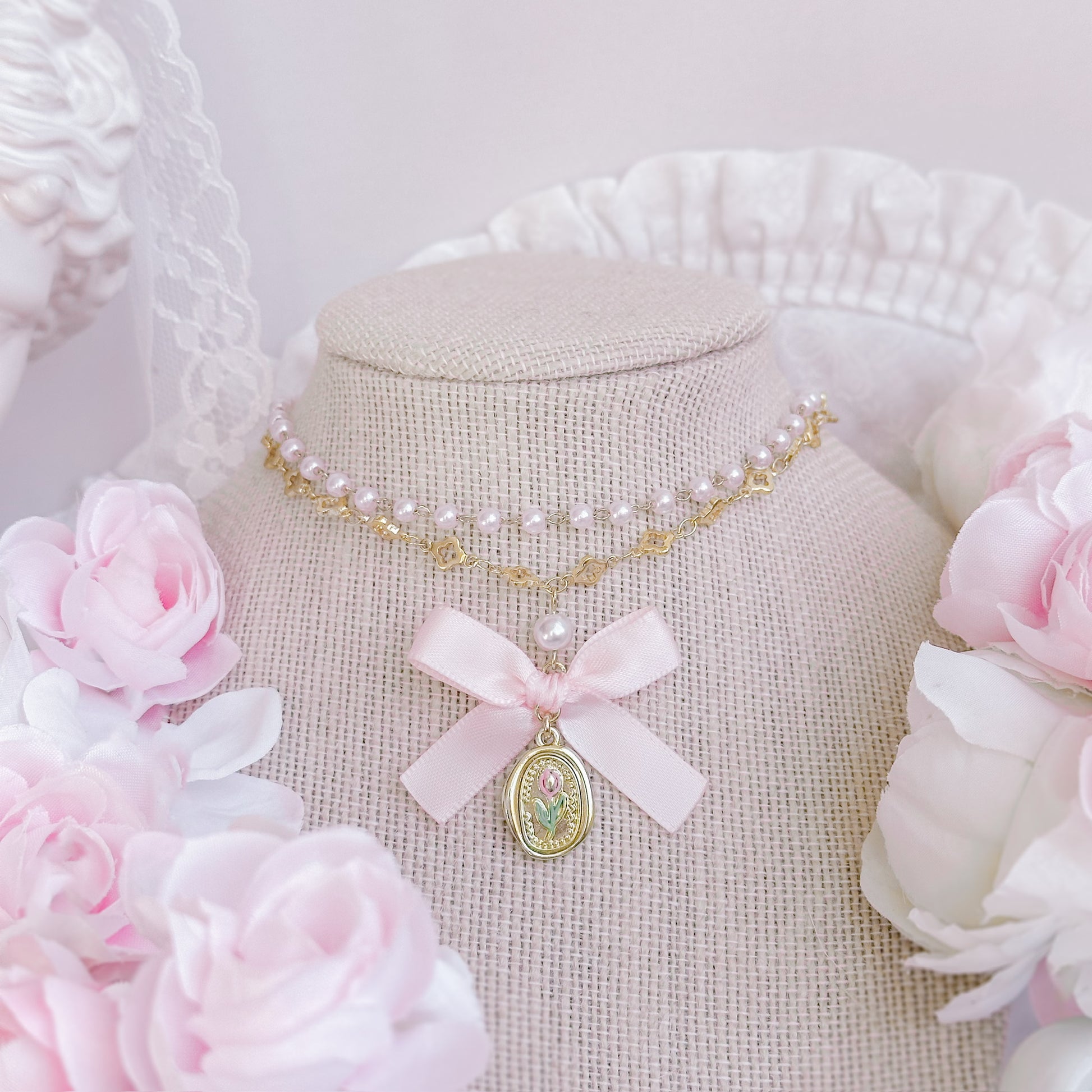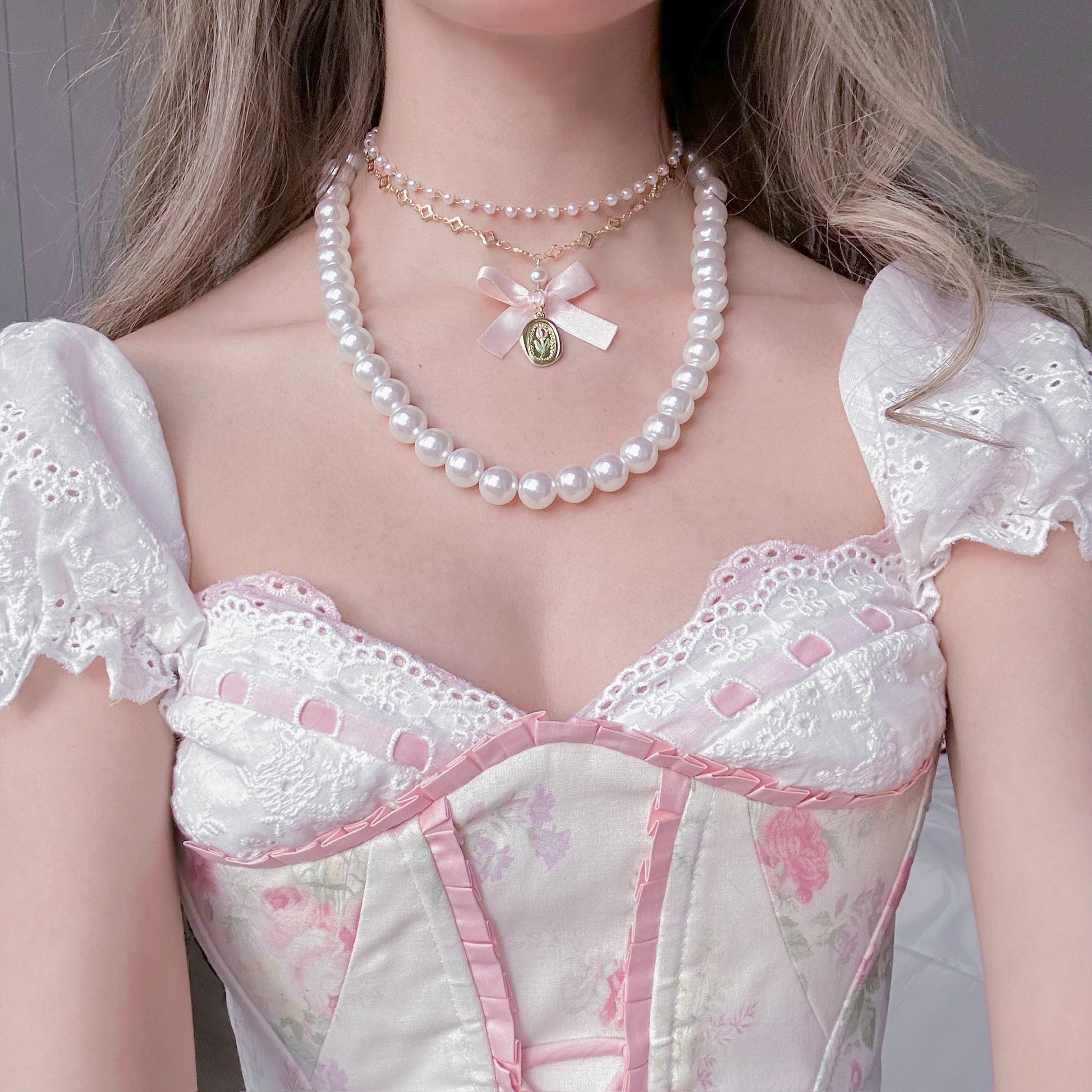 Double layered tulip necklace with pink bow.