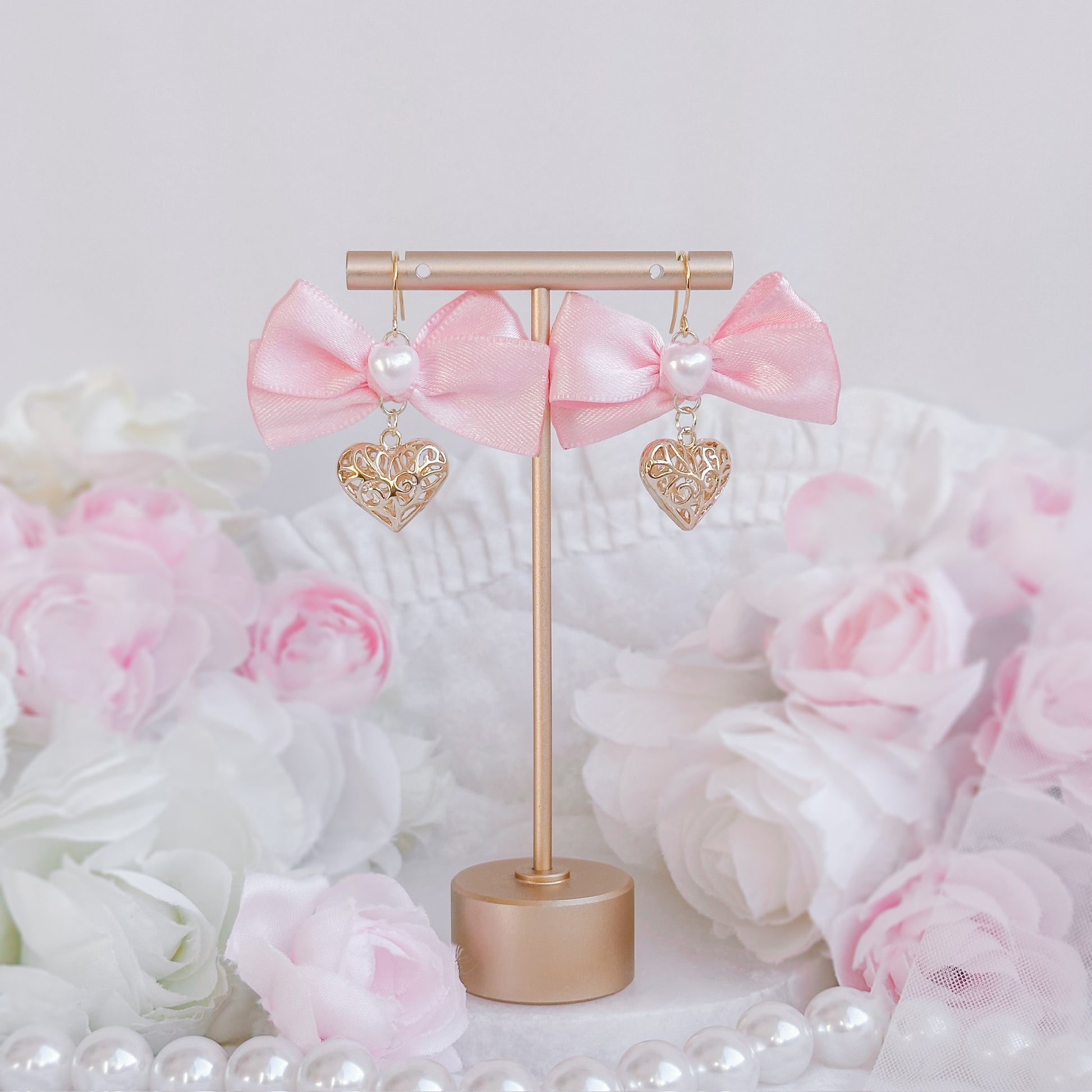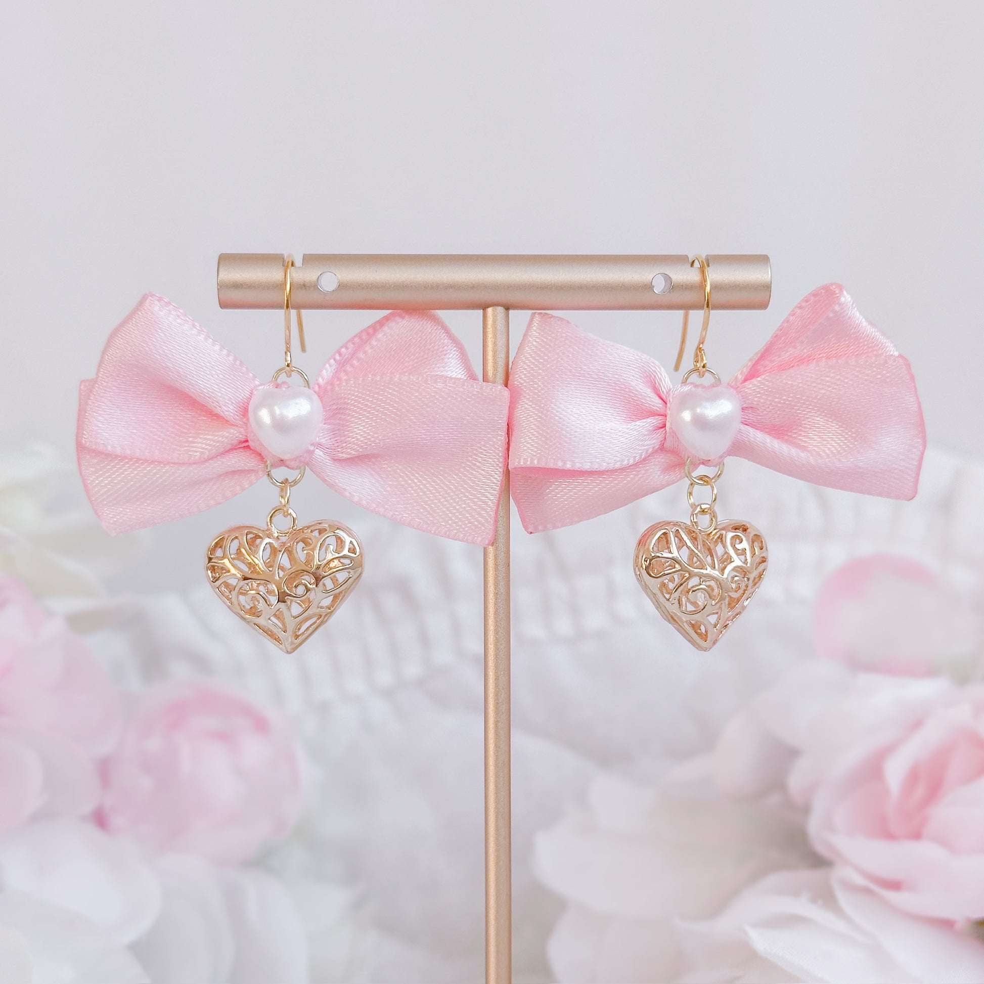 Pink satin gold heart earrings.