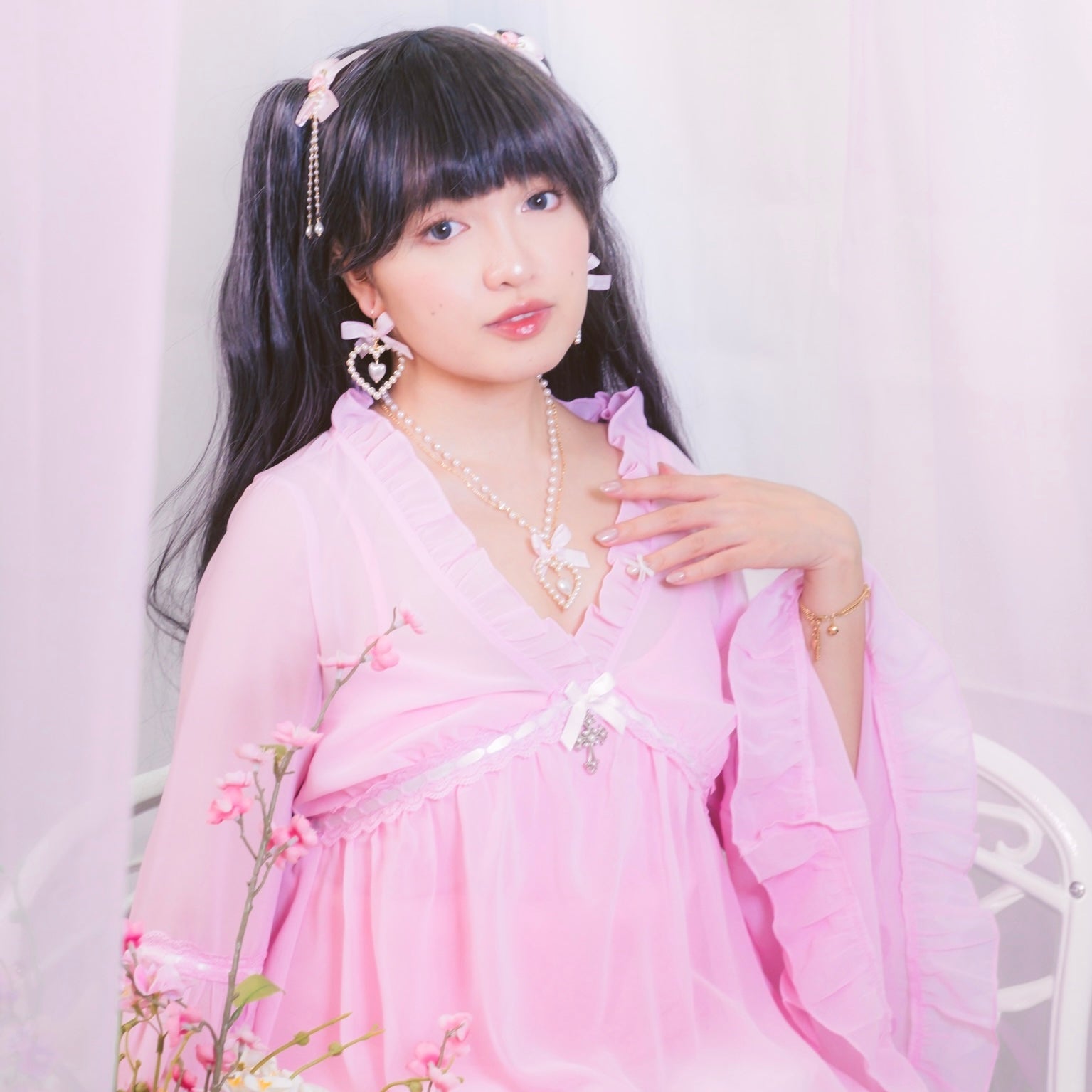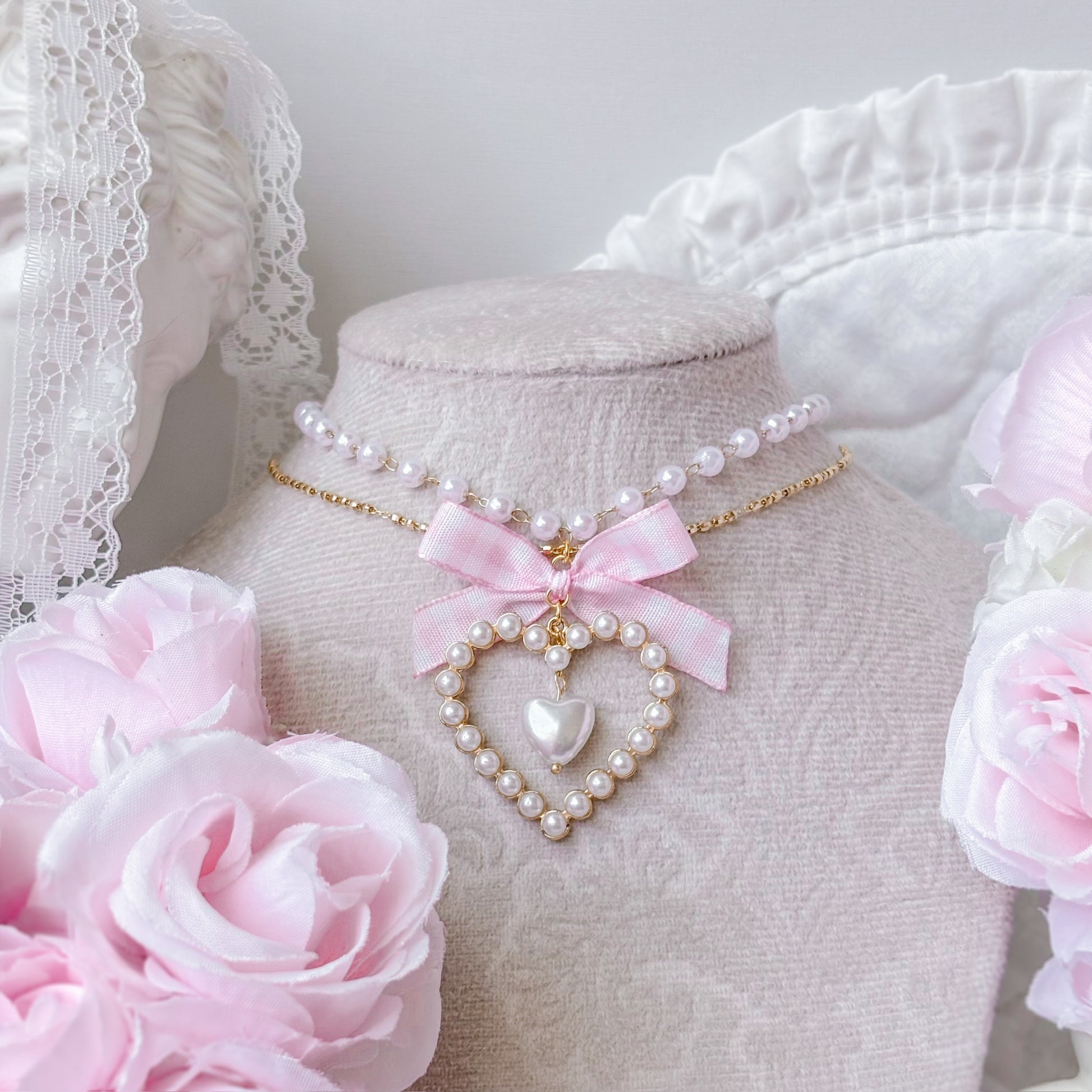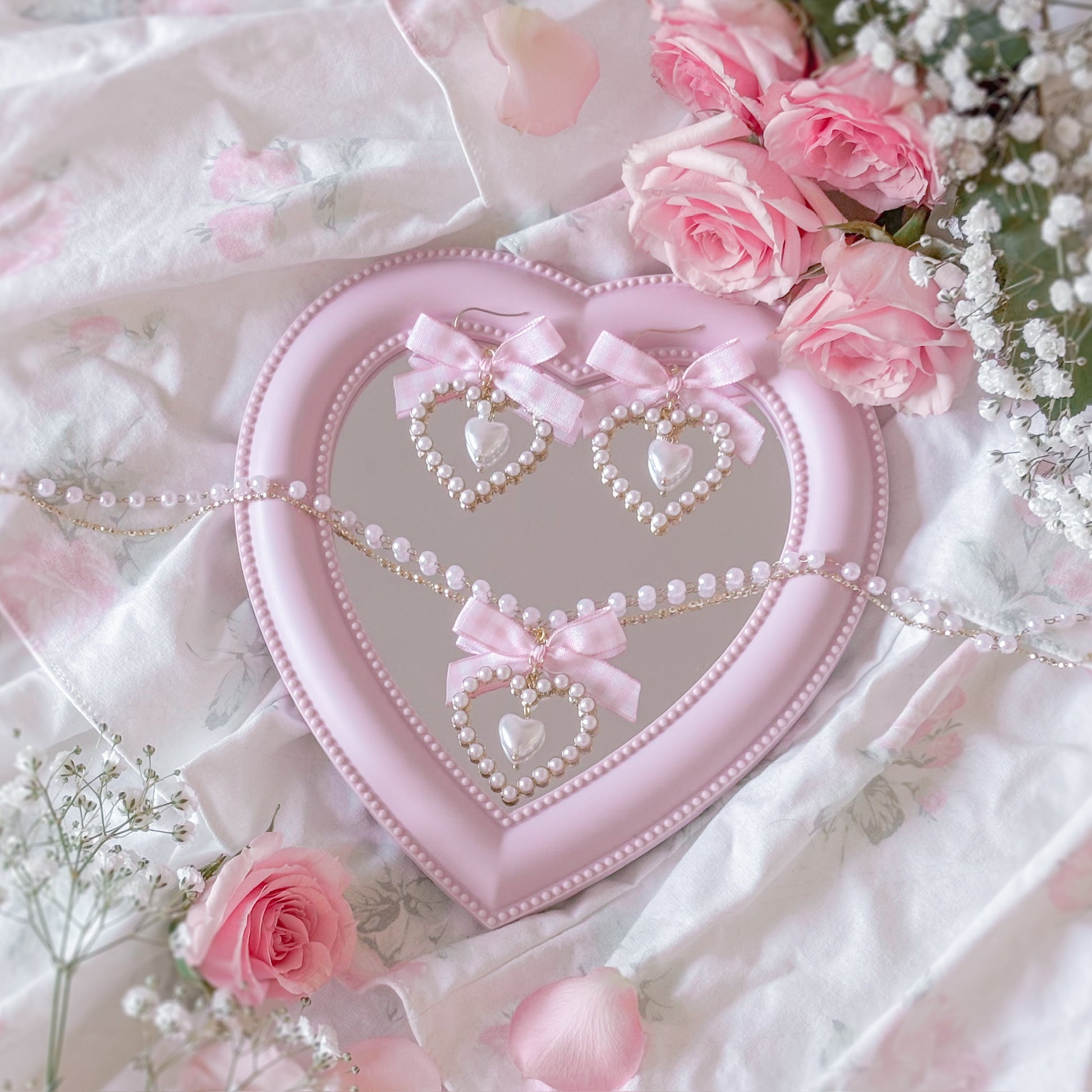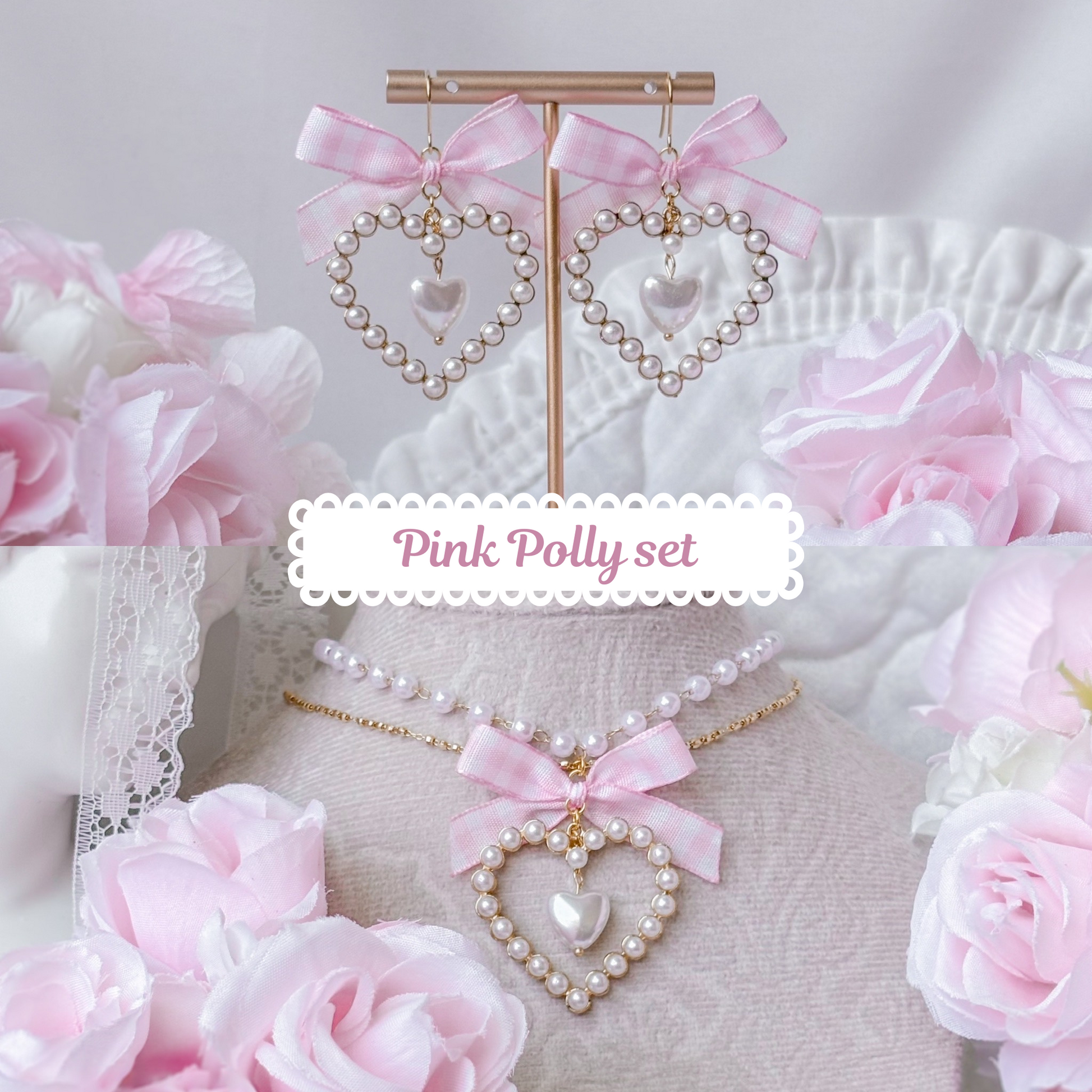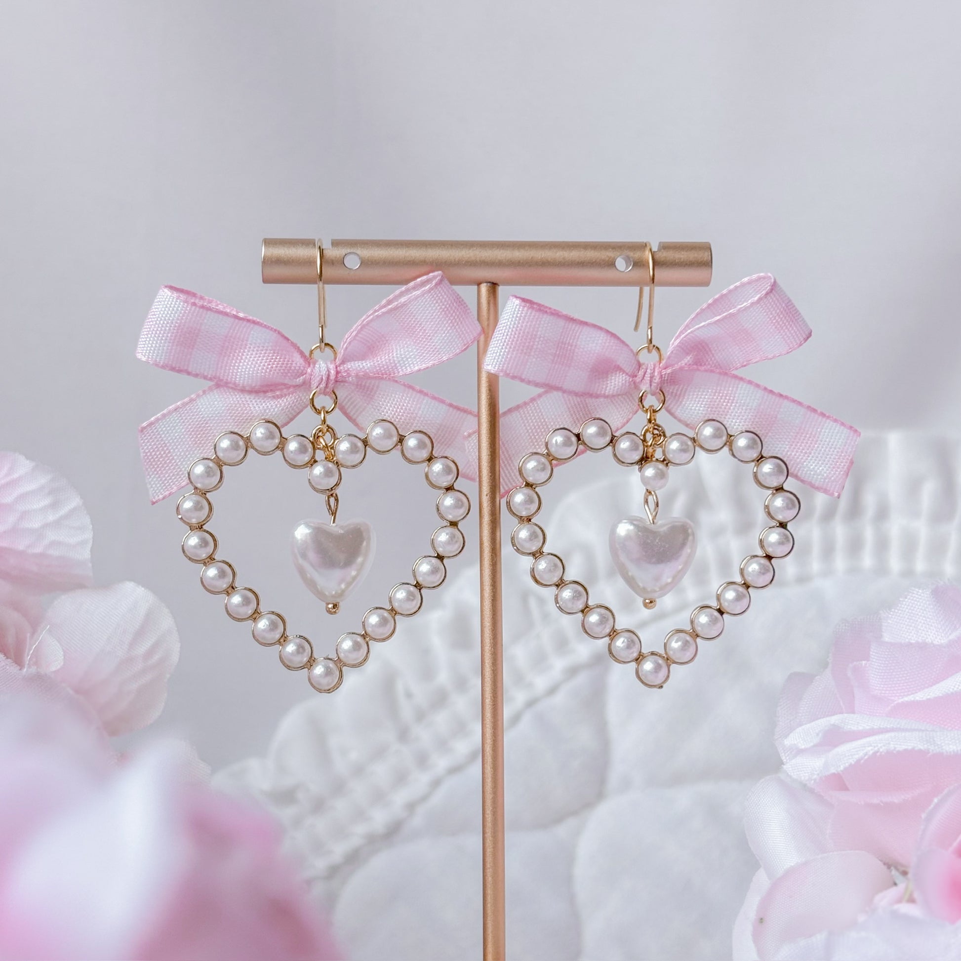 Pearl necklace with matching gingham heart earrings.