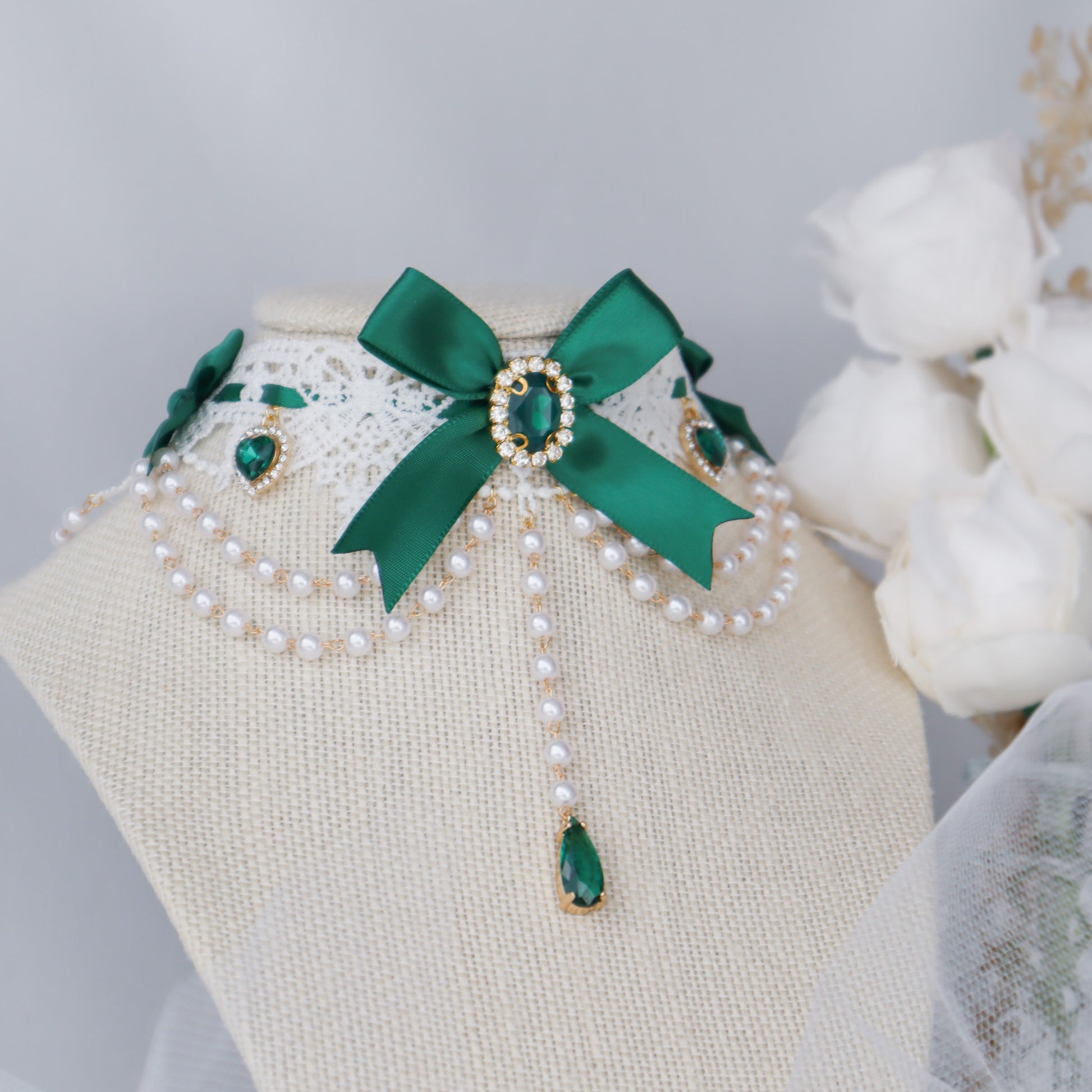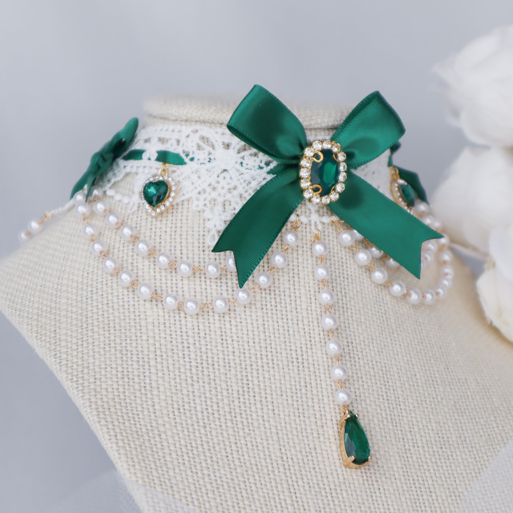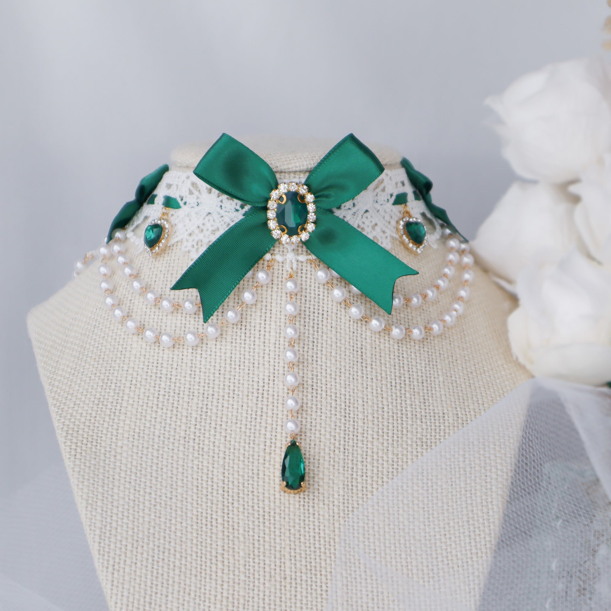 White lace choker with emerald satin ribbon and pearl chain.