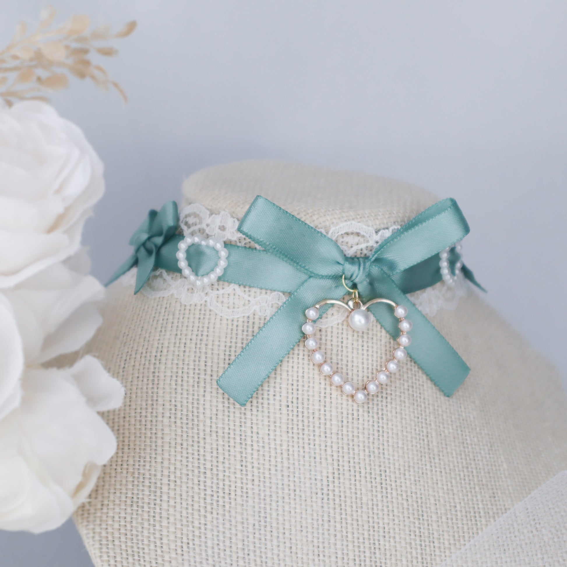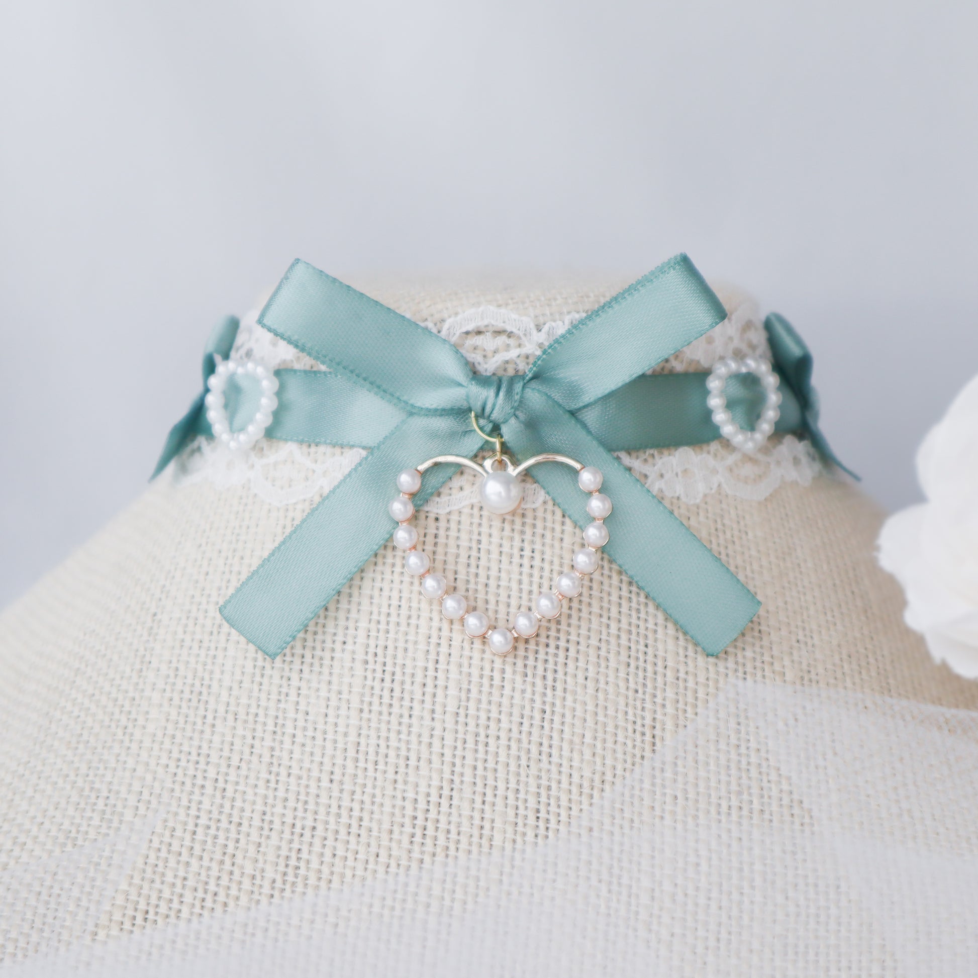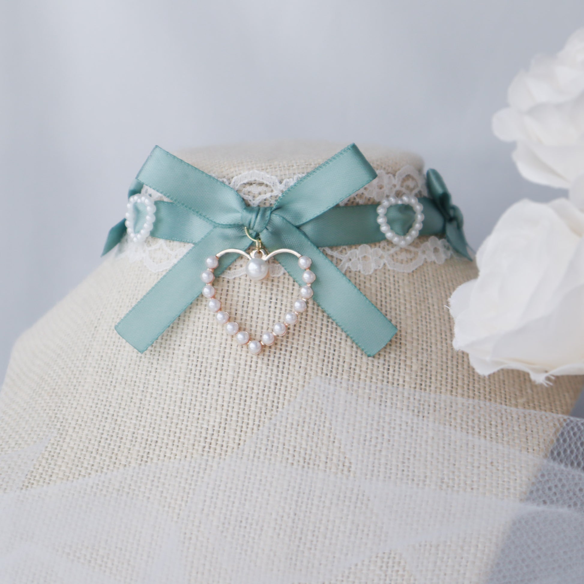 White lace choker with sage satin ribbon and pearl heart charms.