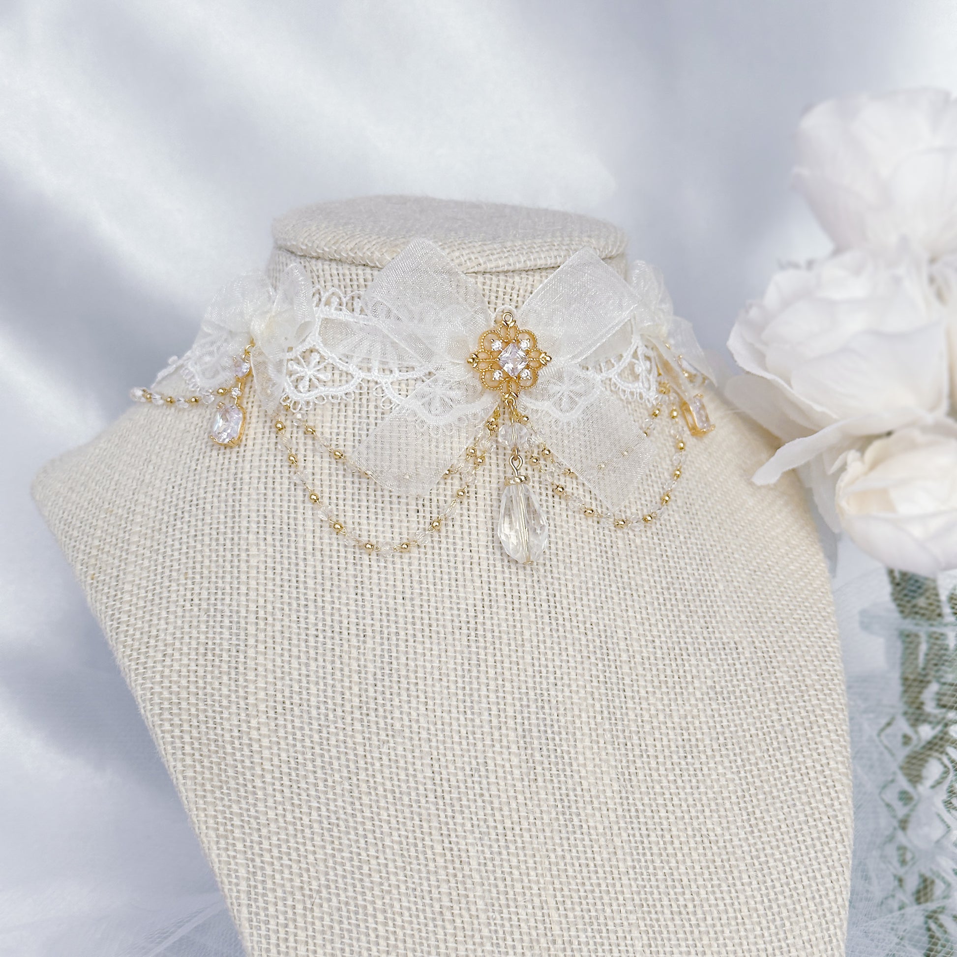 White lace choker with sheer ribbon and crystal chain.
