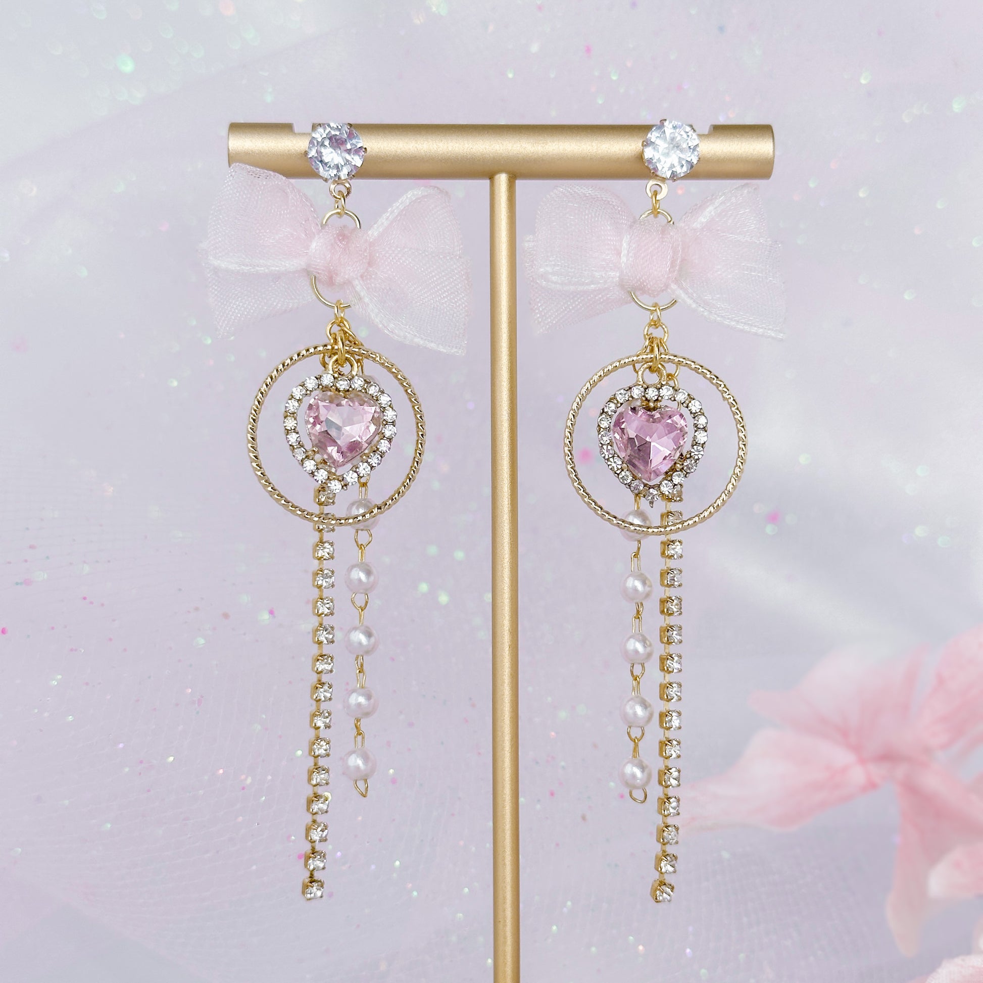 Pink sheer bow earrings with crystal chain.