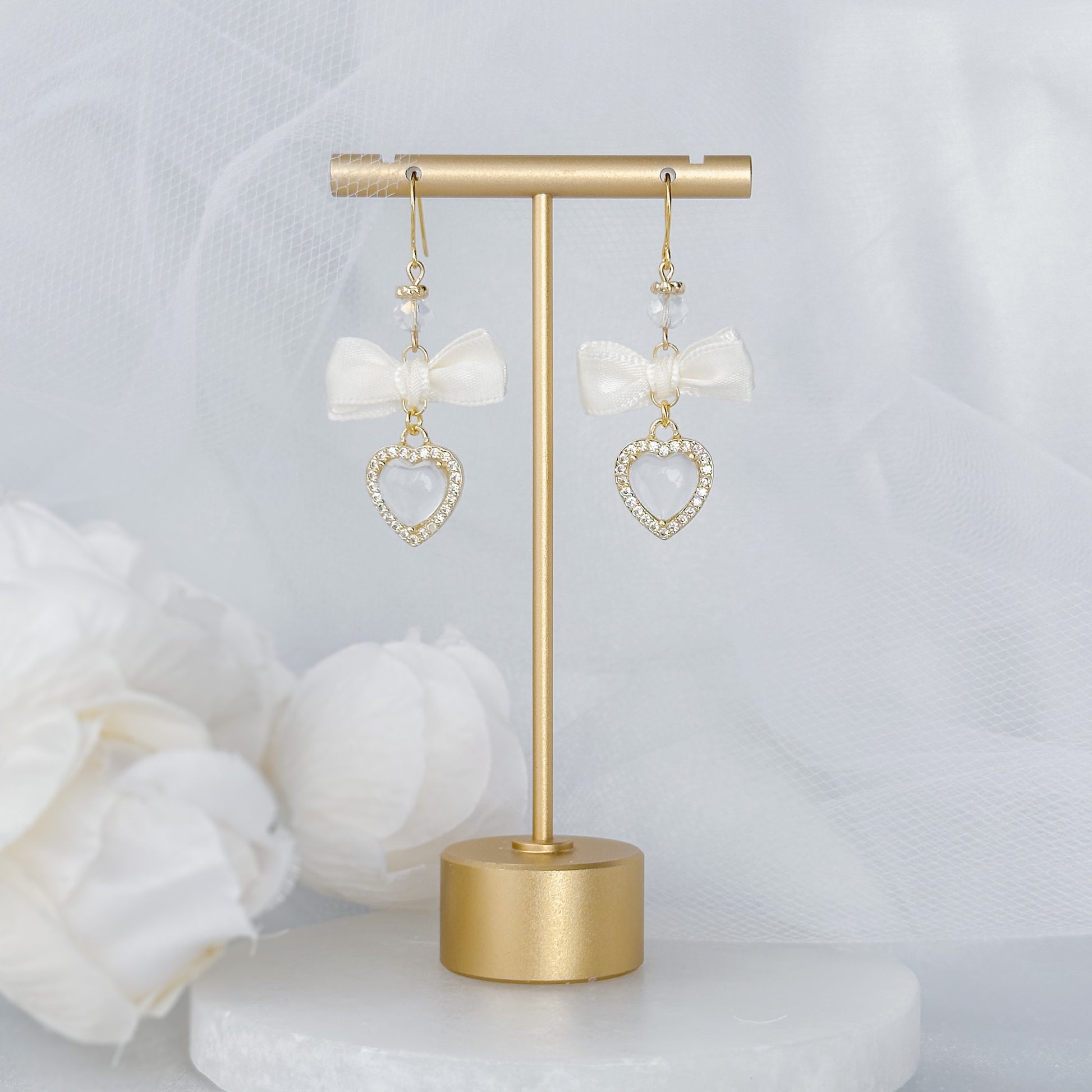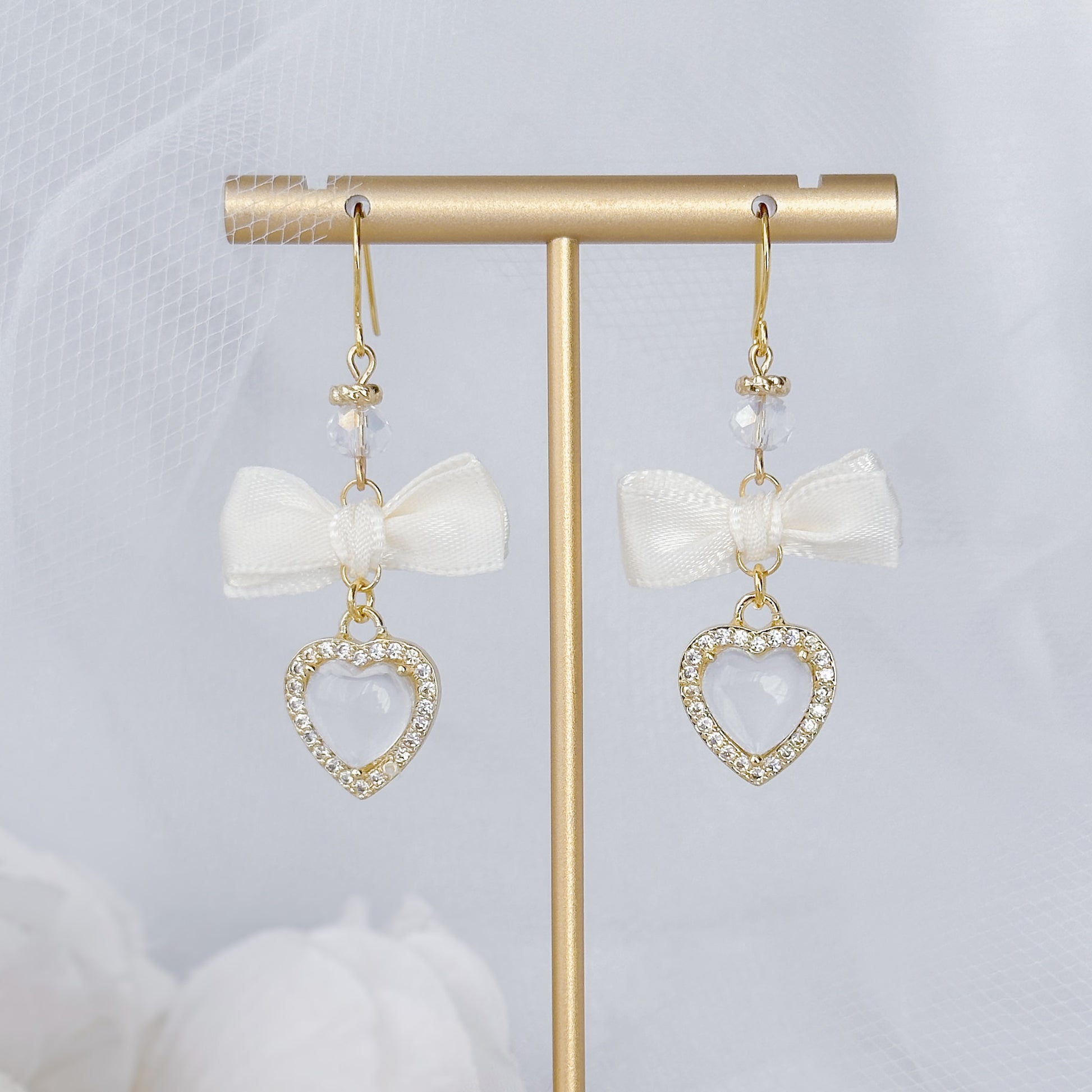Satin bow earrings with heart charm.