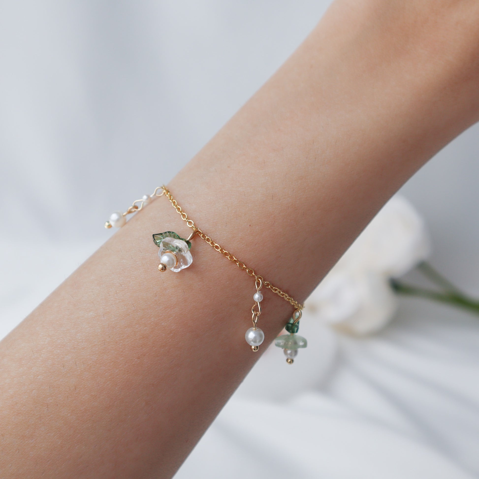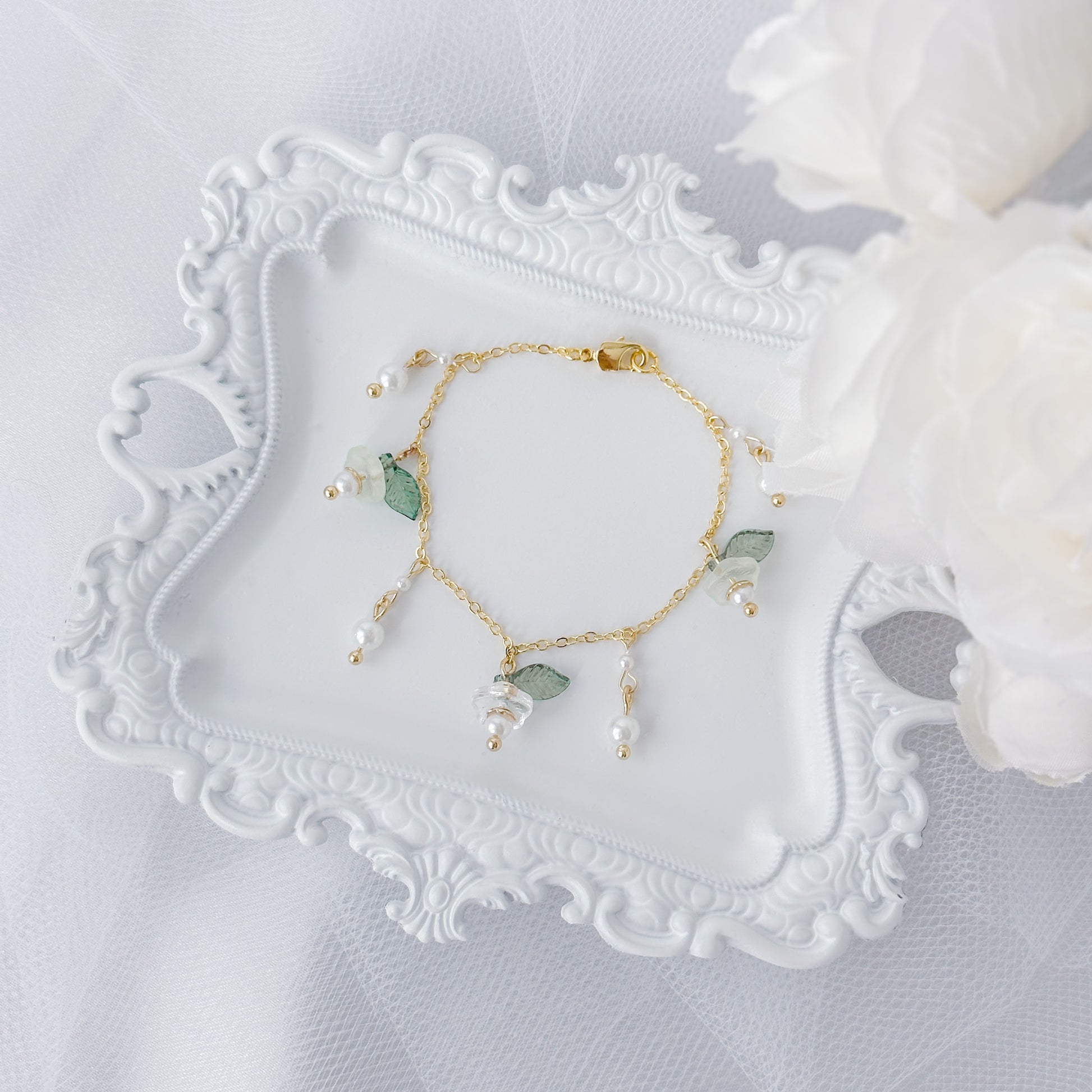 Tea green and clear floral bead bracelet.