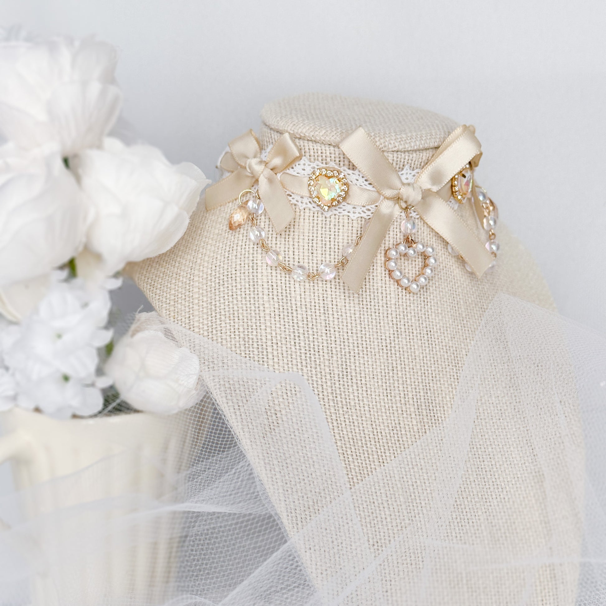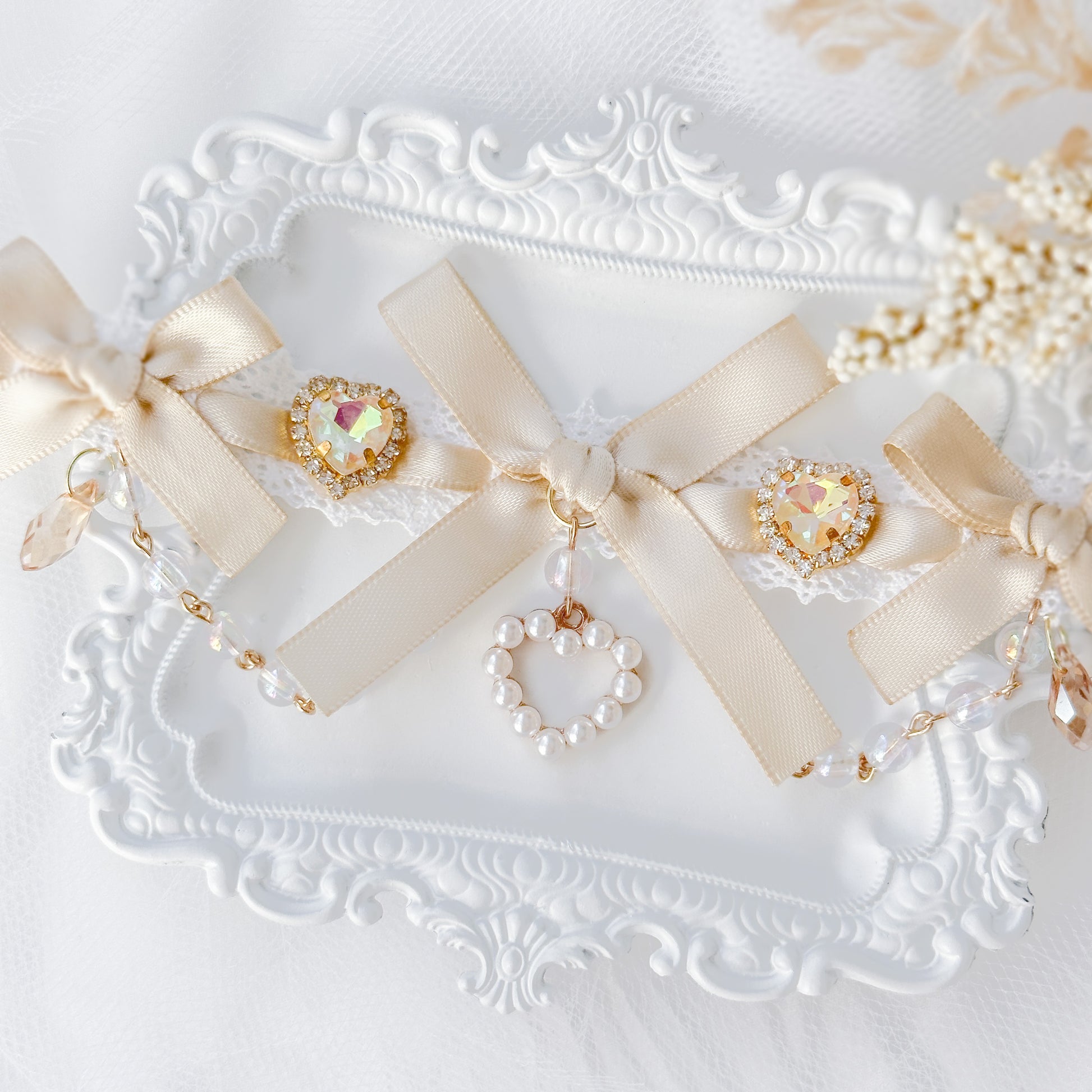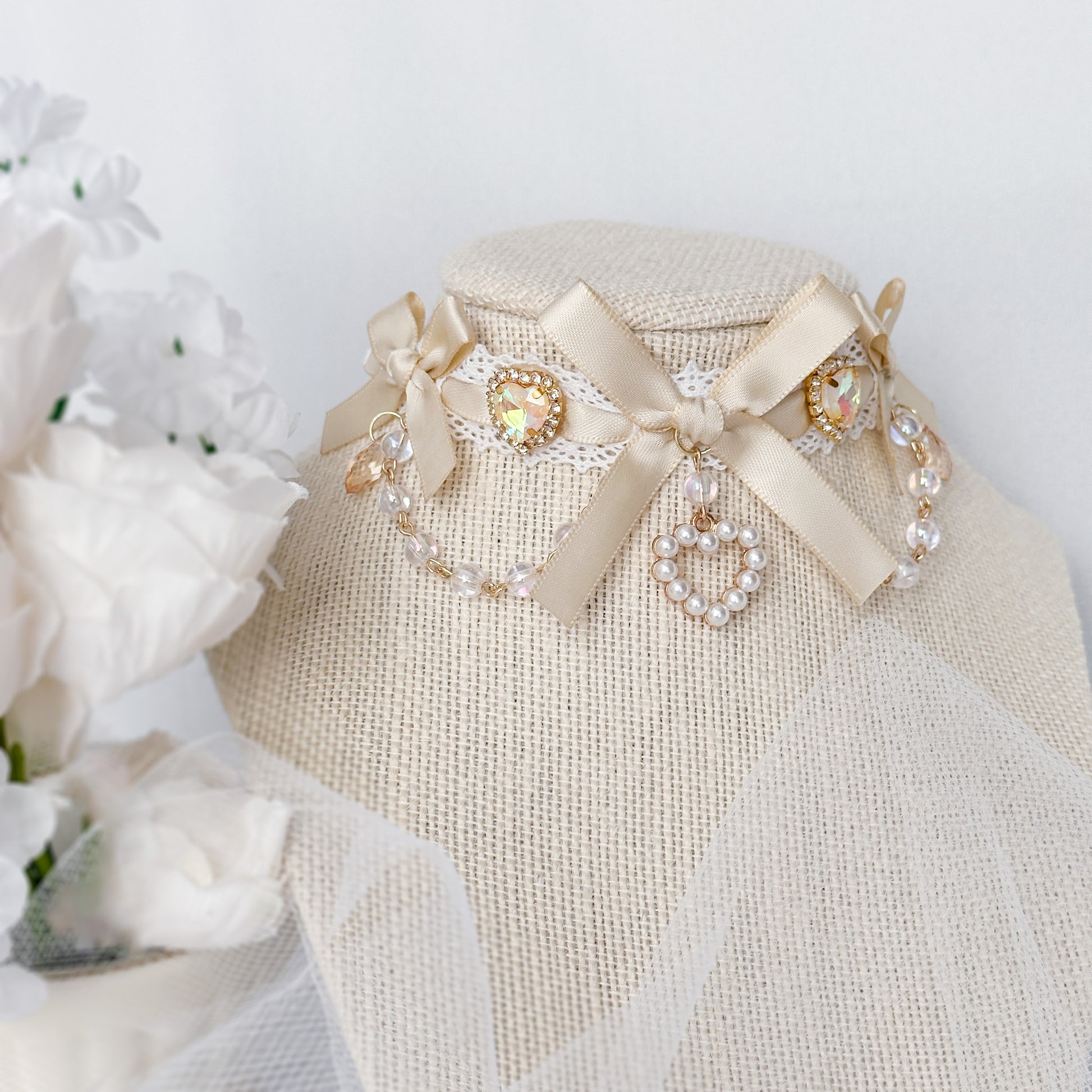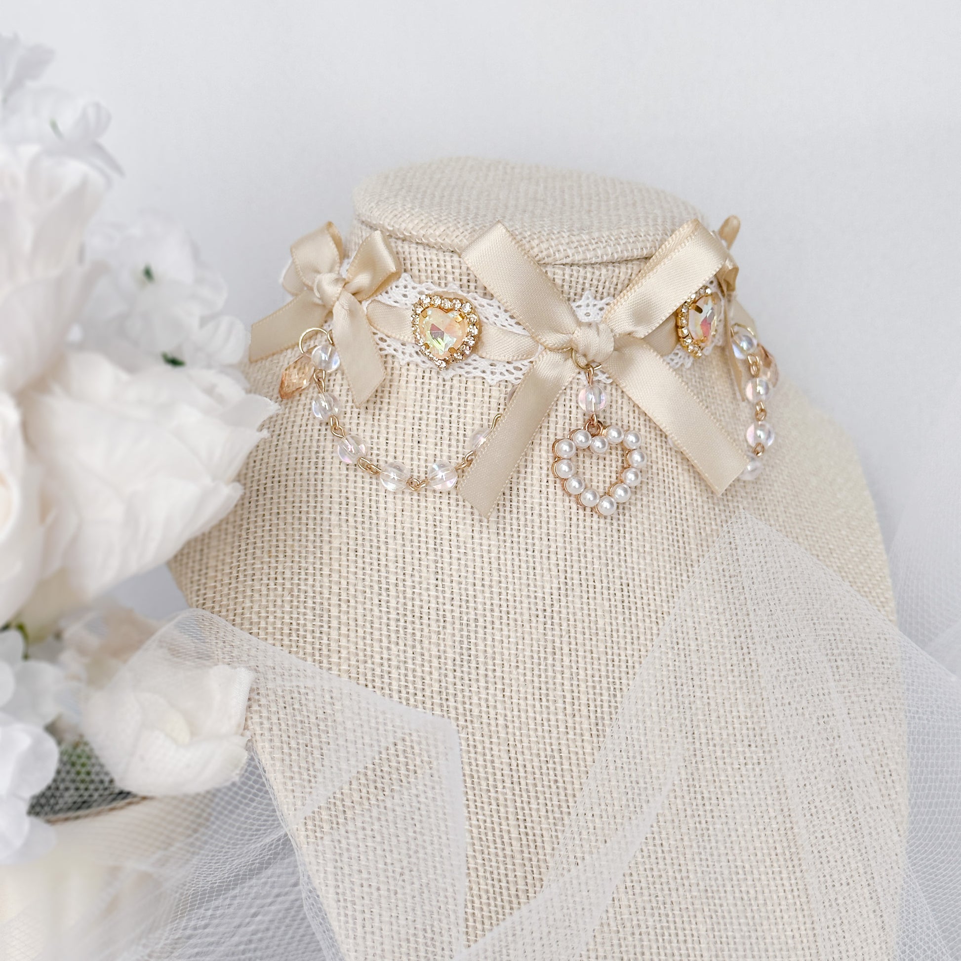 Lace choker with sandy satin ribbon and heart charms.