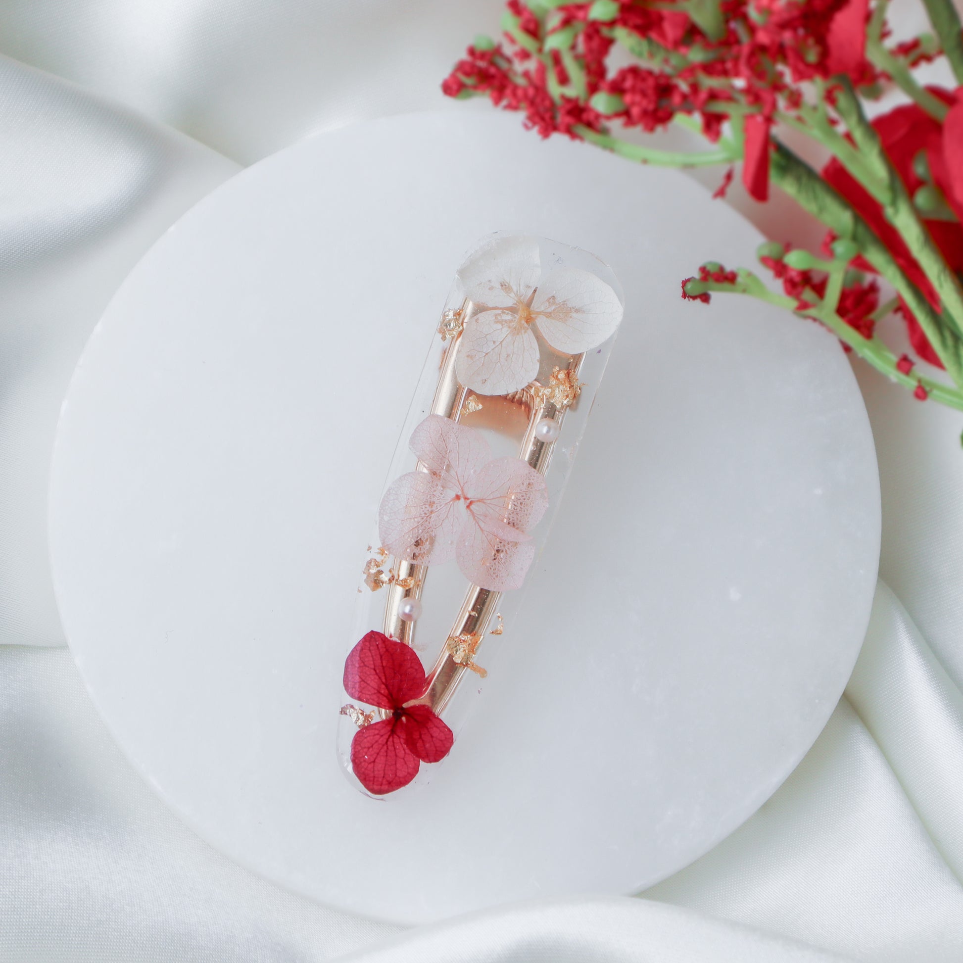 Hairclip with white, red and pink hydrangeas preserved in bio resin.