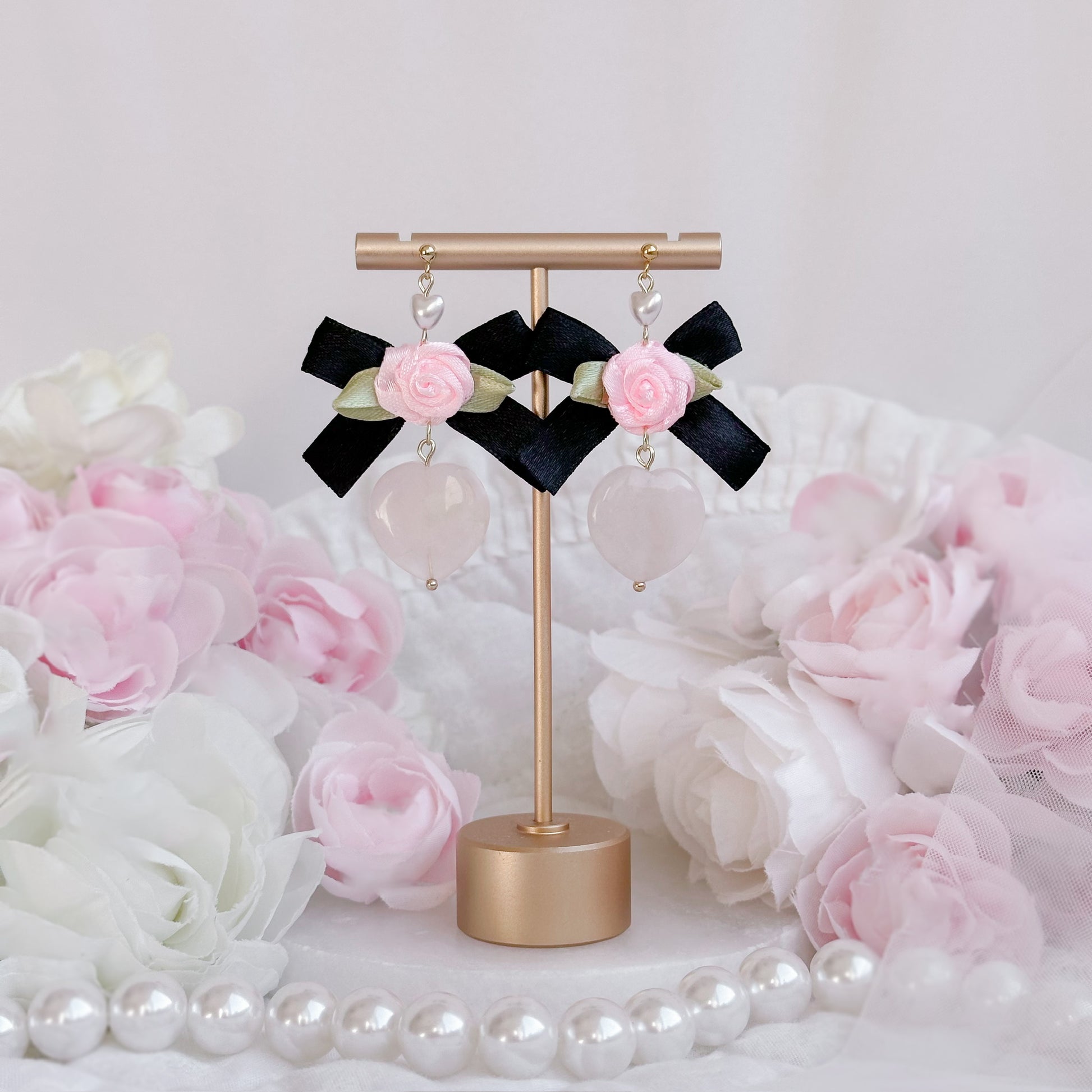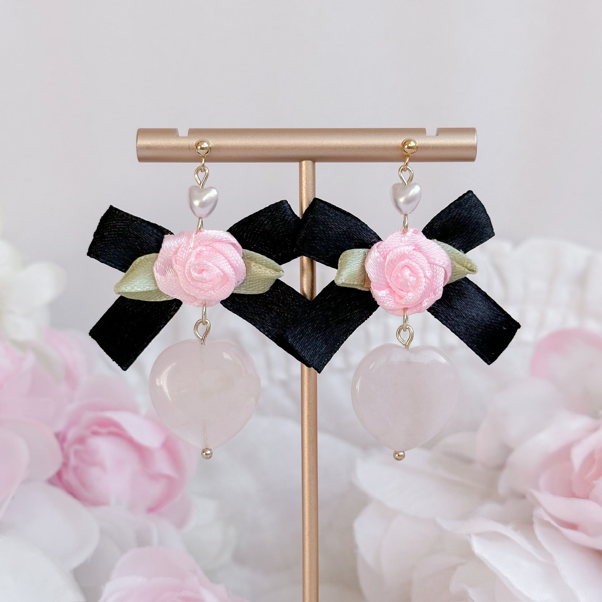 Satin black bow earrings with glass heart.