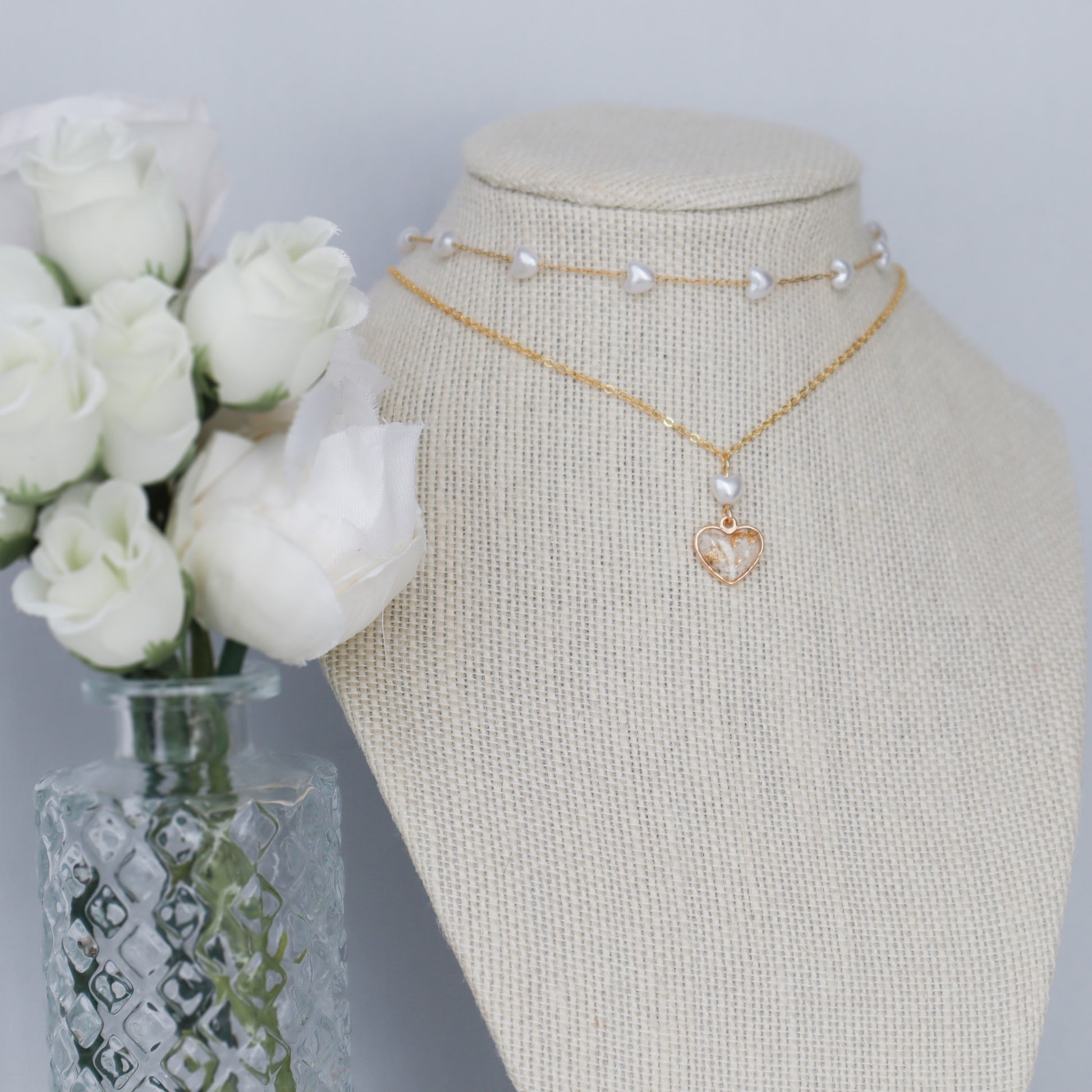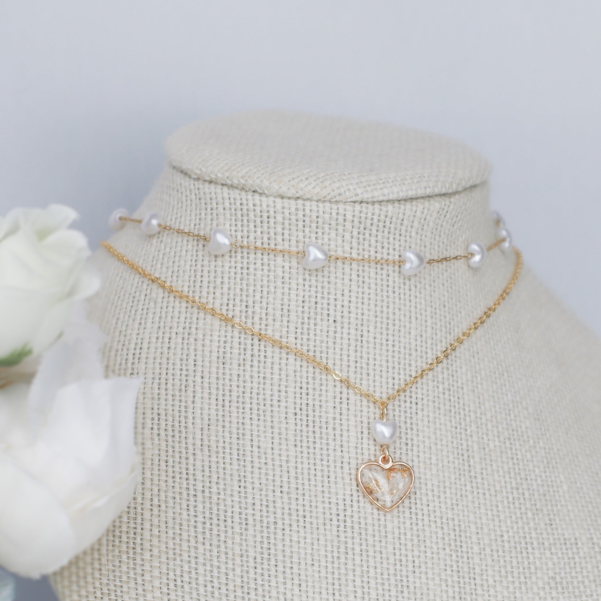 Layered necklace with heart chain and charm with sm white preserved flowers in bio resin.