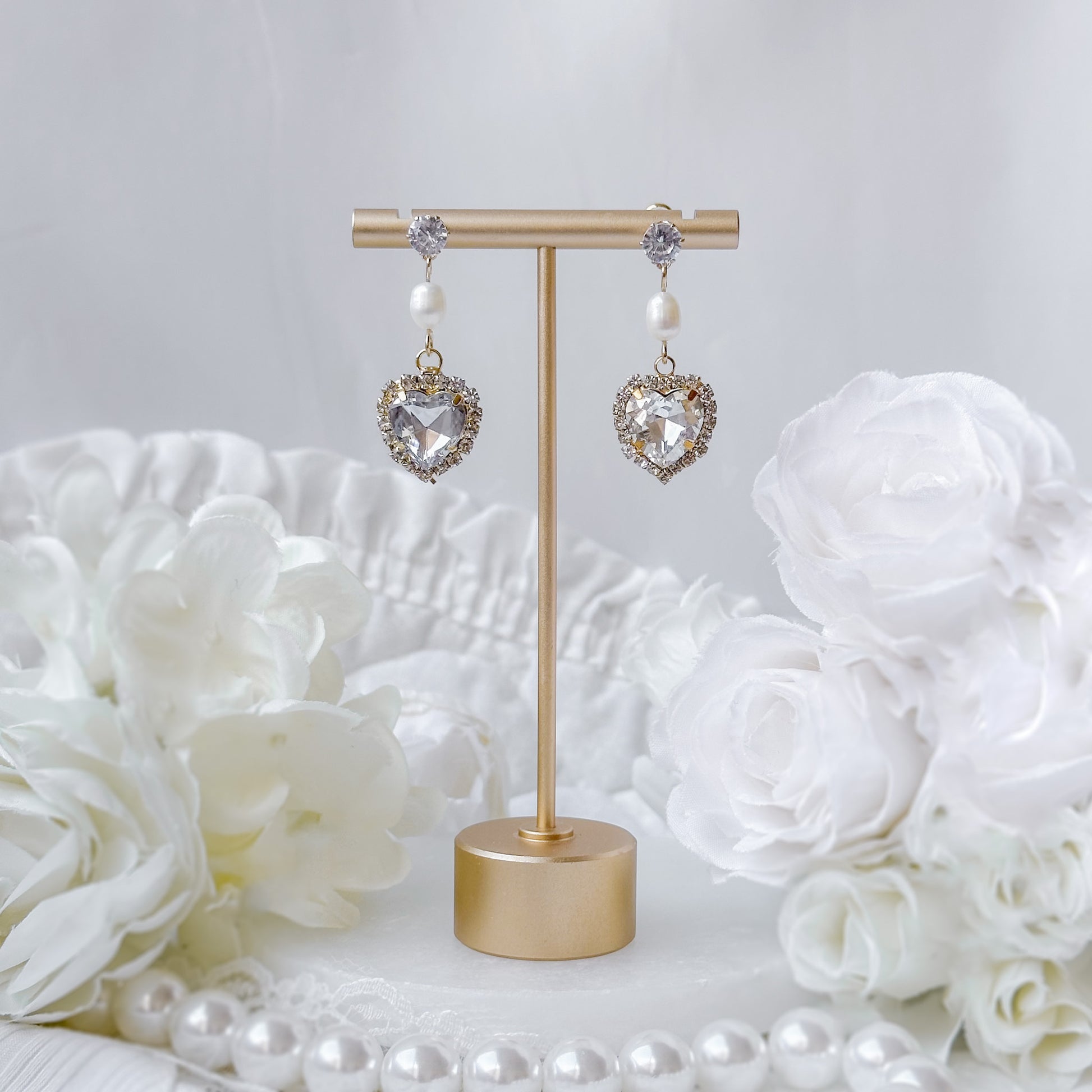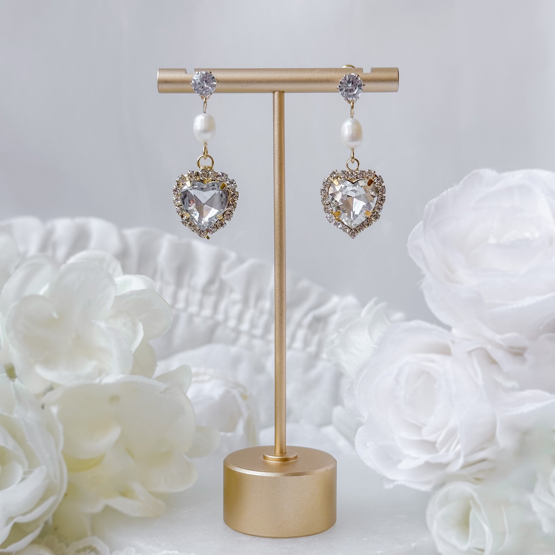 Crystal heart earrings with freshwater pearl.