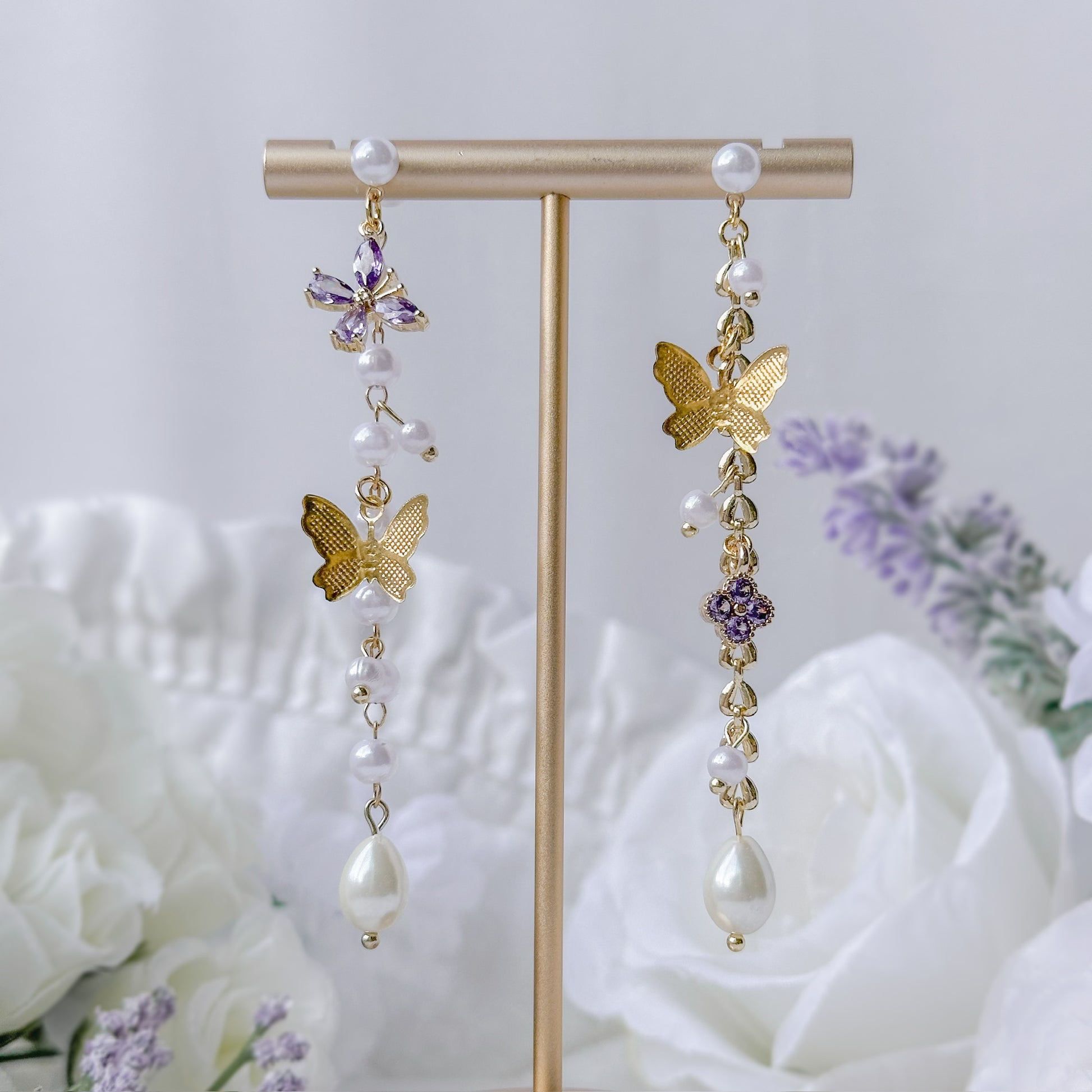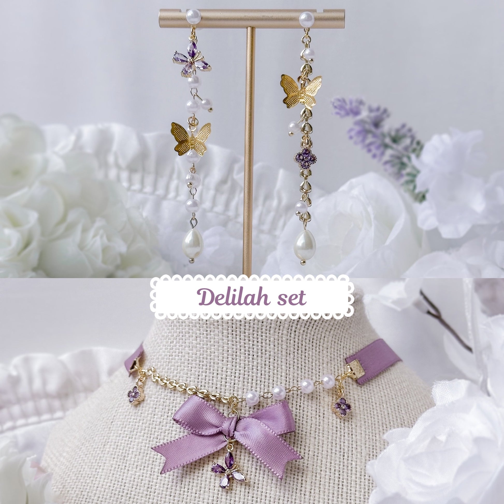 Lavender satin ribbon choker with butterfly and pearl chain.
