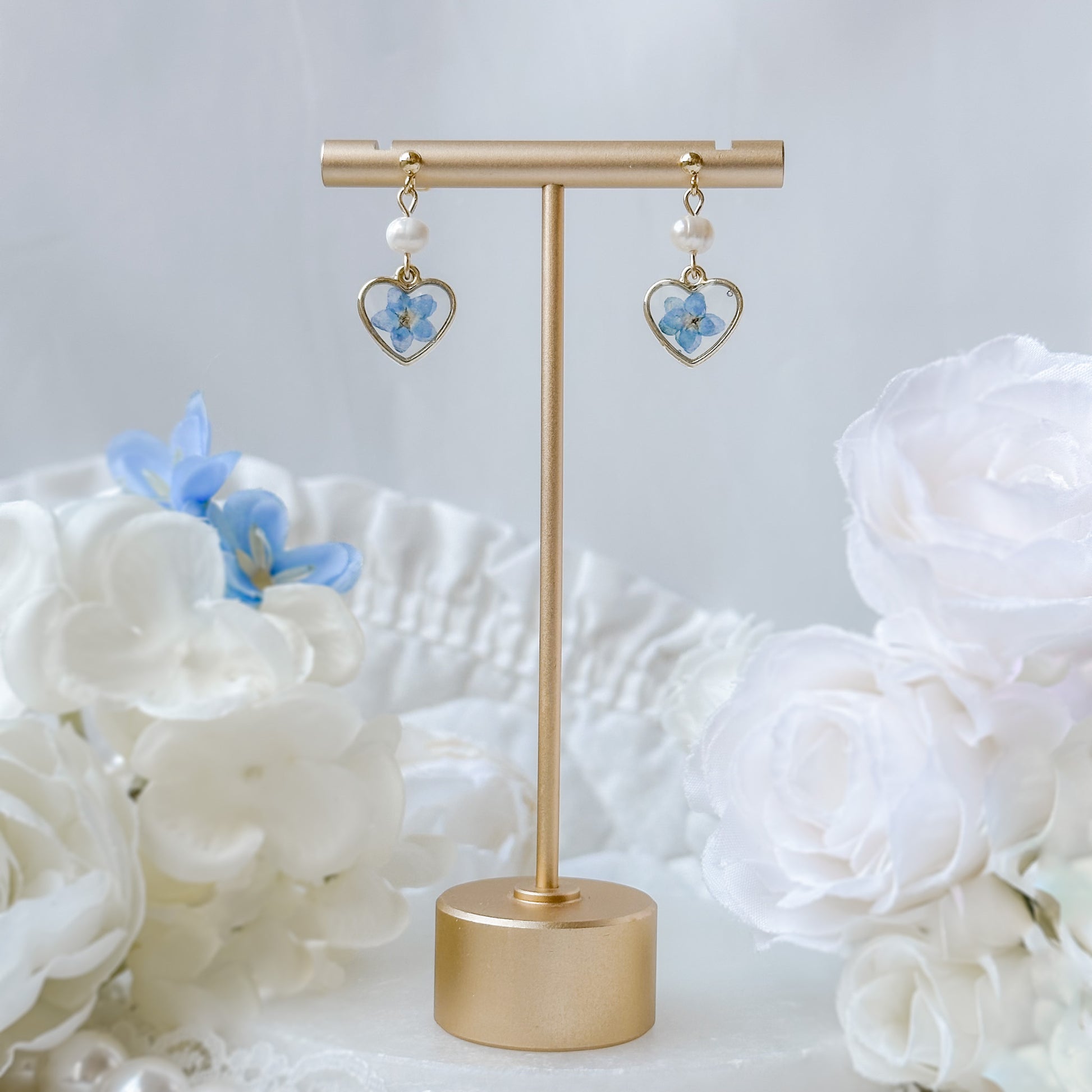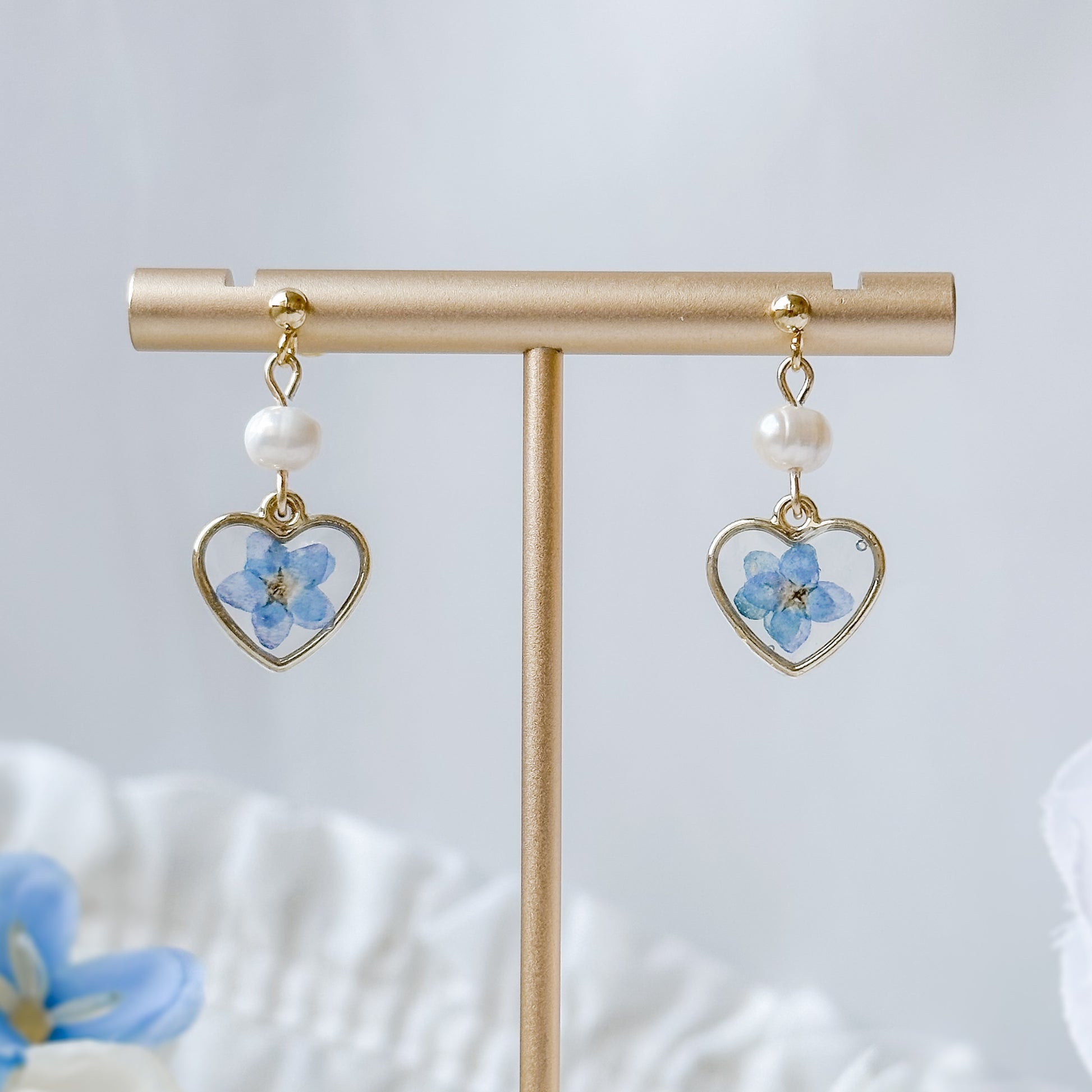 Preserved forget me not earrings with freshwater pearls.
