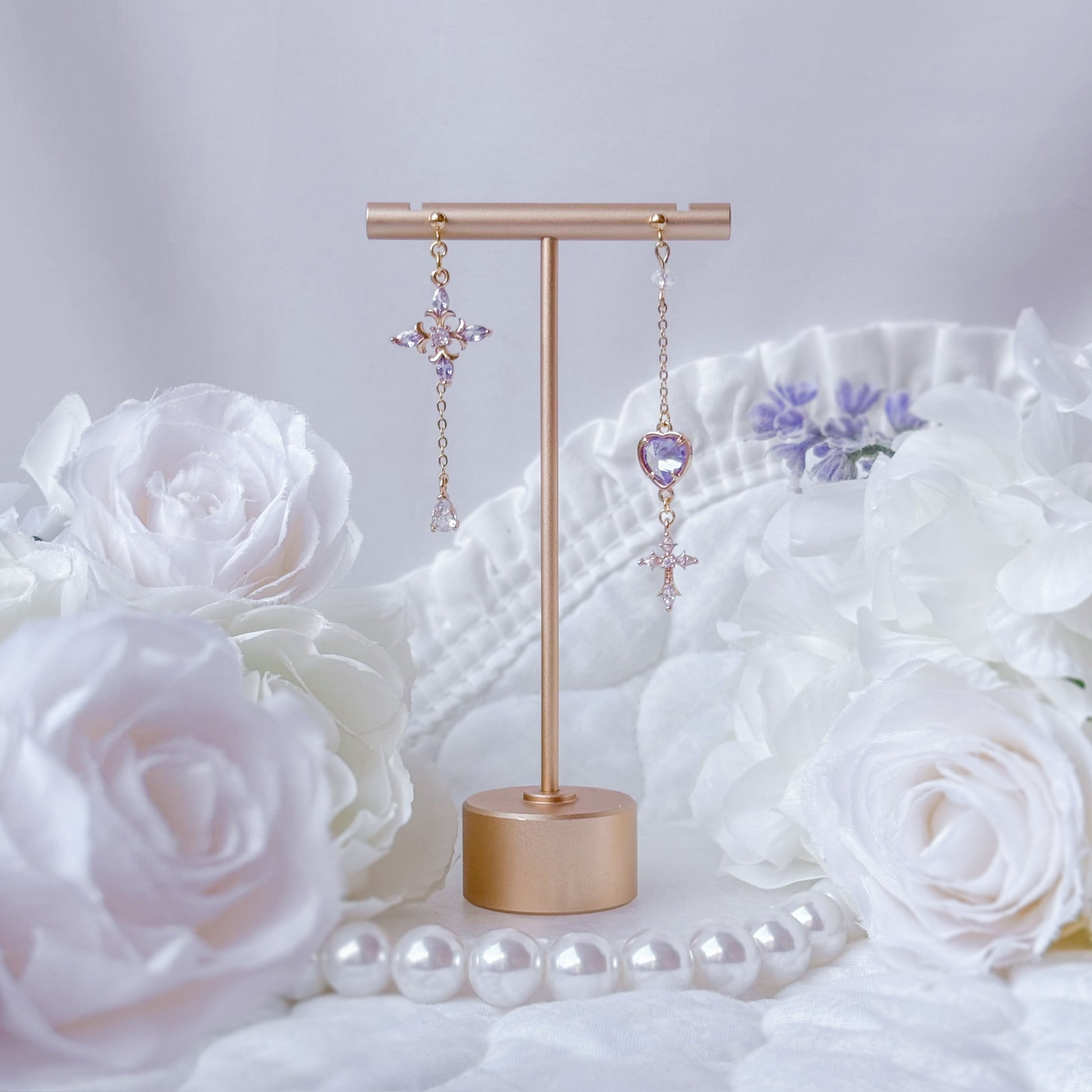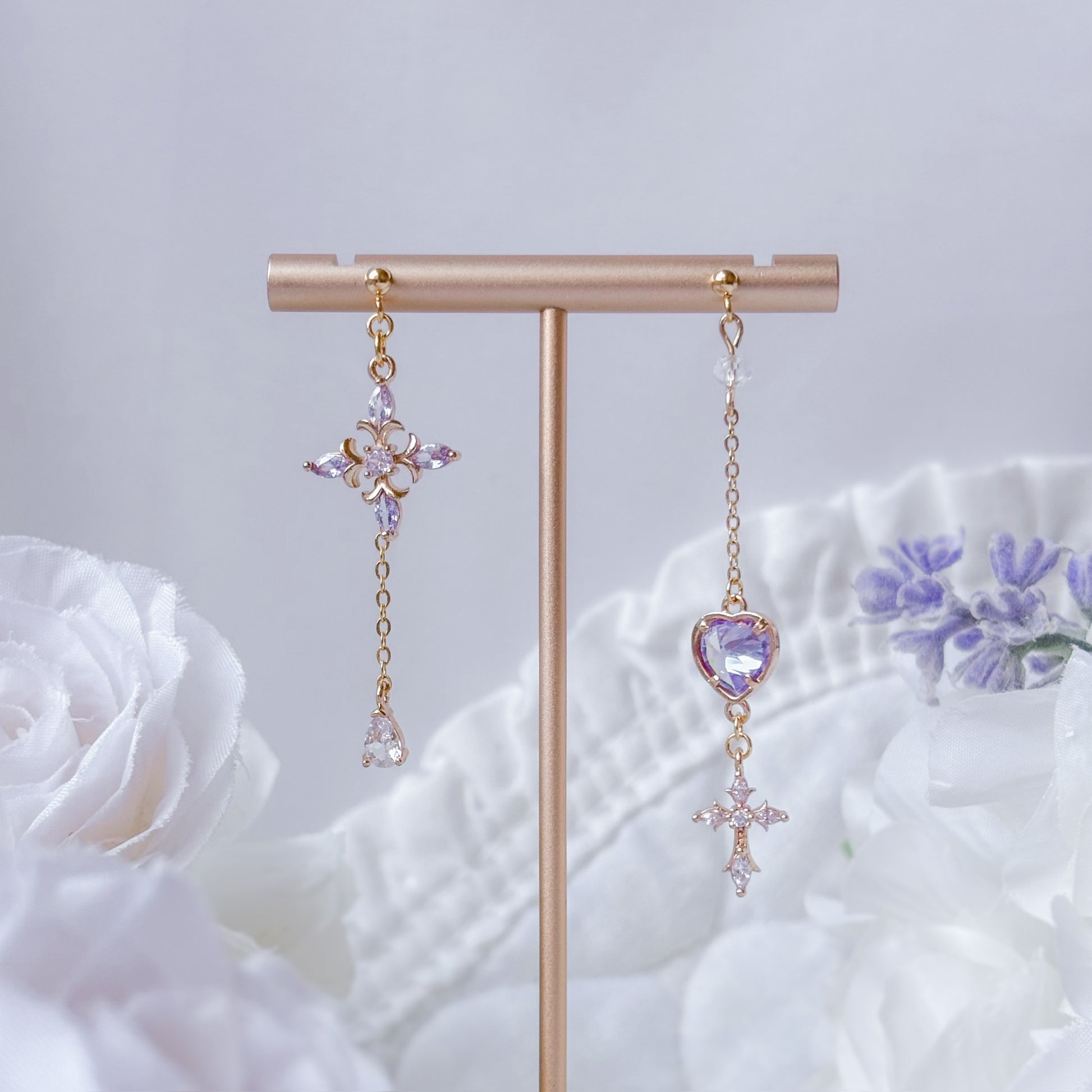 Asymmetrical purple crystal earrings.
