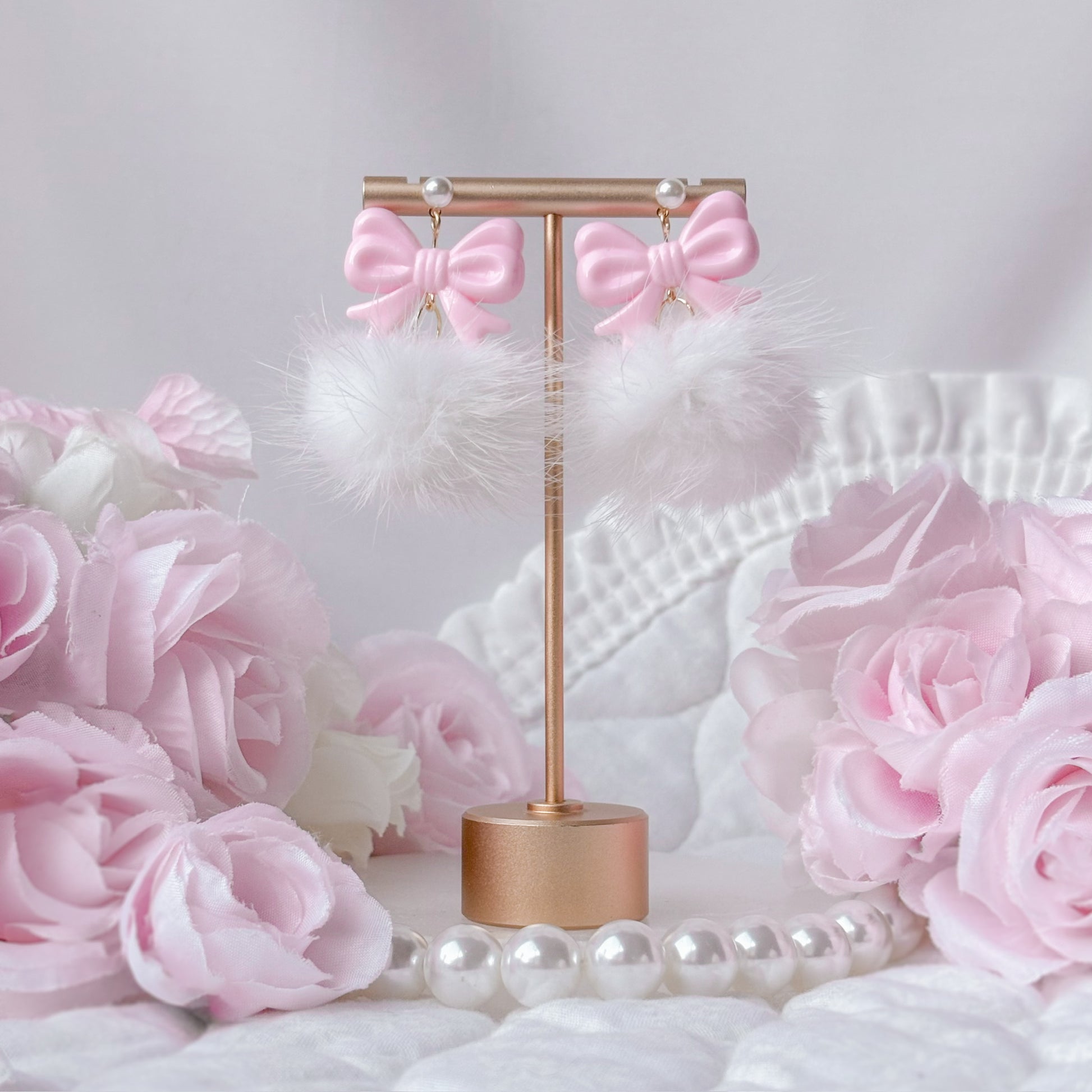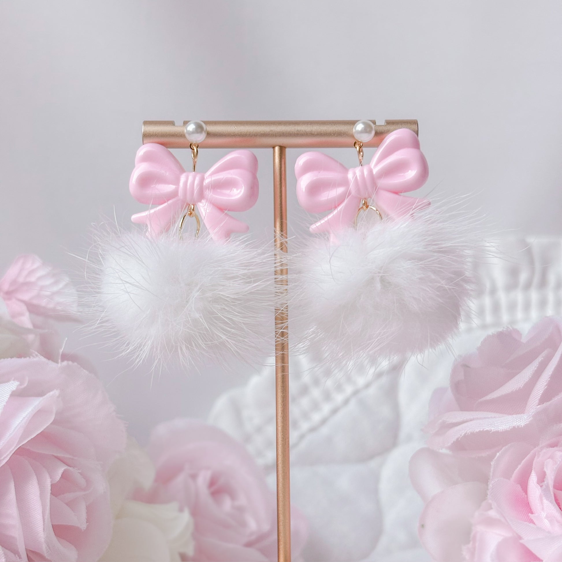White puff earrings with pink bow bead.