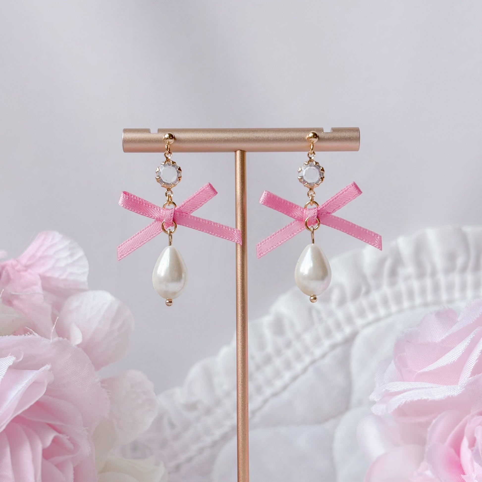 Pink bow earrings.