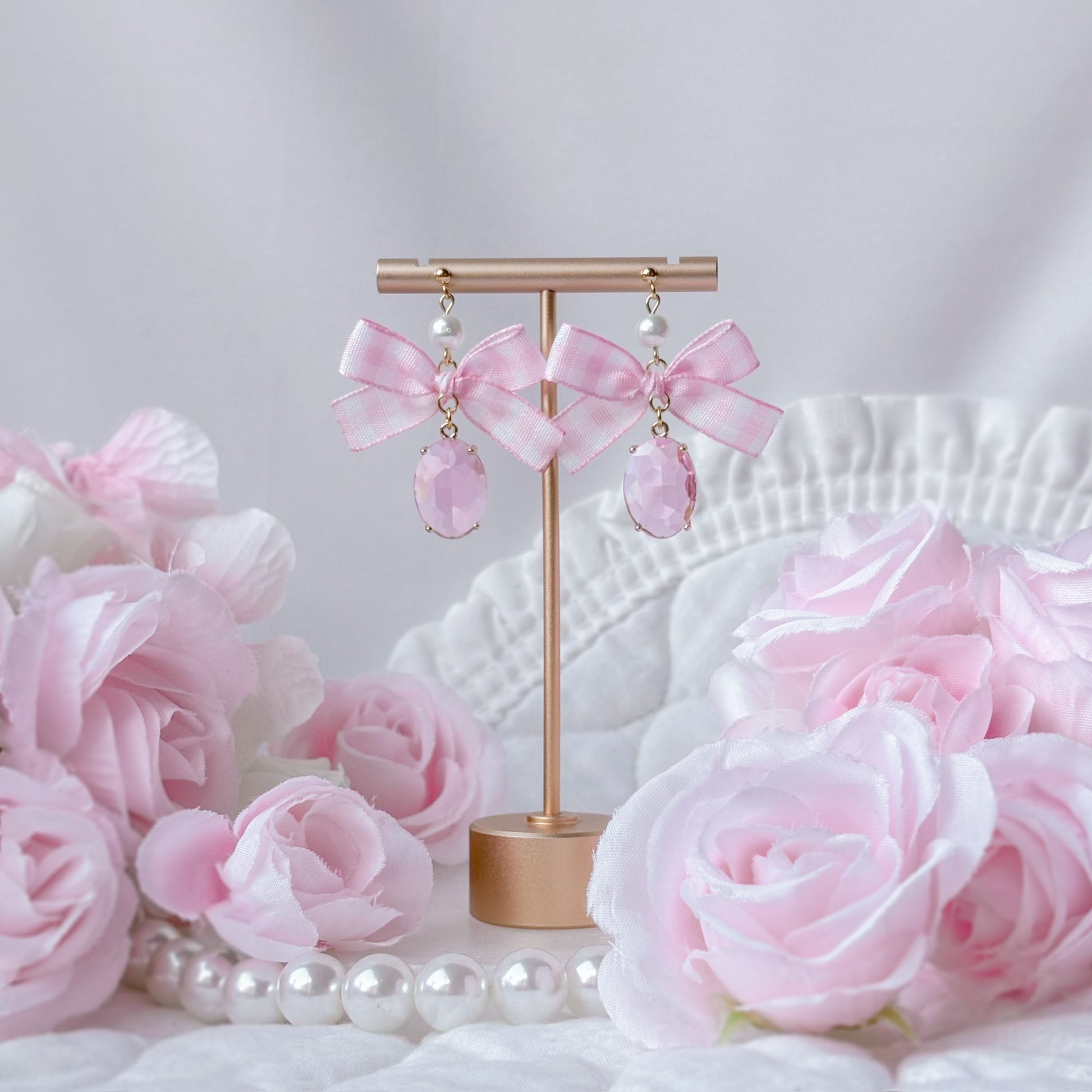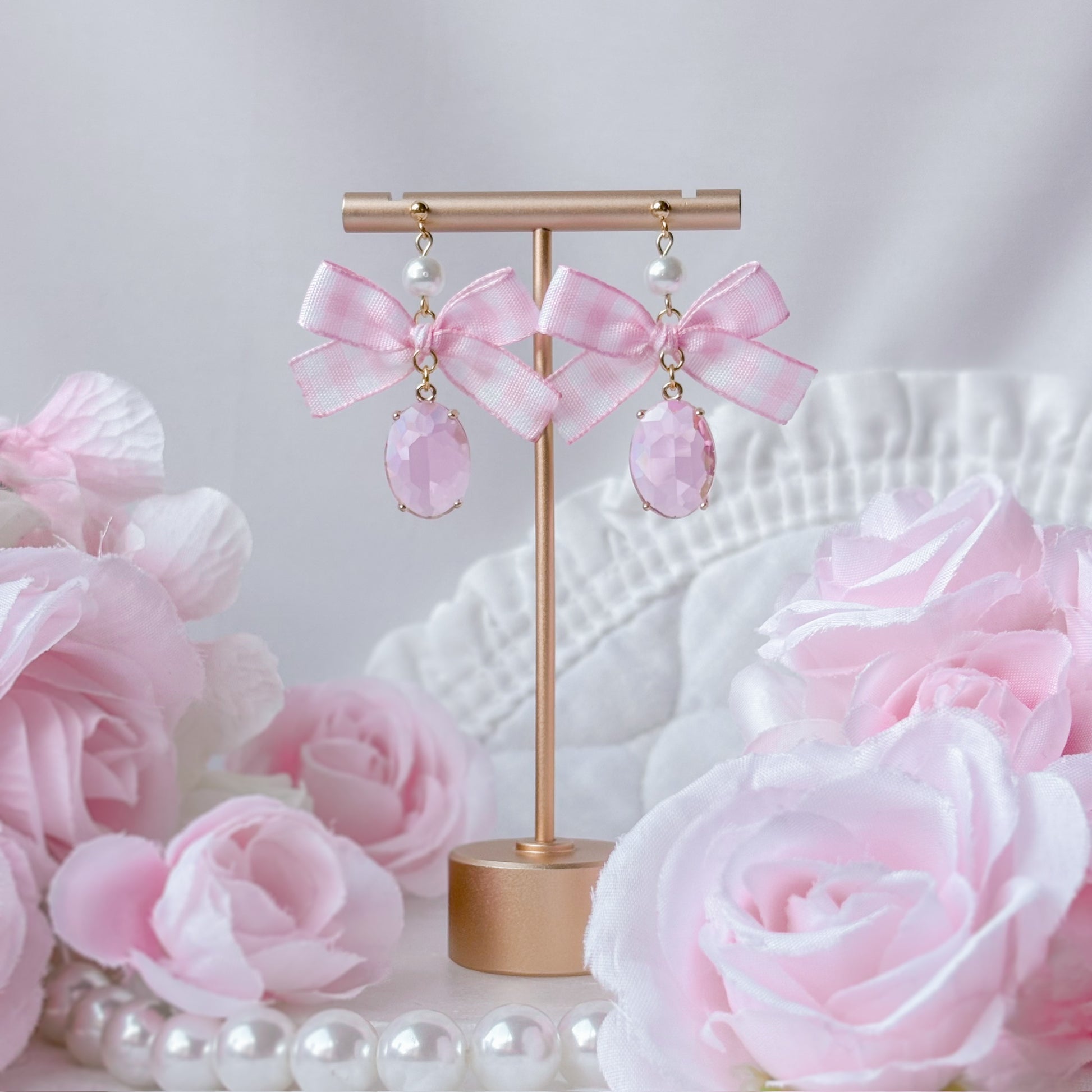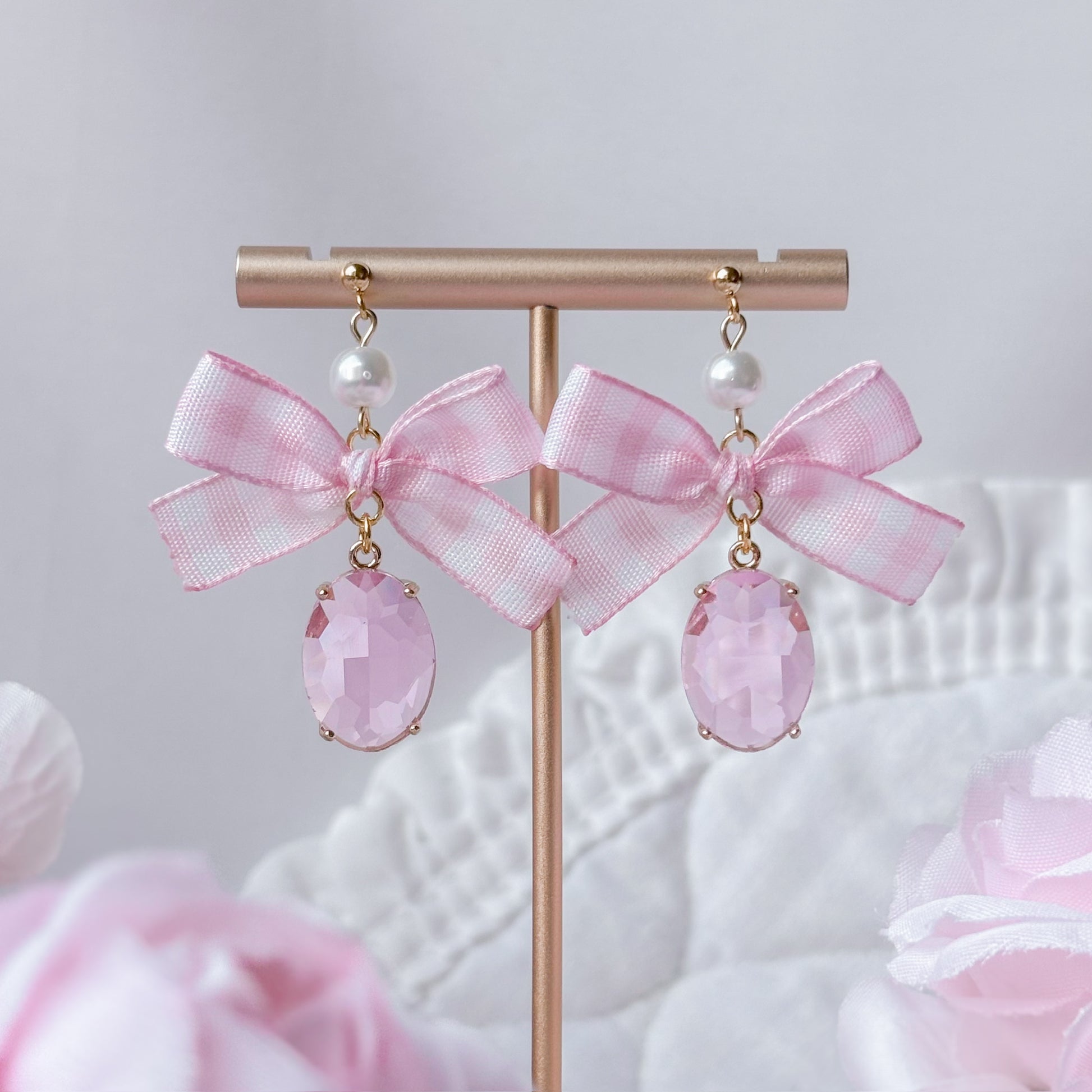 Pink gingham bow earrings.