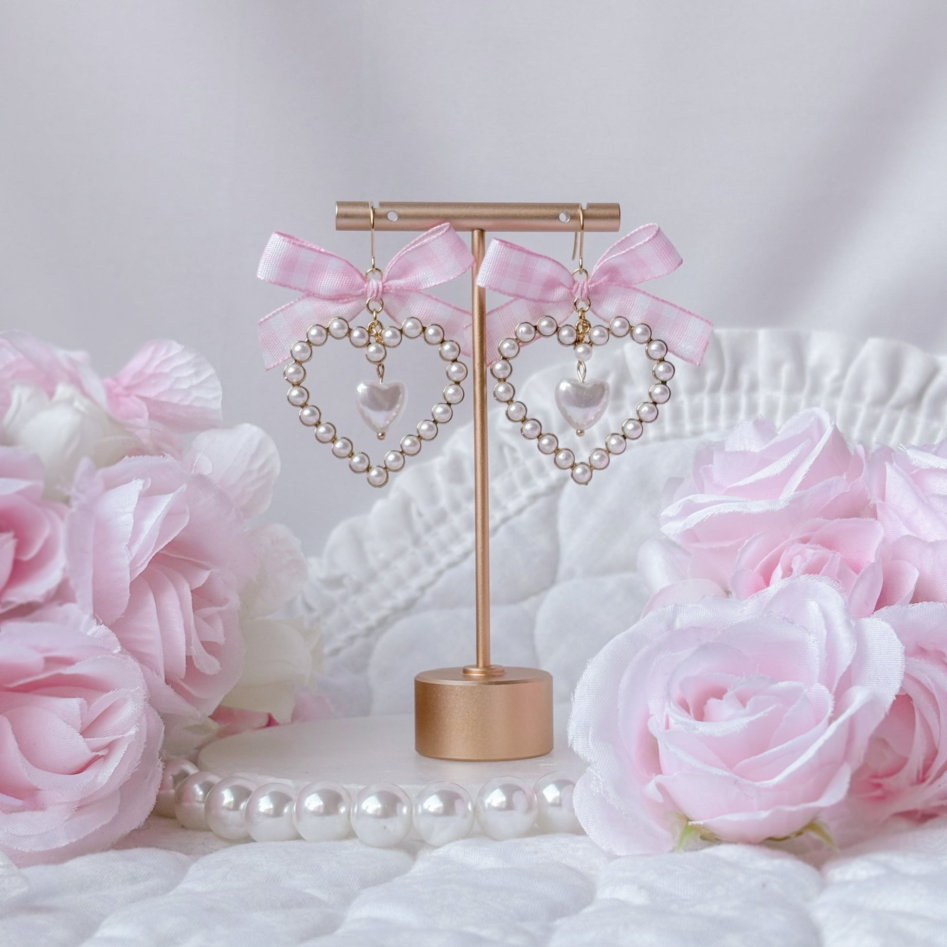 Pink gingham pearl heart earrings.