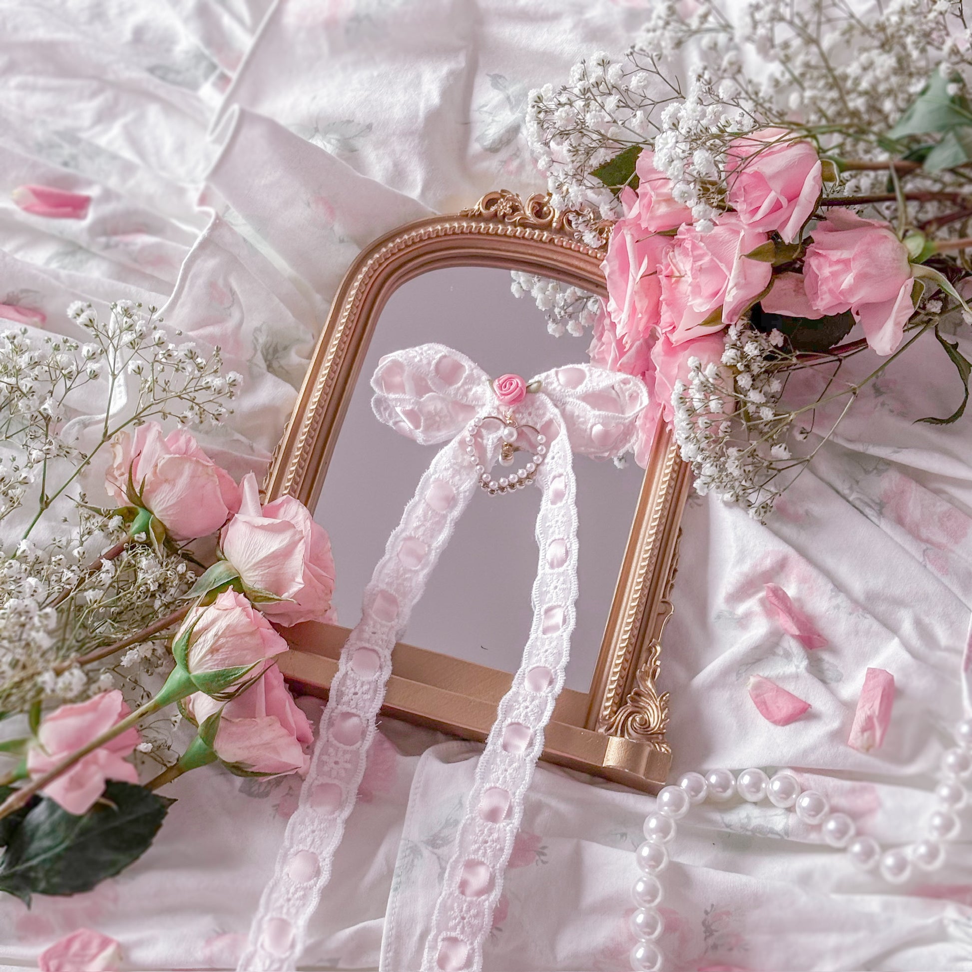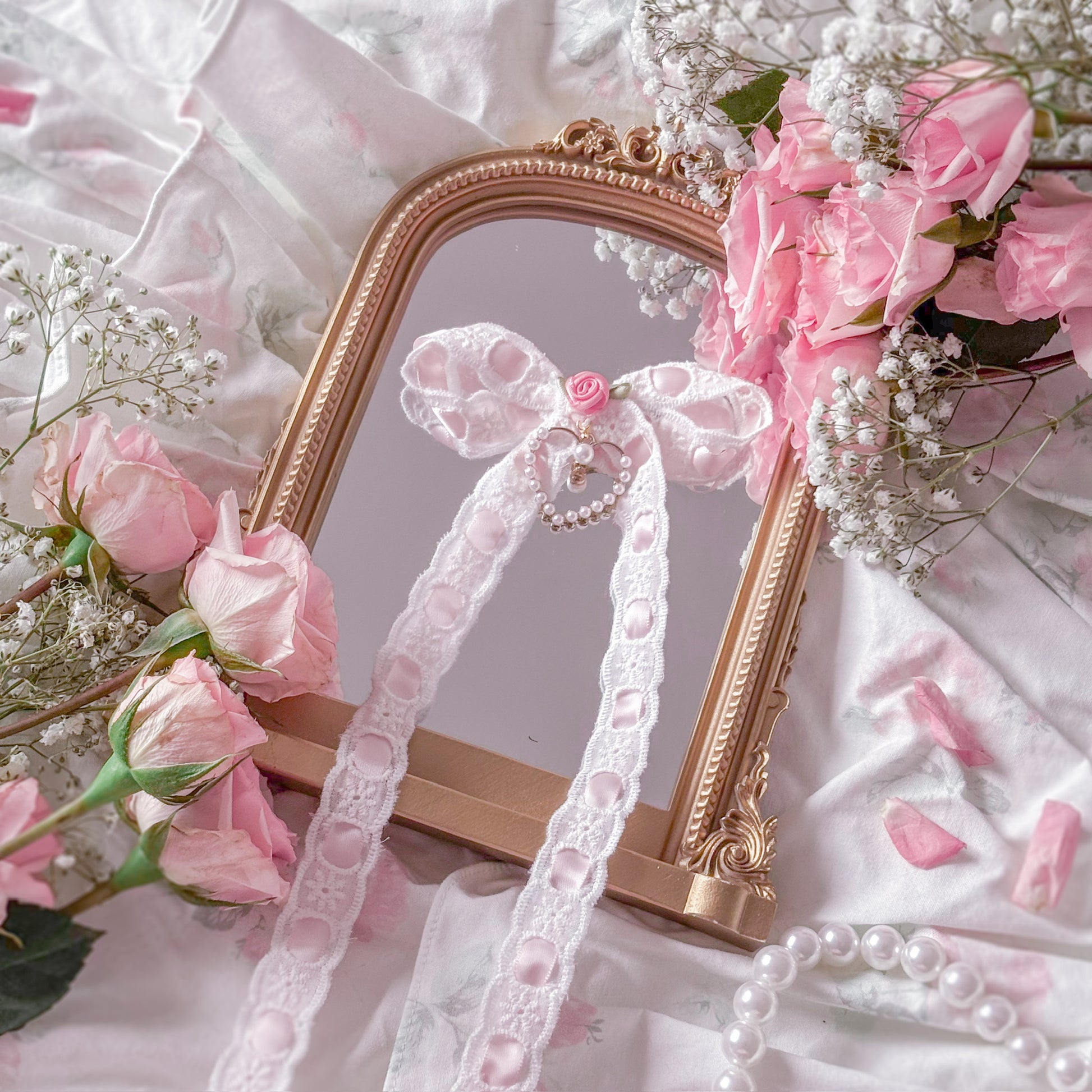 Lace hair bow with pearl heart.