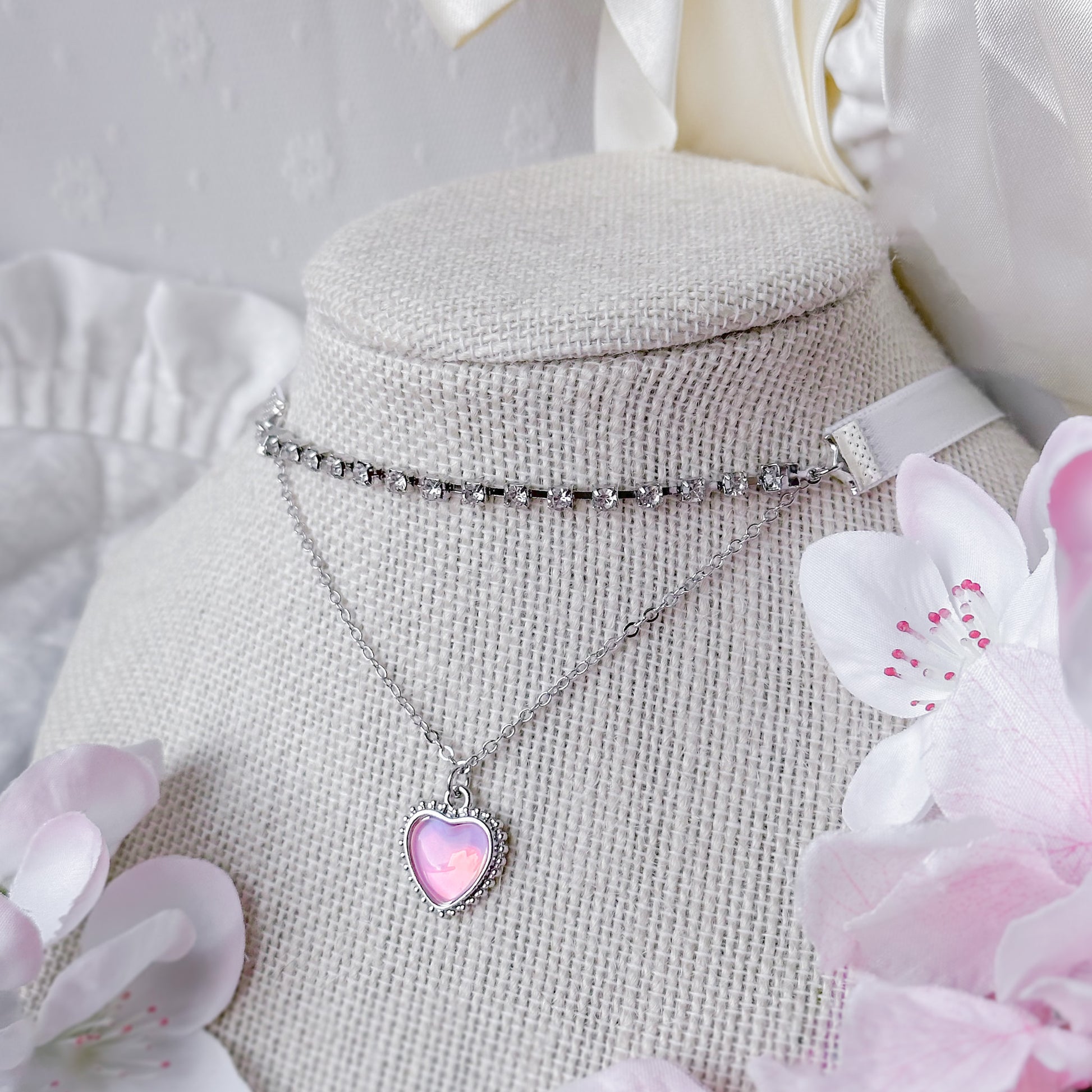 Satin ribbon choker with silver accents.