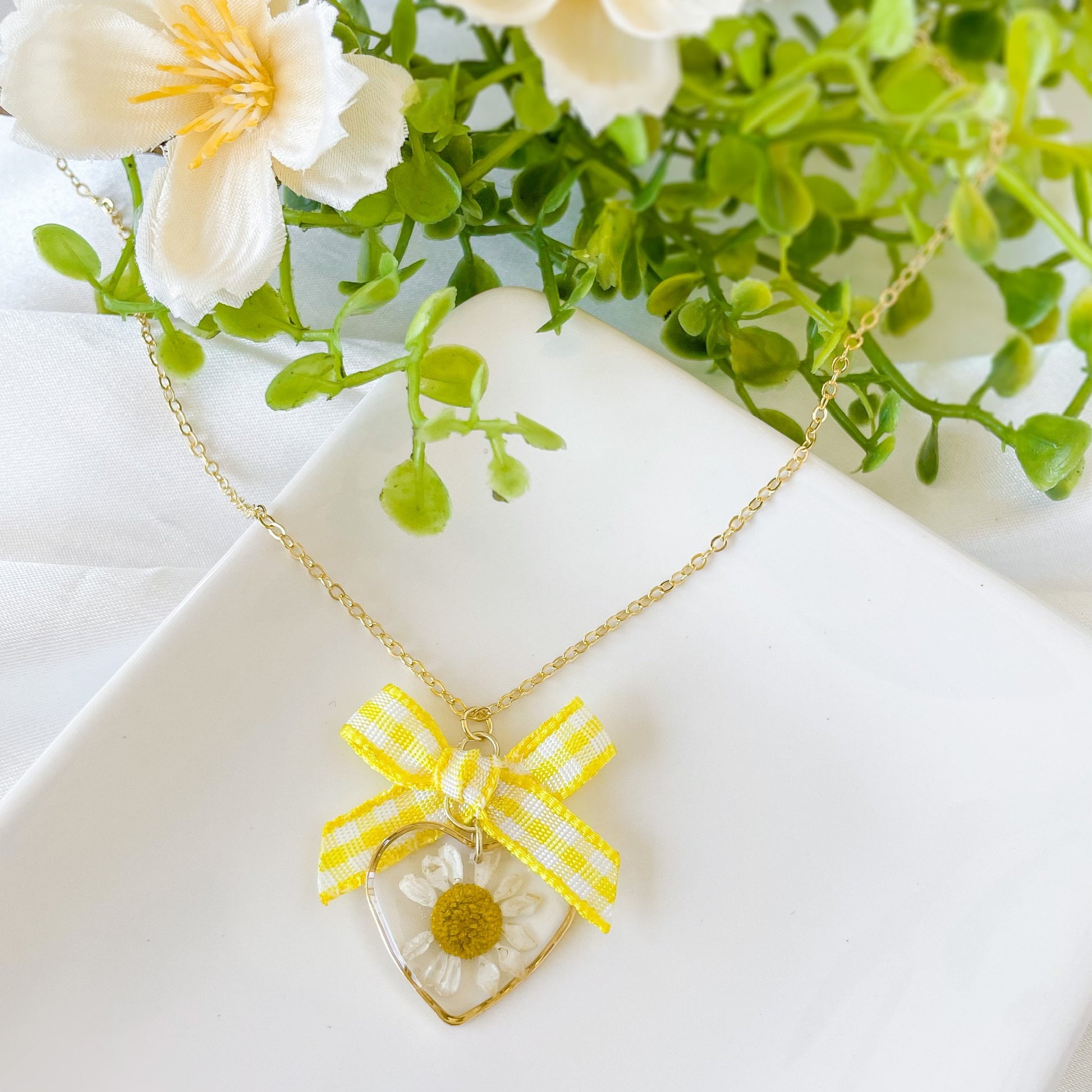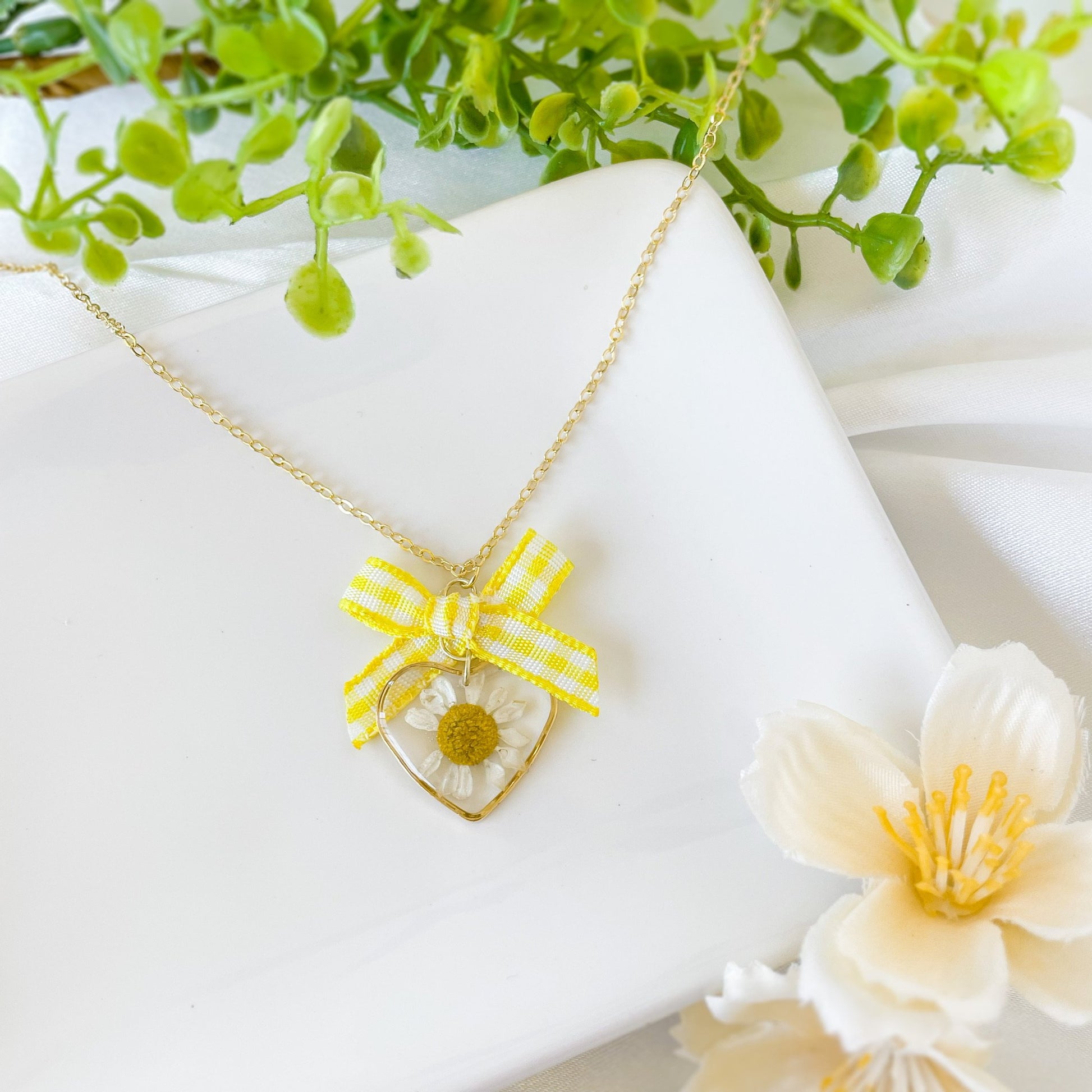 Chamomile necklace with satin yellow gingham.